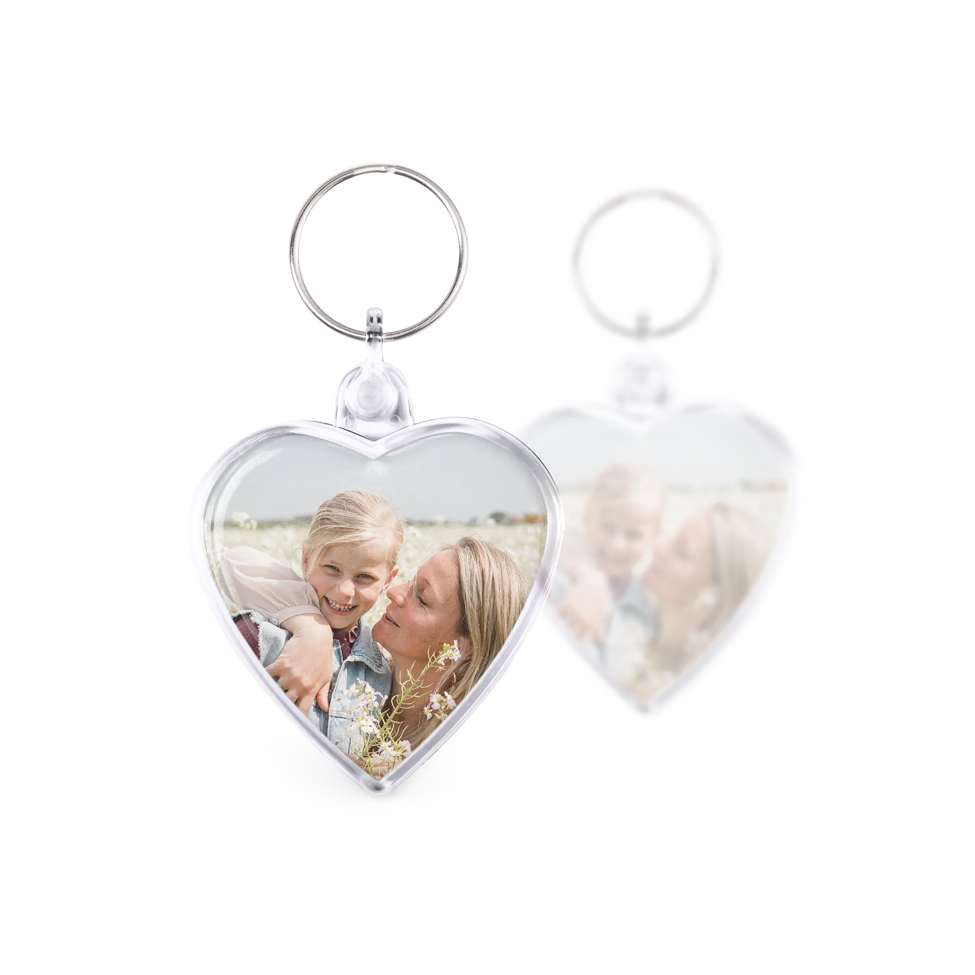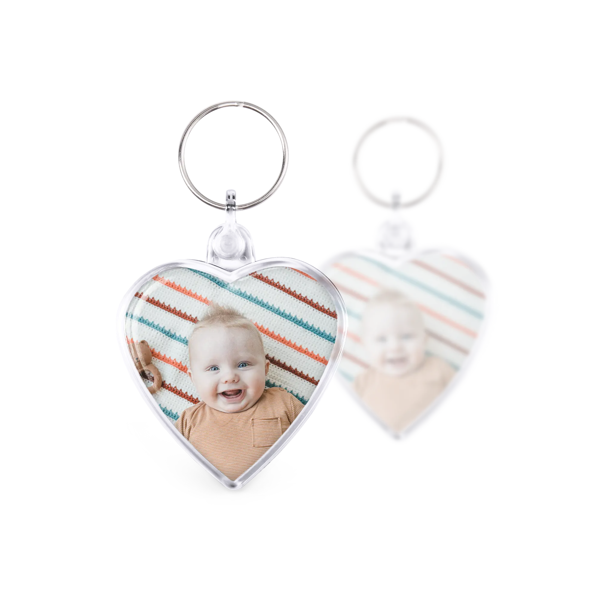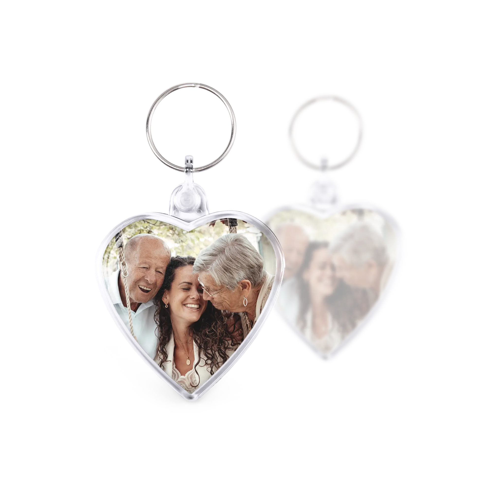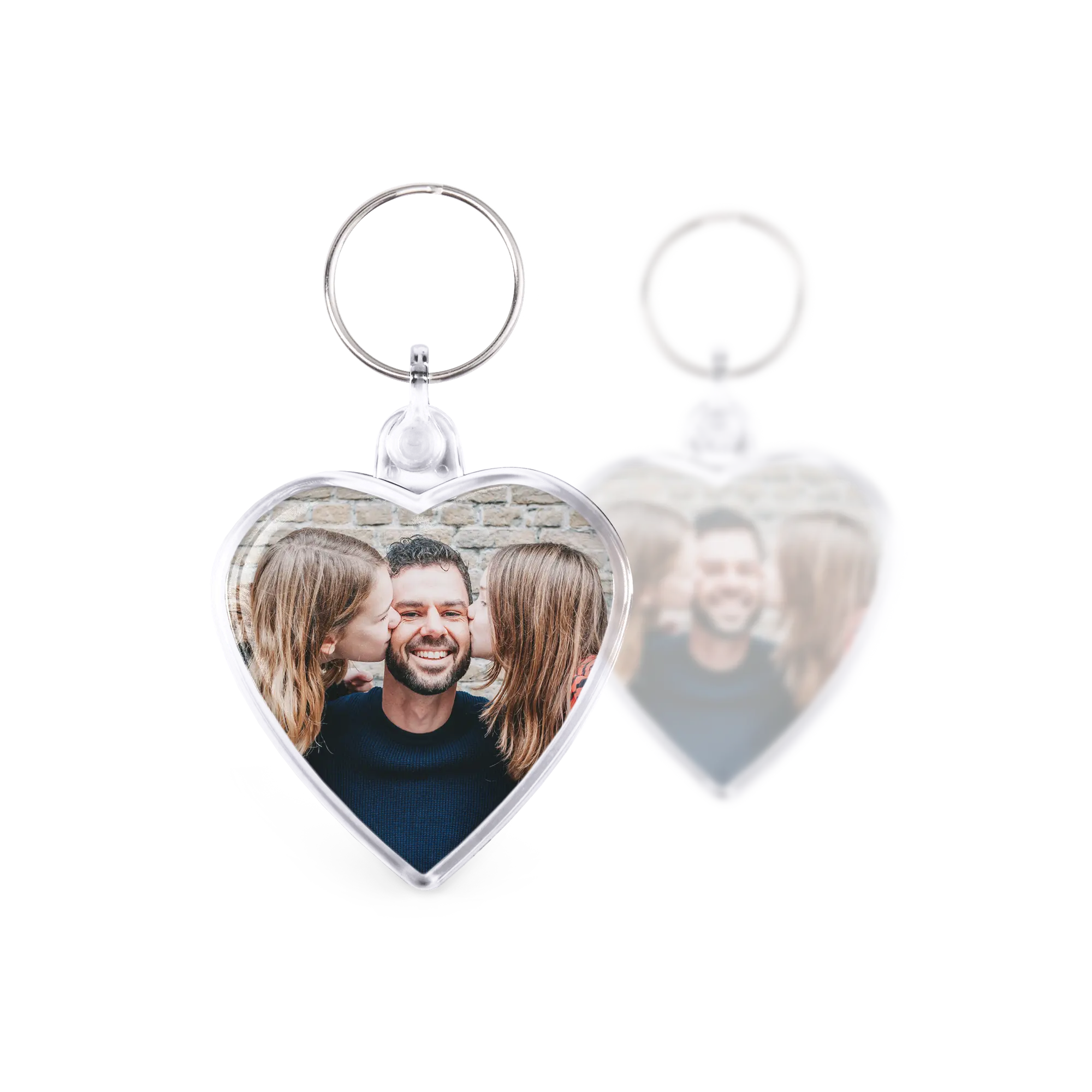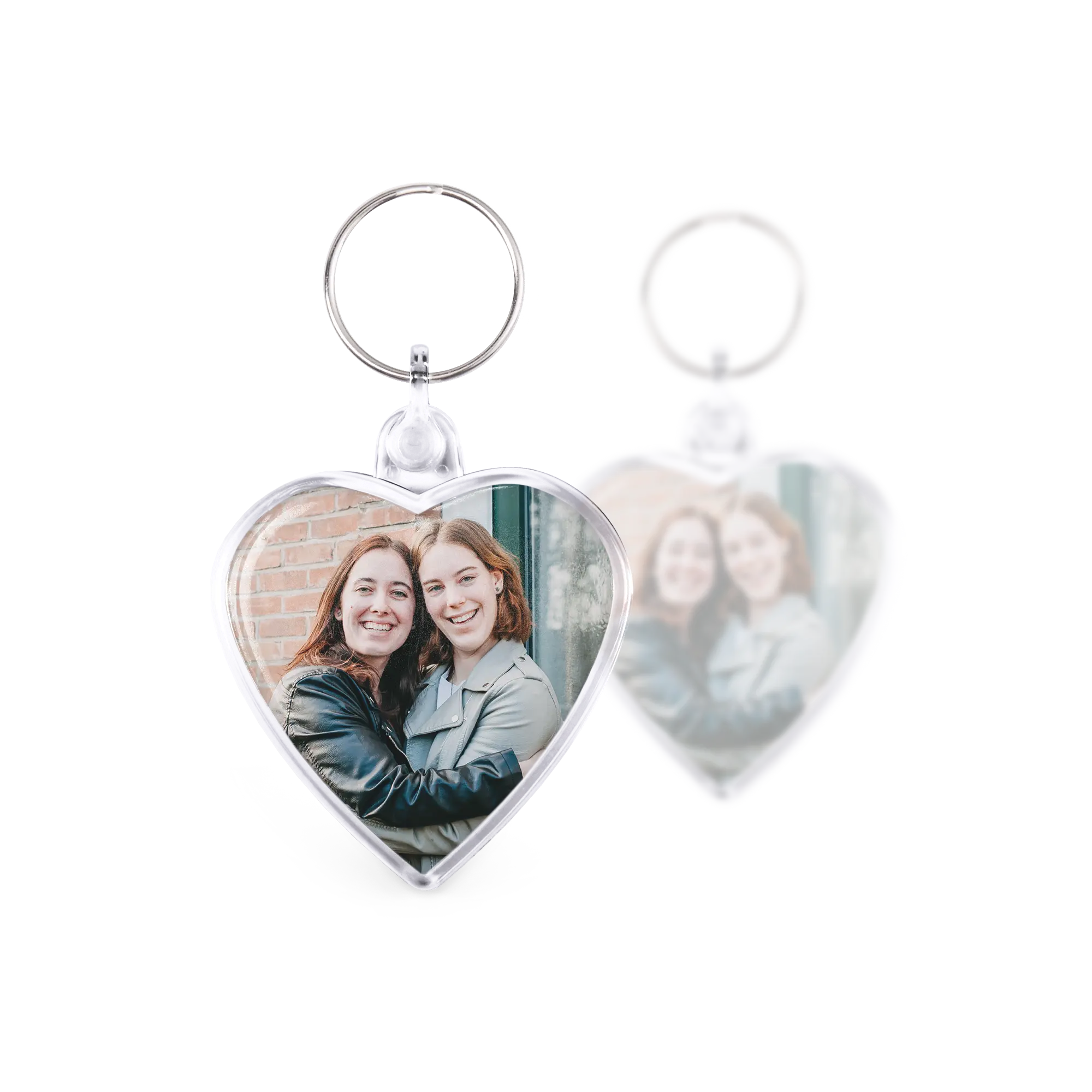Sevgi dolu bir kalp şeklinde anahtarlık, her iki tarafında da sizin fotoğrafınızla. Özel anlar için harika bir hediye!