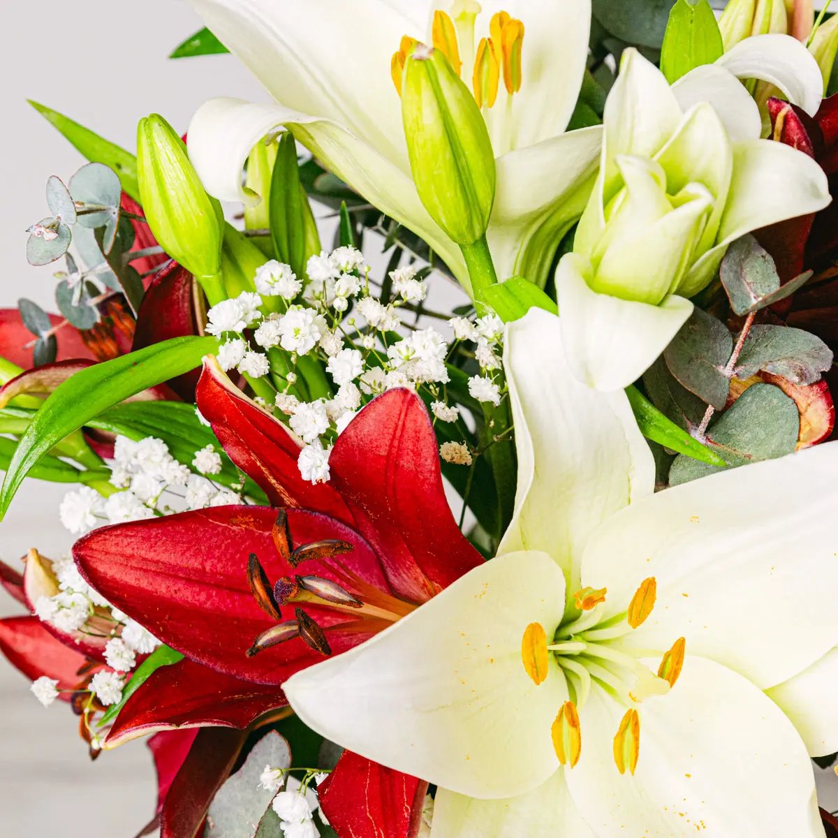 Kırmızı zambaklar tutkuyu ve derin sevgiyi simgeler. Bu buket, herhangi bir mekanı cazibe ve sıcaklıkla dolduracak görsel bir şölen sunar. Sevdiklerinize unutulmaz bir deneyim yaşatın.