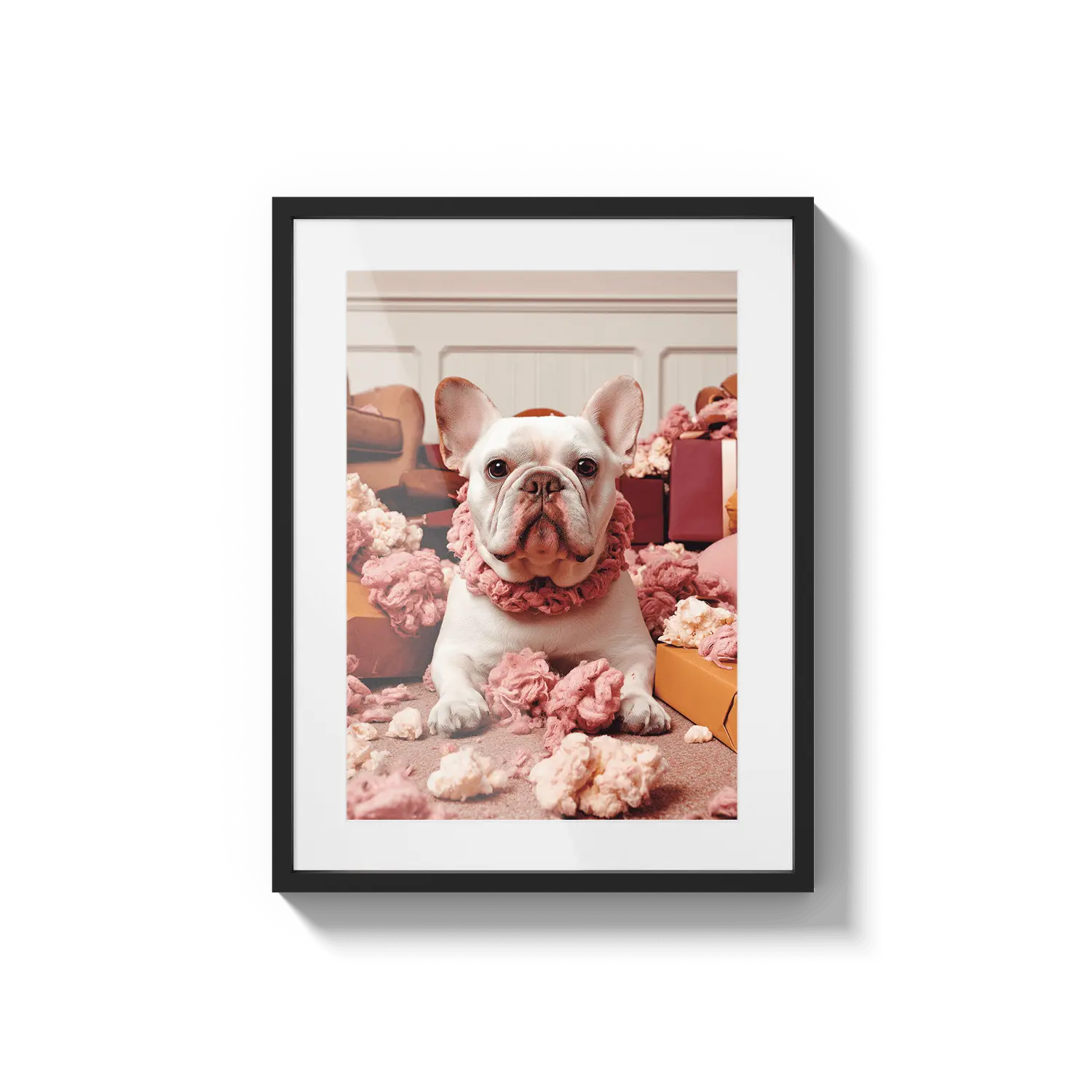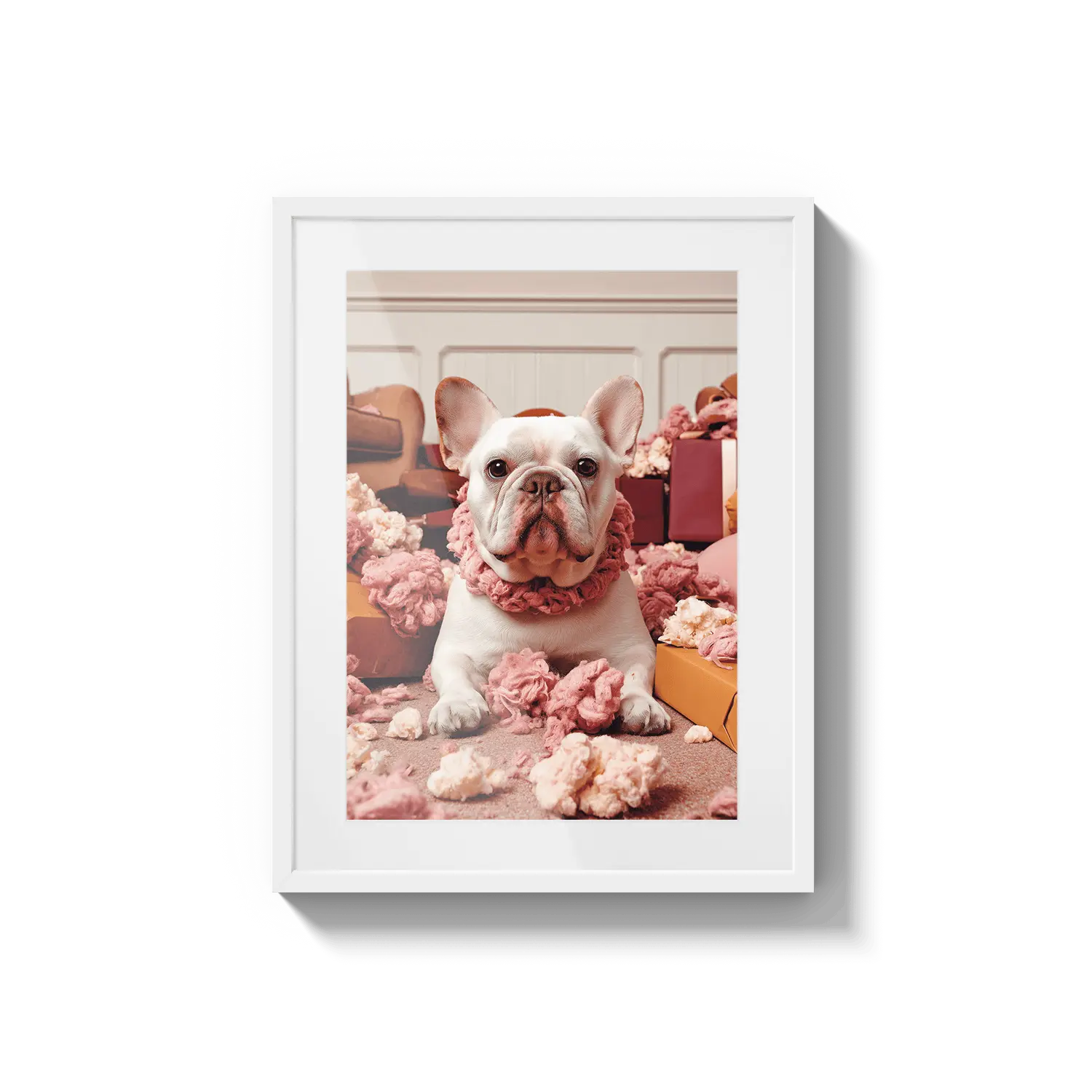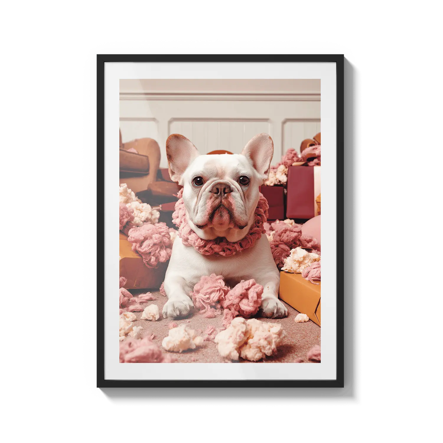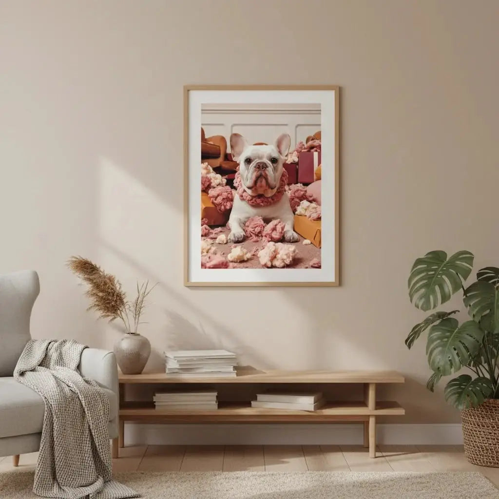 Yumuşak pembe çiçeklerle çevrili tatlı bir buldog, şefkat ve biraz da oyunbazlık sunuyor. Büyüleyici ve sıcak bir hediye.
