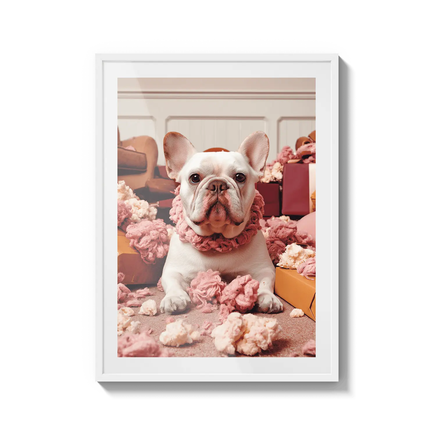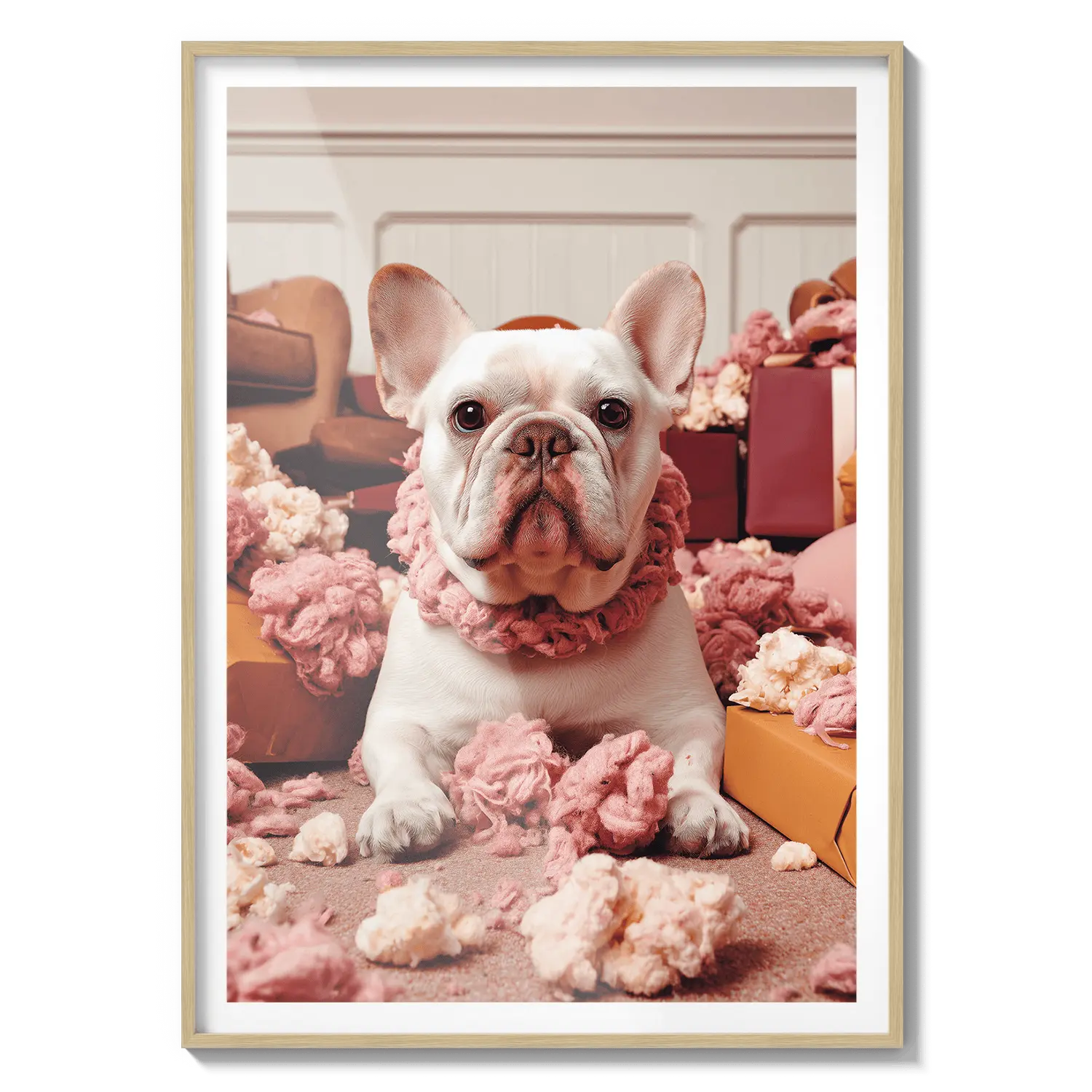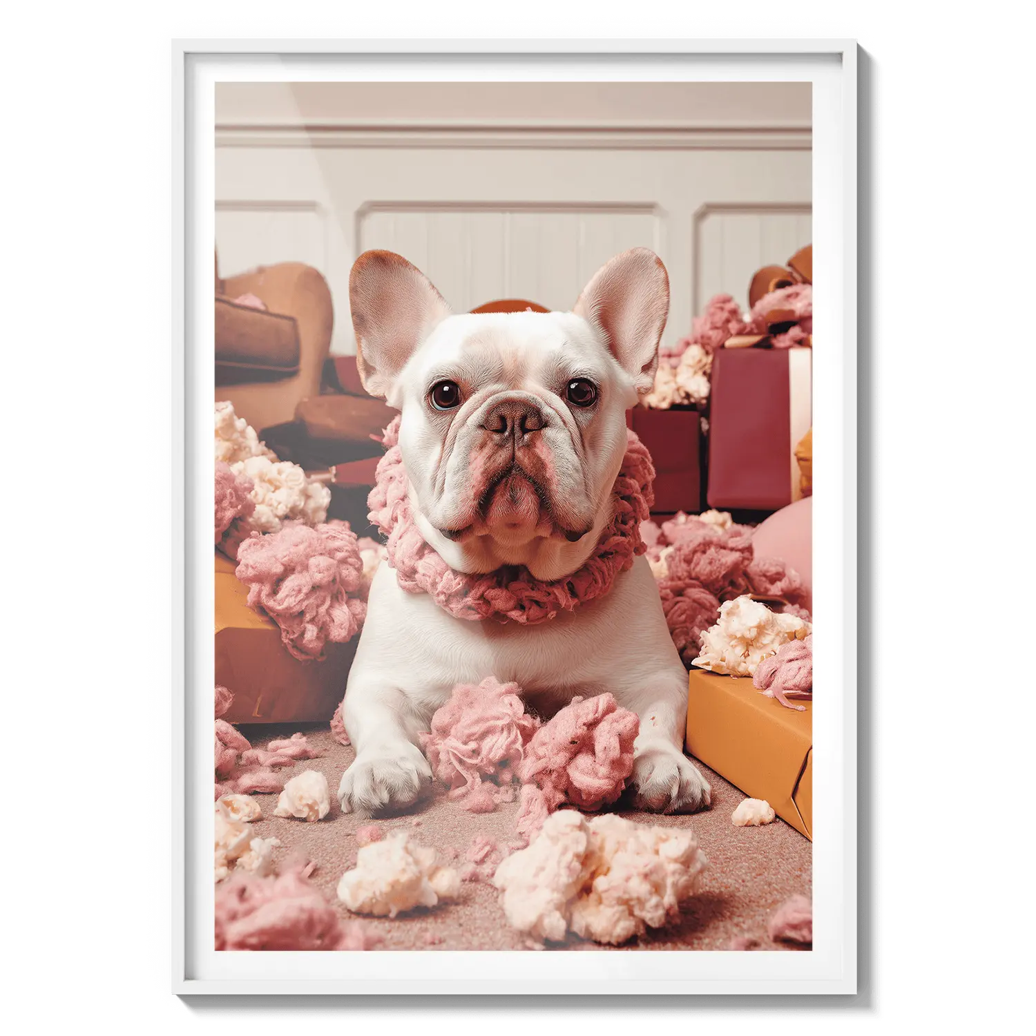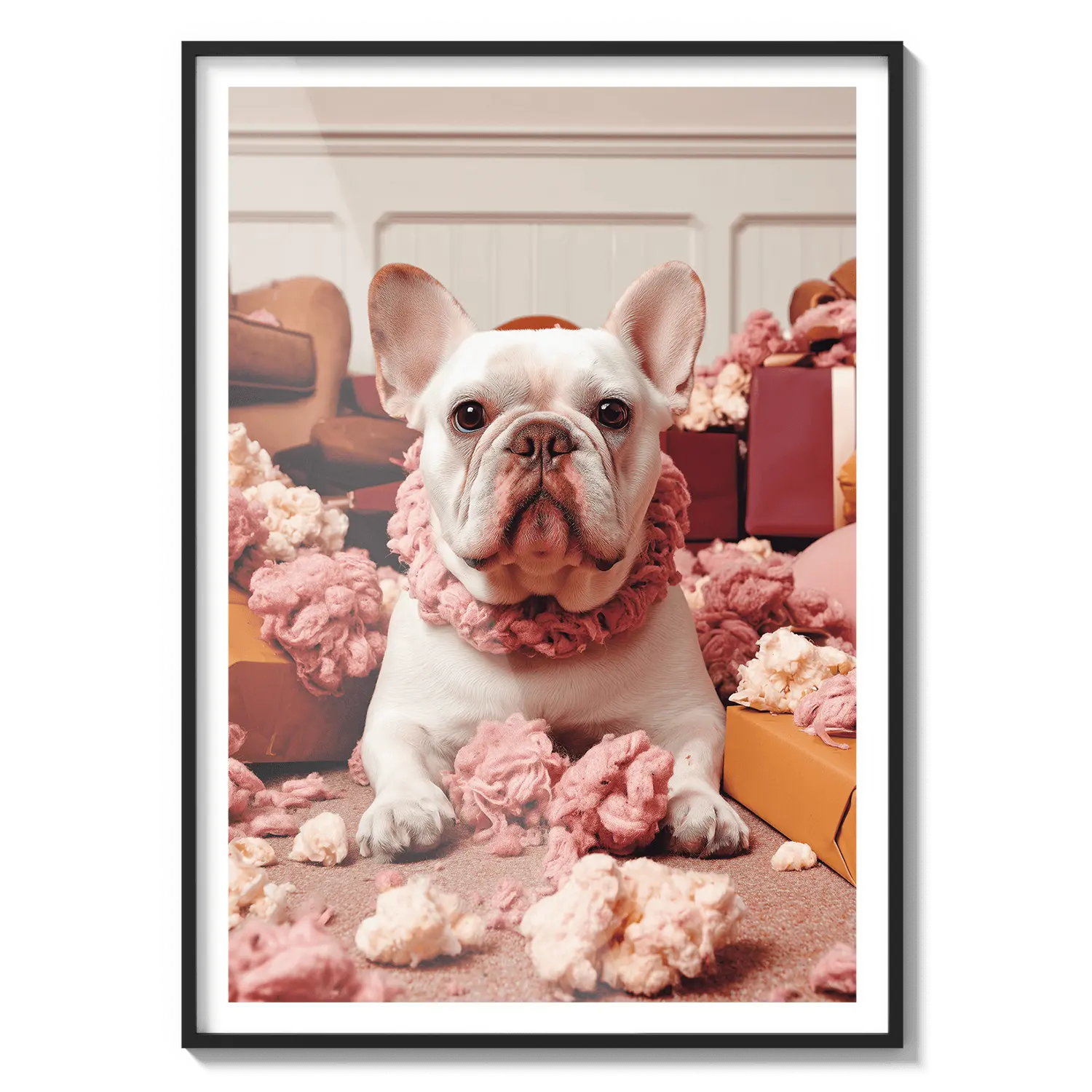 Yumuşak pembe çiçeklerle çevrili tatlı bir buldog, şefkat ve biraz da oyunbazlık sunuyor. Büyüleyici ve sıcak bir hediye.