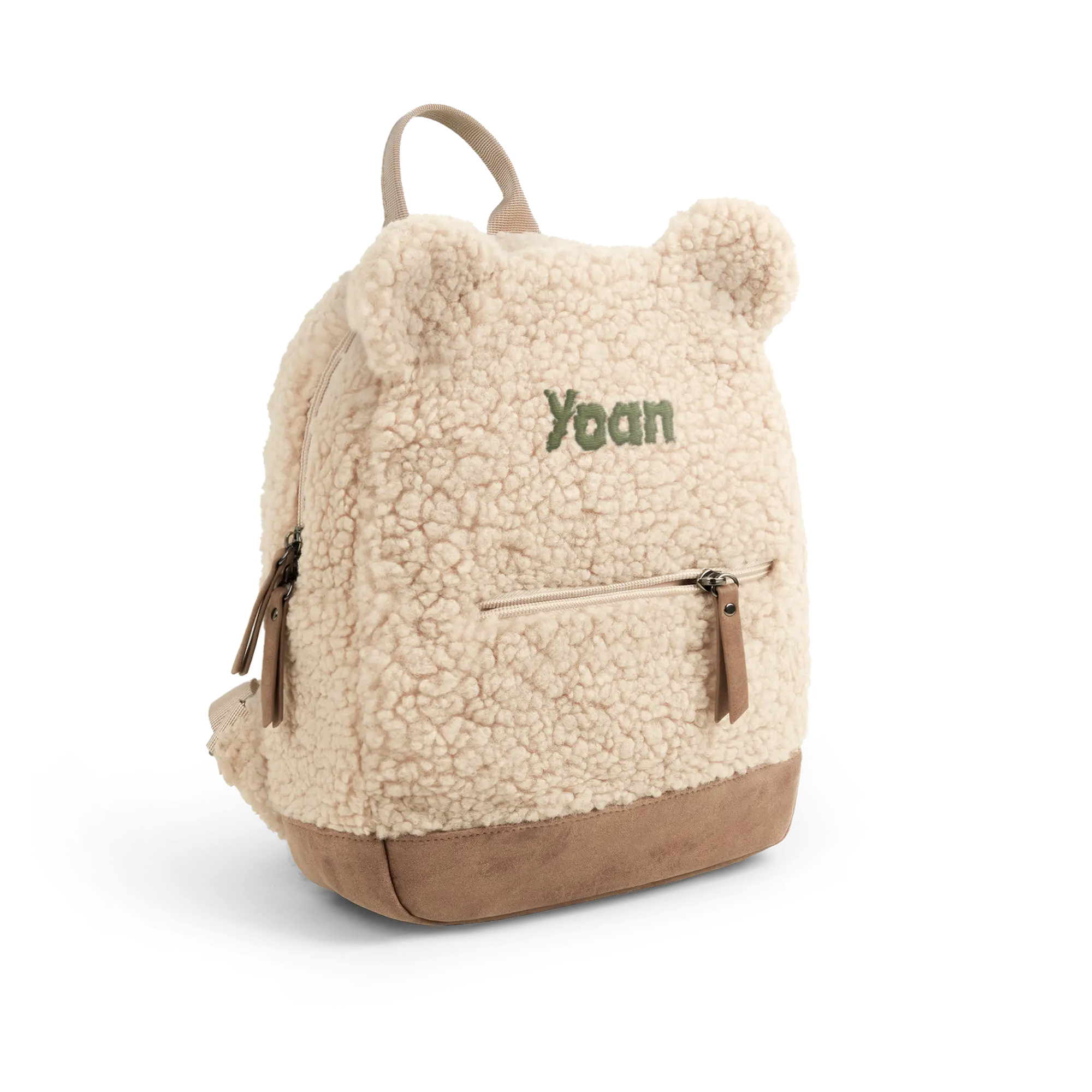 Bej renkli sırt çantası (31 x 25 x 8 cm), %100 polyester, kişiye özel isim/metin işlemeli.