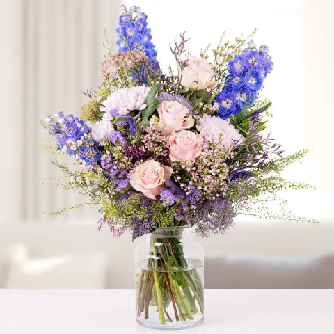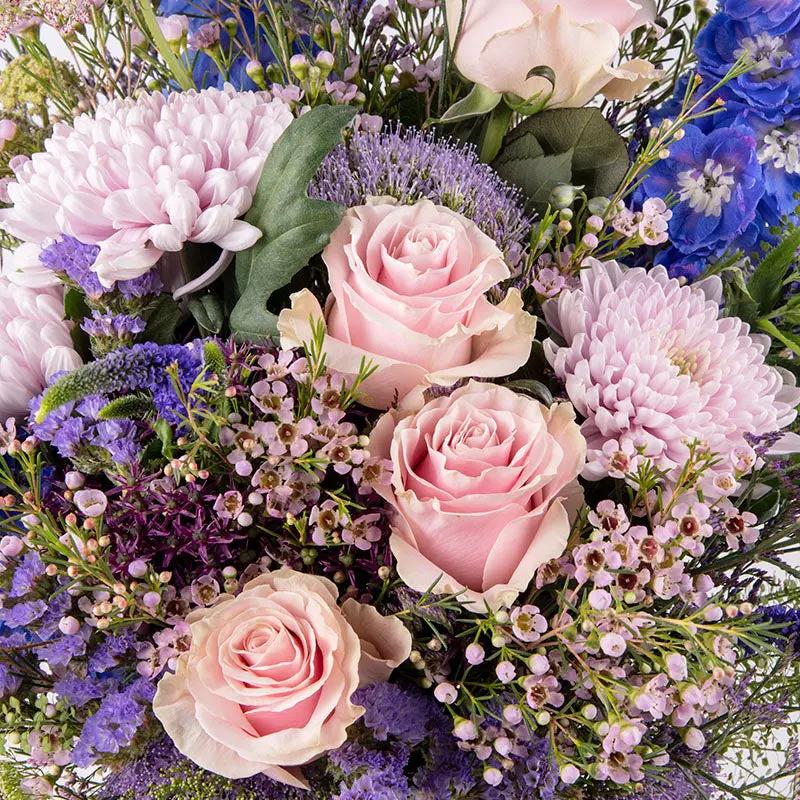 Özel sürprizler düşünülerek tasarlanmış, eşsiz bir aranjman. Yoğun mavi larkspur'lar göz alıcı bir şekilde dikkat çekiyor ve kesinlikle baş döndürüyor. Delphinium olarak da bilinen bu bitki, yunus şeklindeki çiçekleri sayesinde adını almış olup, gerçekten egzotik ve büyük bir arzu ile beklenen bir çiçek. Mor limonium'un ince sapları, aranjmana nazik ve hafif vahşi bir dokunuş katarken, zarif güller ve anastasiyalar aranjmana neşeli bir vurgu ekleyerek, dengeli bir büyüleyici his yaratıyor.