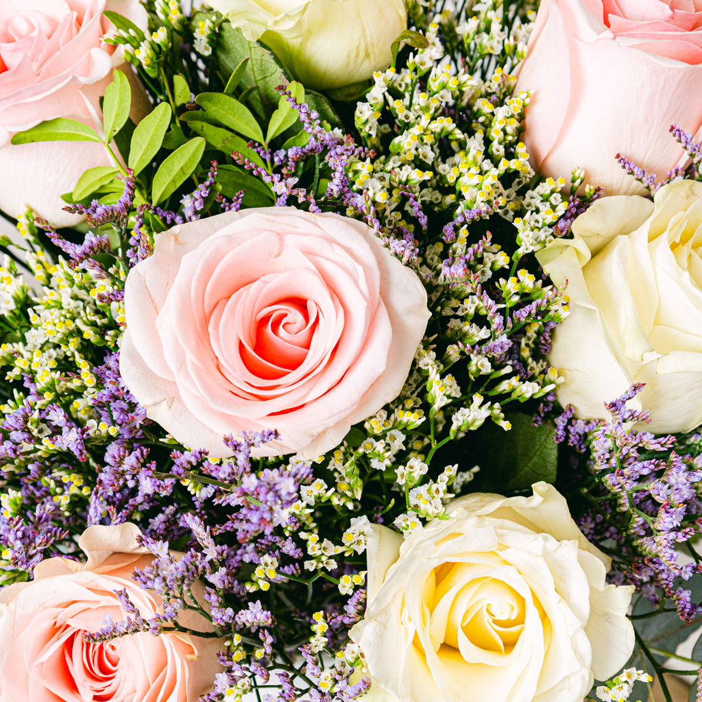 Okaliptüsün taze aroması, etrafındaki herkesin derin bir nefes almasına yardımcı olan arındırıcı bir buket oluşturur. Rahat beyaz ve pembe tonlarındaki gül düzenlemesi, huzuru çağrıştırır ve etrafınızdaki her şeyi, bedeninizin çalışırken çıkardığı neredeyse fark edilmeyen sesleri, güneşle uyum içinde büyüyen bitkileri ve rüzgarla hareket eden kuşları hissetmeye davet eder.