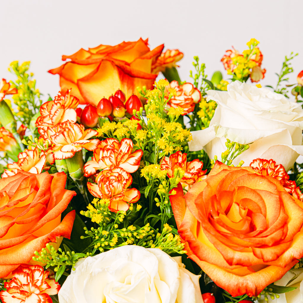 Turuncu güller, beyaz güller, turuncu karanfiller.