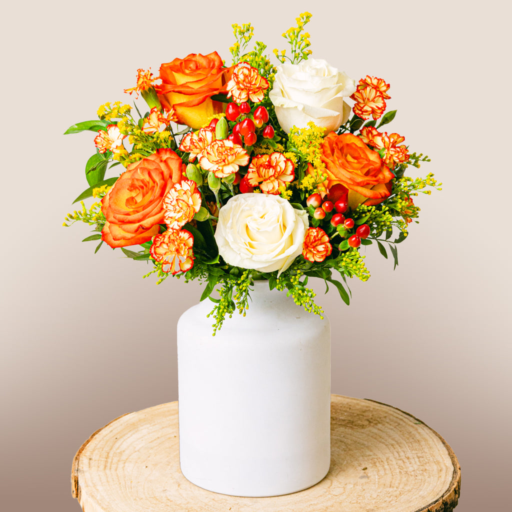 Turuncu renk enerji ve coşkuyu, beyaz renk ise saflığı ve masumiyeti temsil eder. Bu buket, sevdiklerinize sıcak bir gülümseme göndermenin en güzel yoludur.