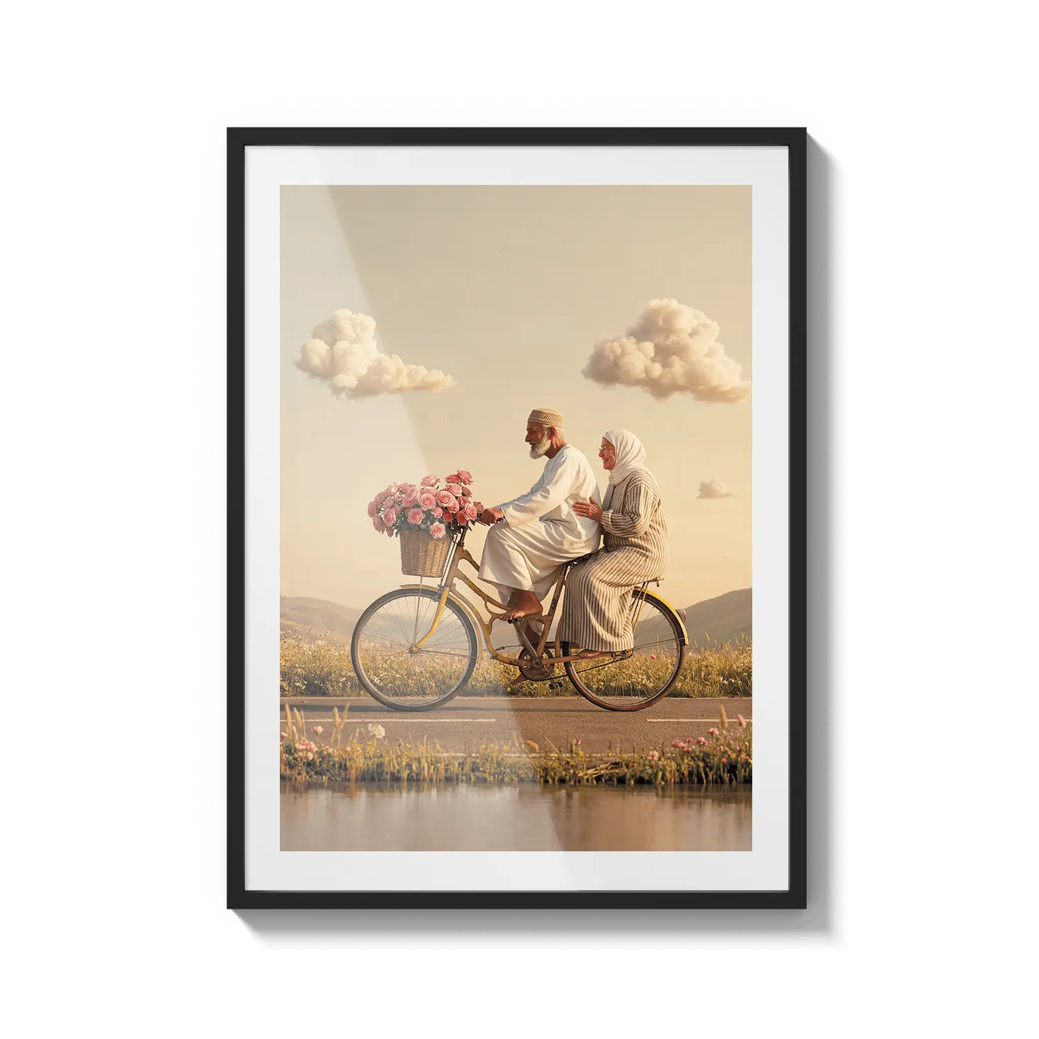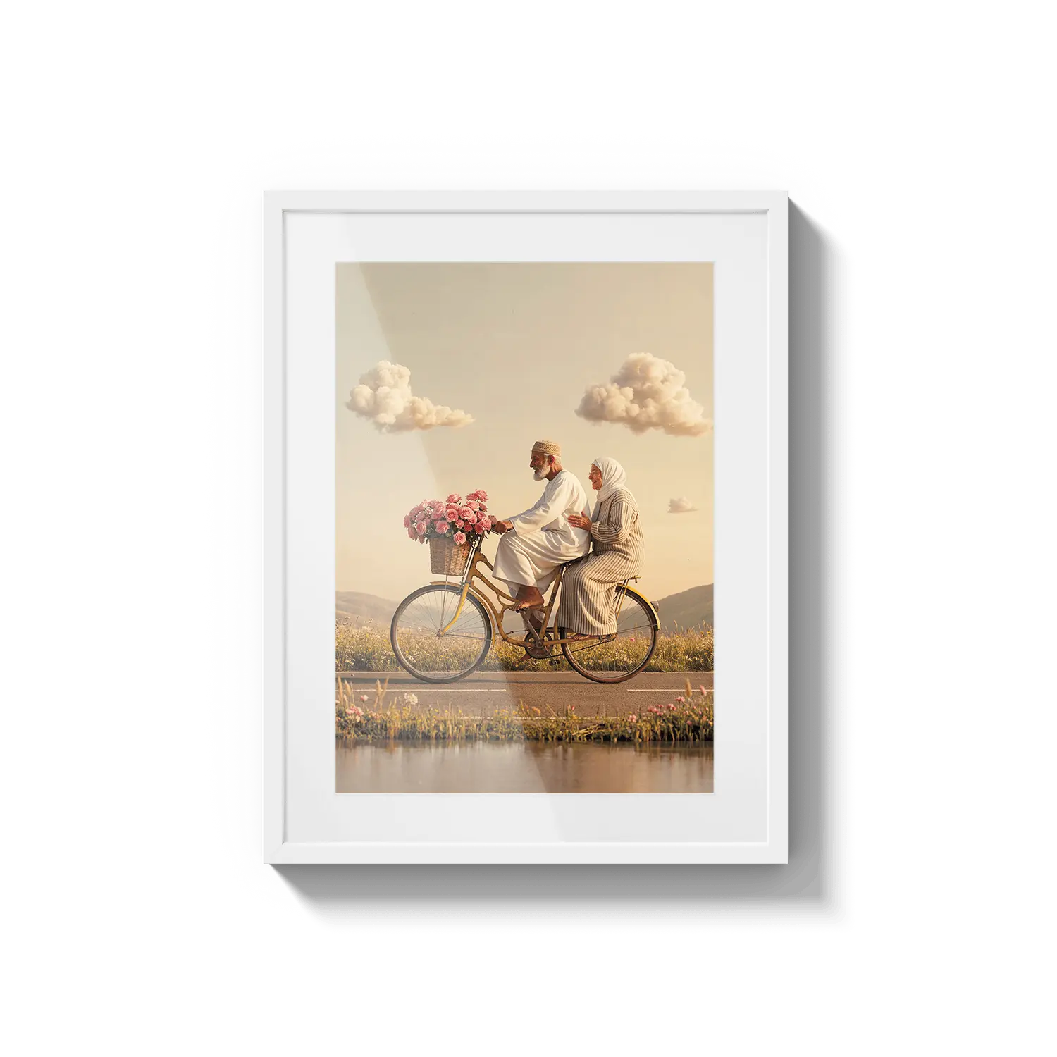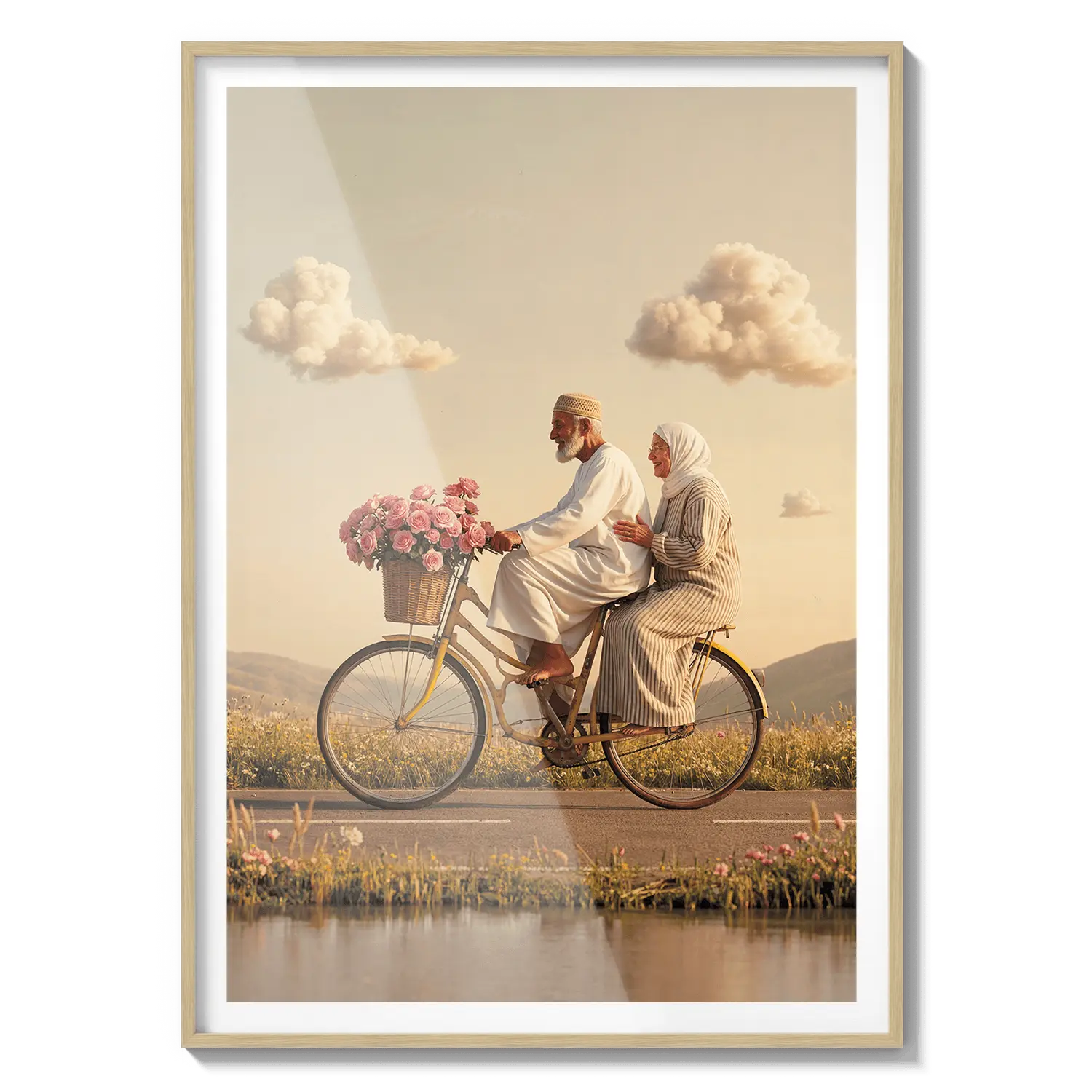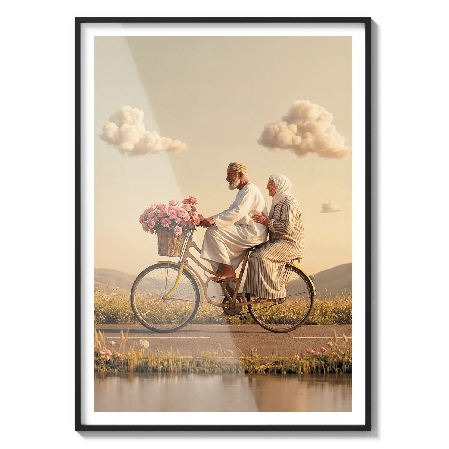 Altın ışıkta bisiklete binen bir çift, arkadaşlığı ve neşeyi çağrıştırıyor. Paylaşılan anları kutlamak için tatlı bir sanat eseri.