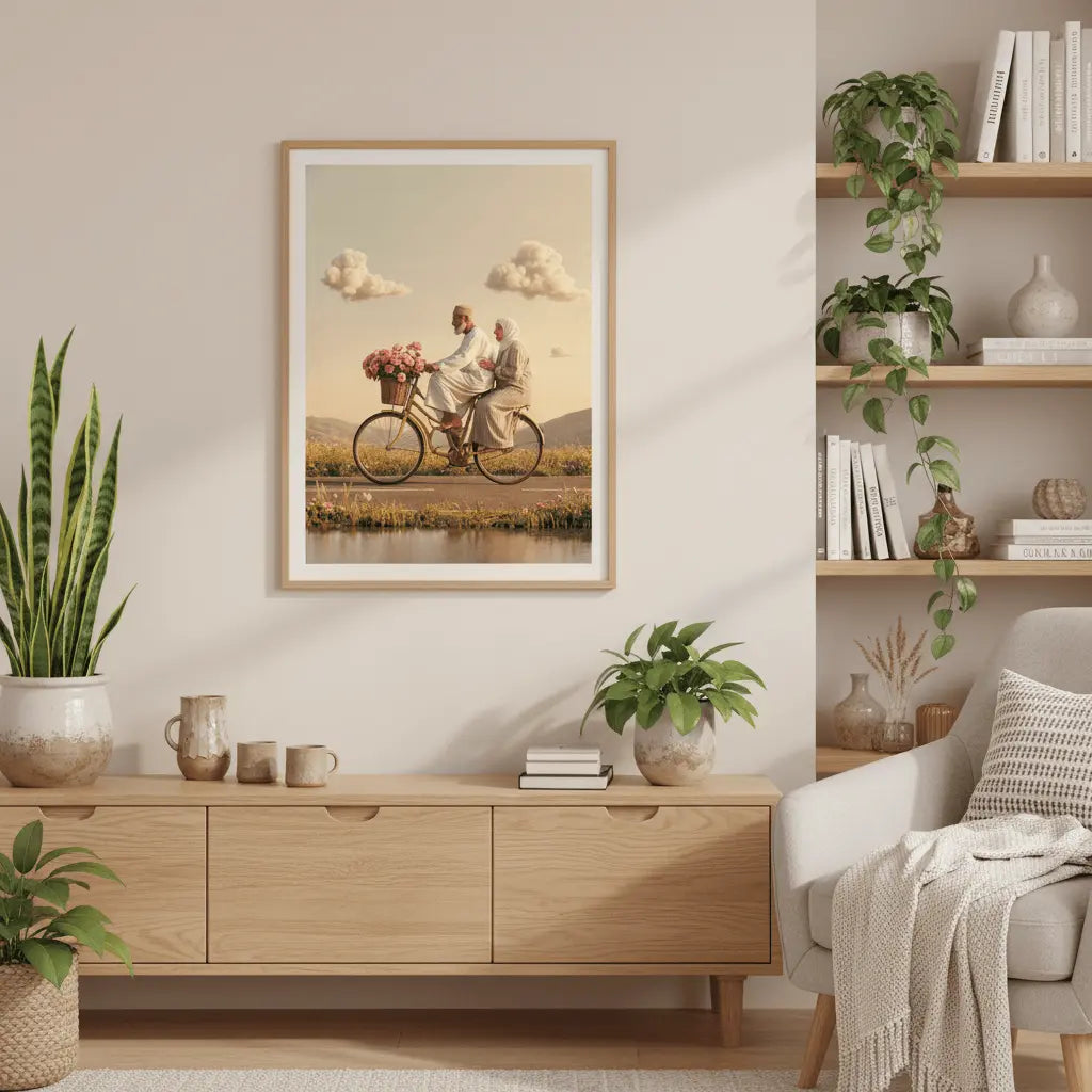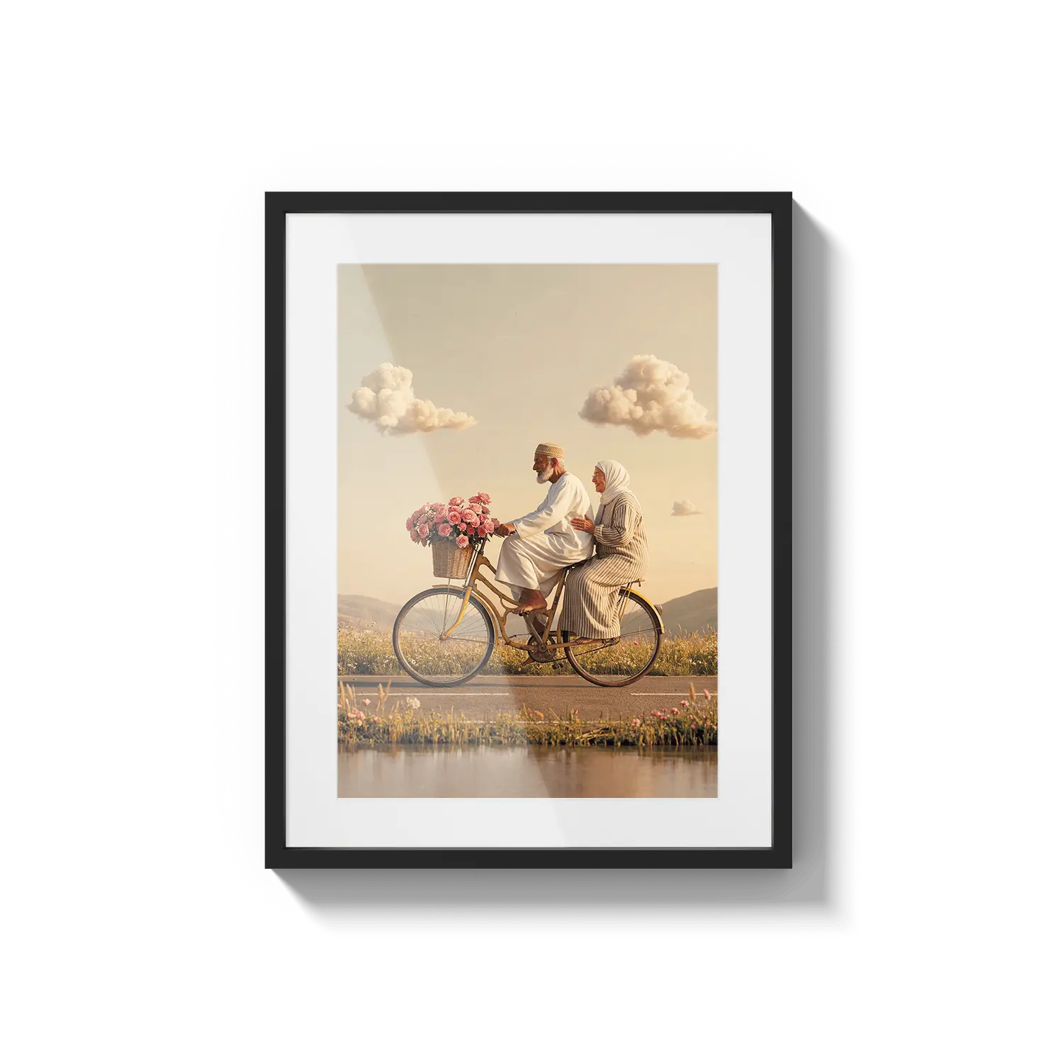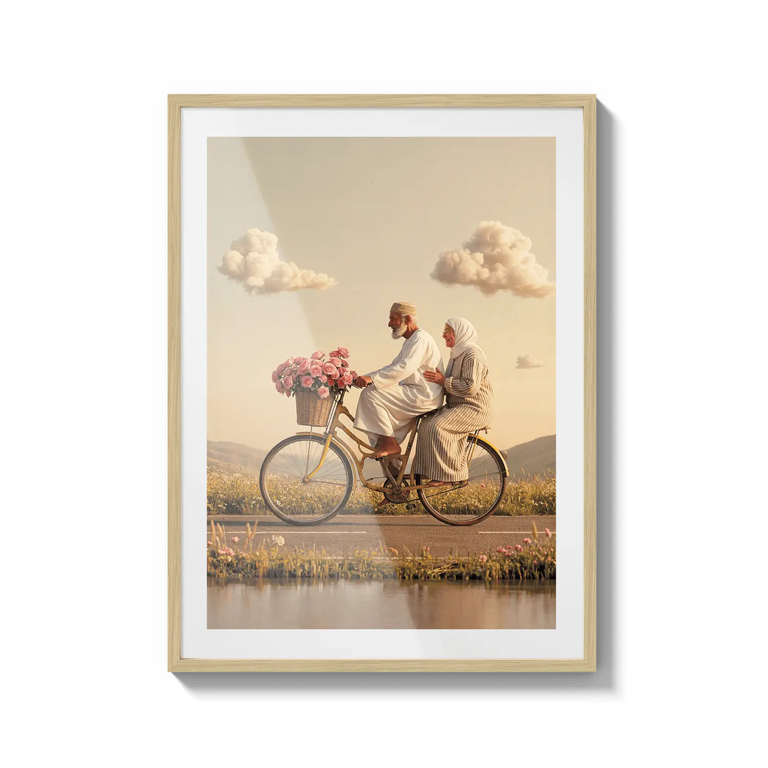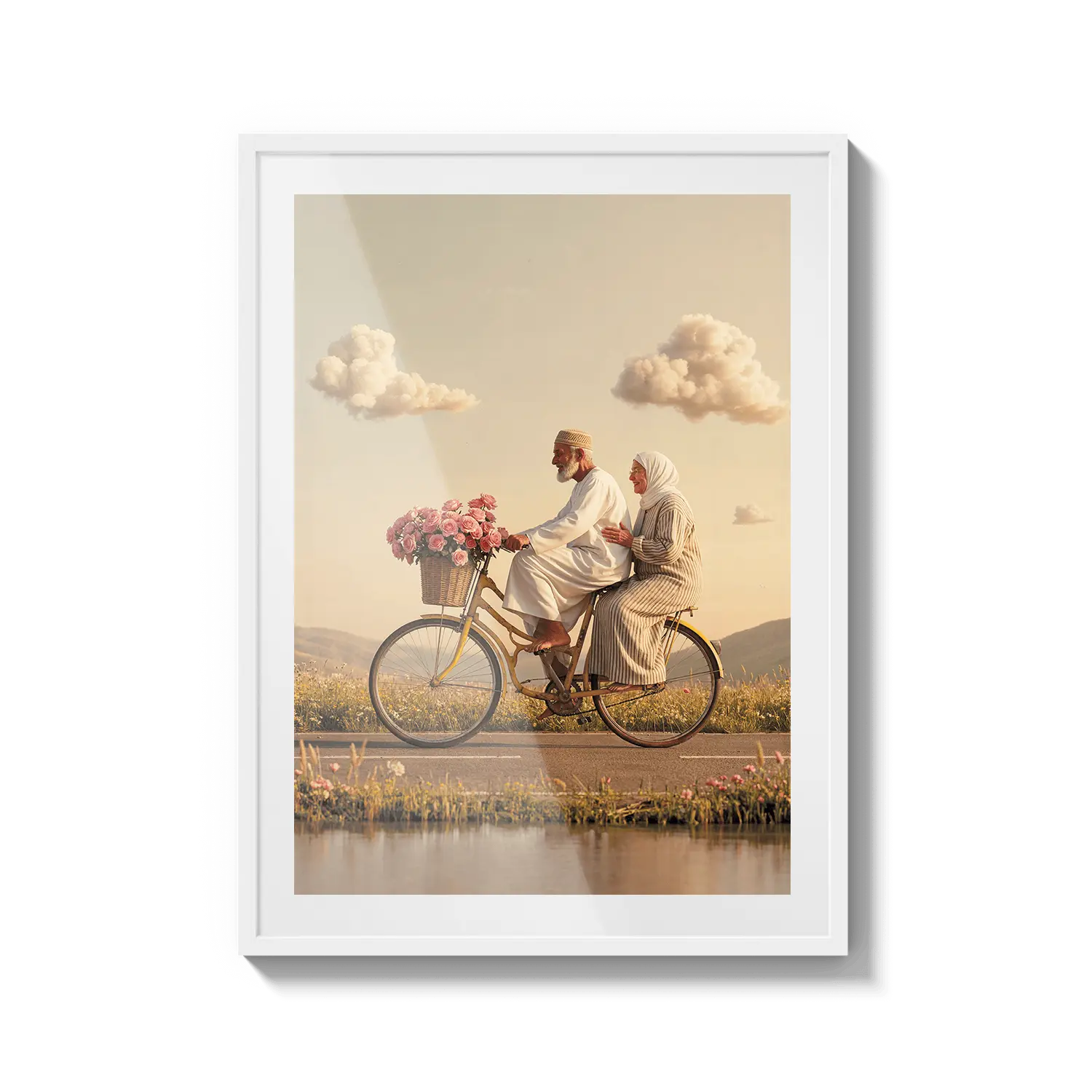 Altın ışıkta bisiklete binen bir çift, arkadaşlığı ve neşeyi çağrıştırıyor. Paylaşılan anları kutlamak için tatlı bir sanat eseri.