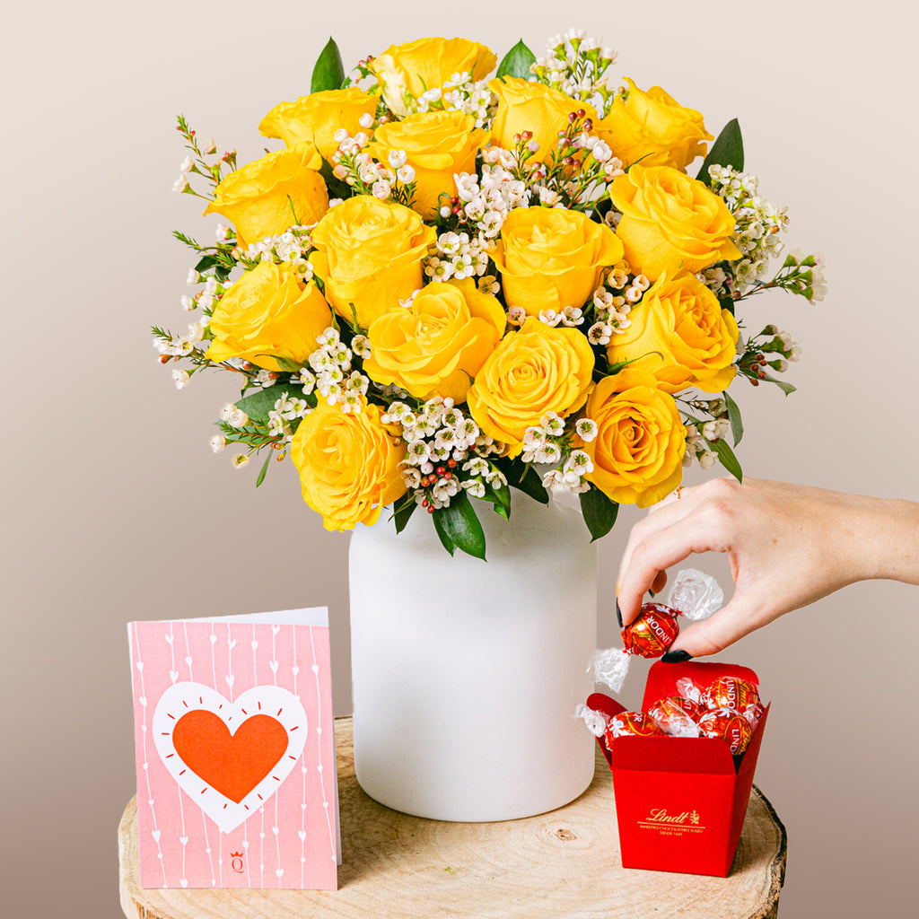 Sarı güllerin enerjisi ve beyaz mum çiçeğinin saflığı bir araya gelerek, pozitif duyguları harekete geçiren ve içten dilekleri ileten mükemmel bir hediye oluşturur.