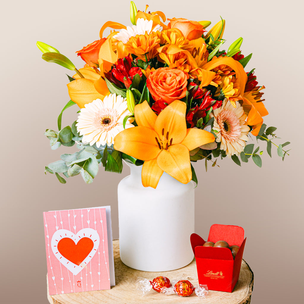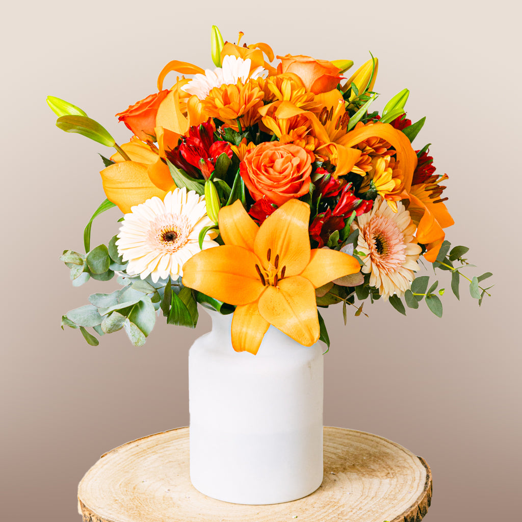 Özel birine, şeftaliyi andıran yumuşak turuncu tonlarında bu tasarımla sürpriz yapın. Güller, zambaklar, gerberalar, krizantemler ve alstromeryalar, bu taze ve aromatik aranjmanı oluşturuyor. Şeftali tonlarını sevenler için mükemmel!