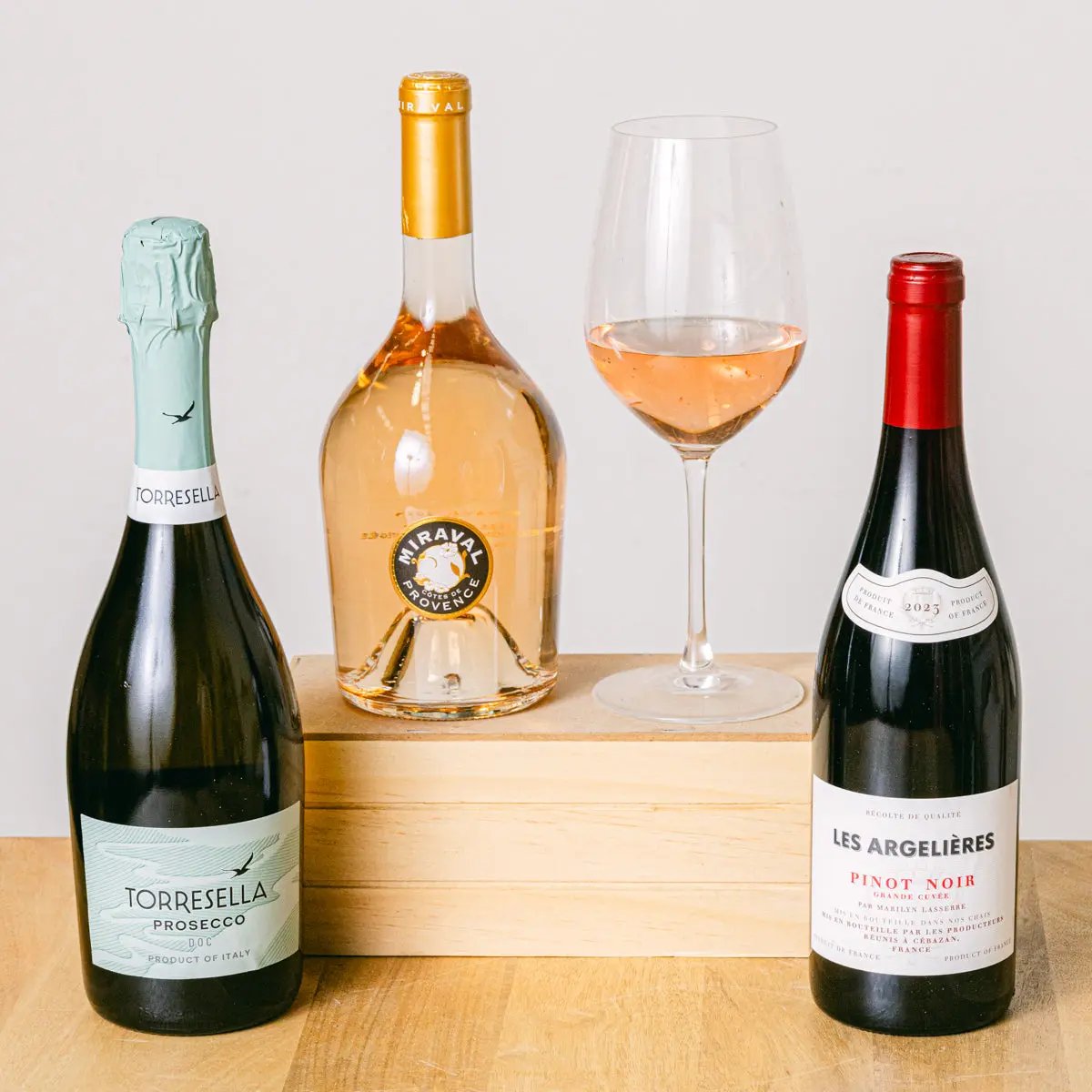 Bu eşsiz setle iyi bir şarabın benzersiz tatlarını hediye edin - damak için karmaşık bir melodi. Hepsini denemeye cesaret edenler için inanılmaz bir kombinasyon: Miraval rosé'deki taze meyve buketinden, Les Argelières kırmızı şarabındaki kırmızı meyve alt tonları ve tütsülenmiş nüanslara kadar. Uzun süre kalan tatlarını Montecillo beyazının taze asiditesiyle karşılaştırın ve şarap tadım seansınızı muhteşem aromatik notalara sahip köpüklü Torresella ile sonlandırın.