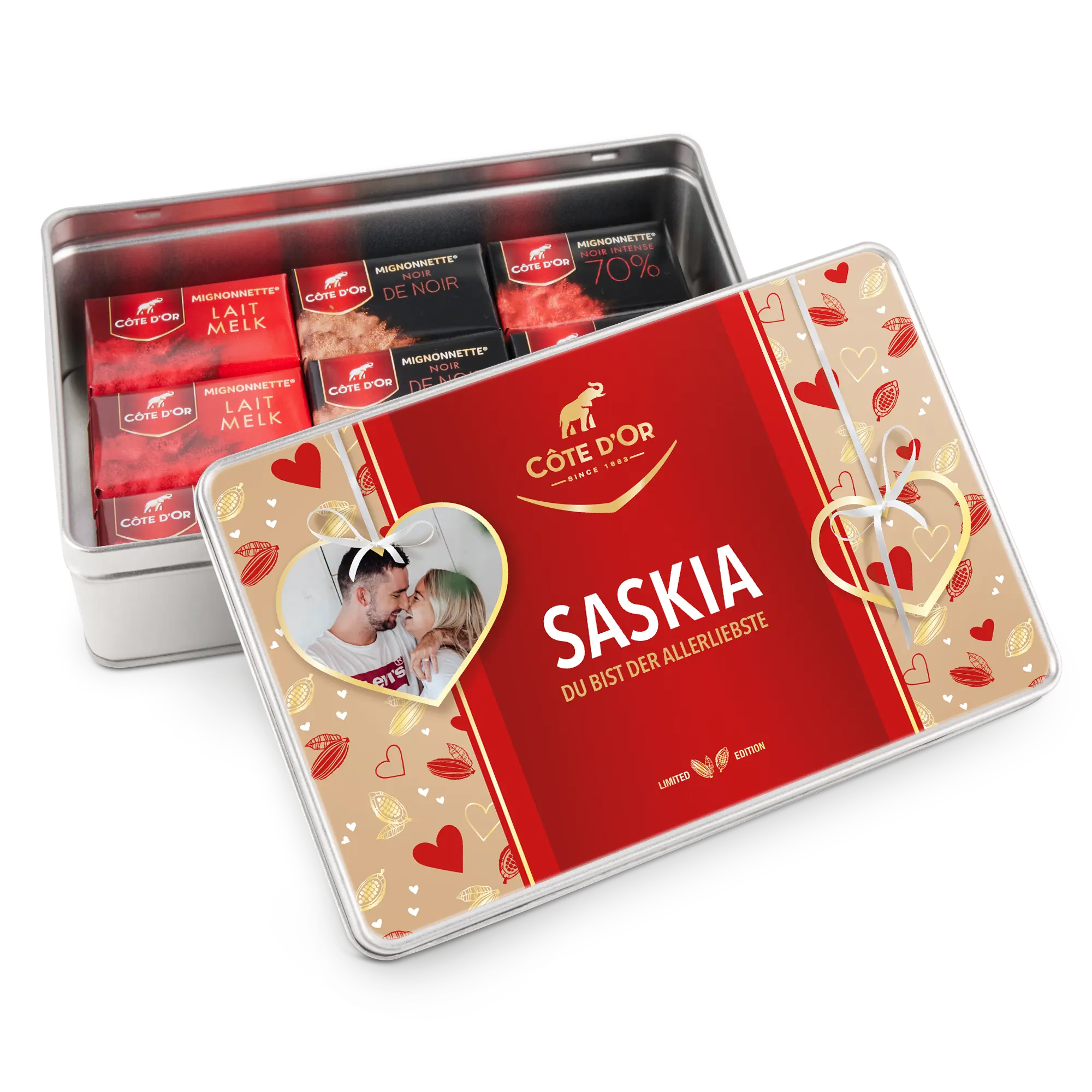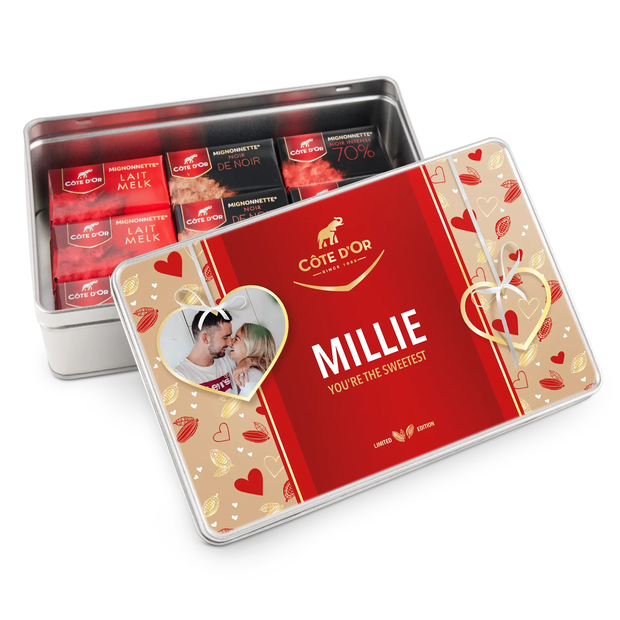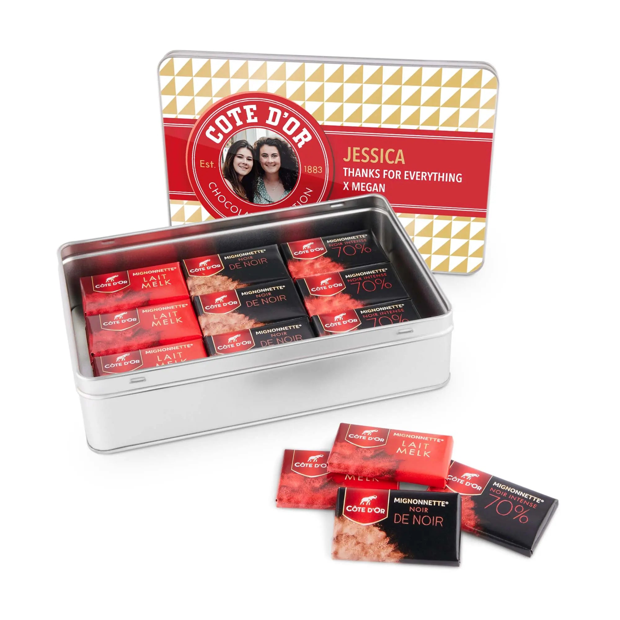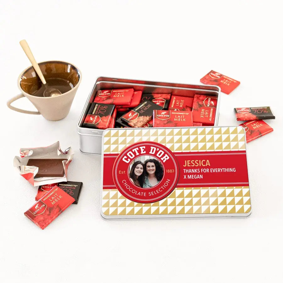 Kişiye özel fotoğraf ve/veya isminizle süslenmiş Côte d’Or çikolatasıyla dolu hediye kutusu!
