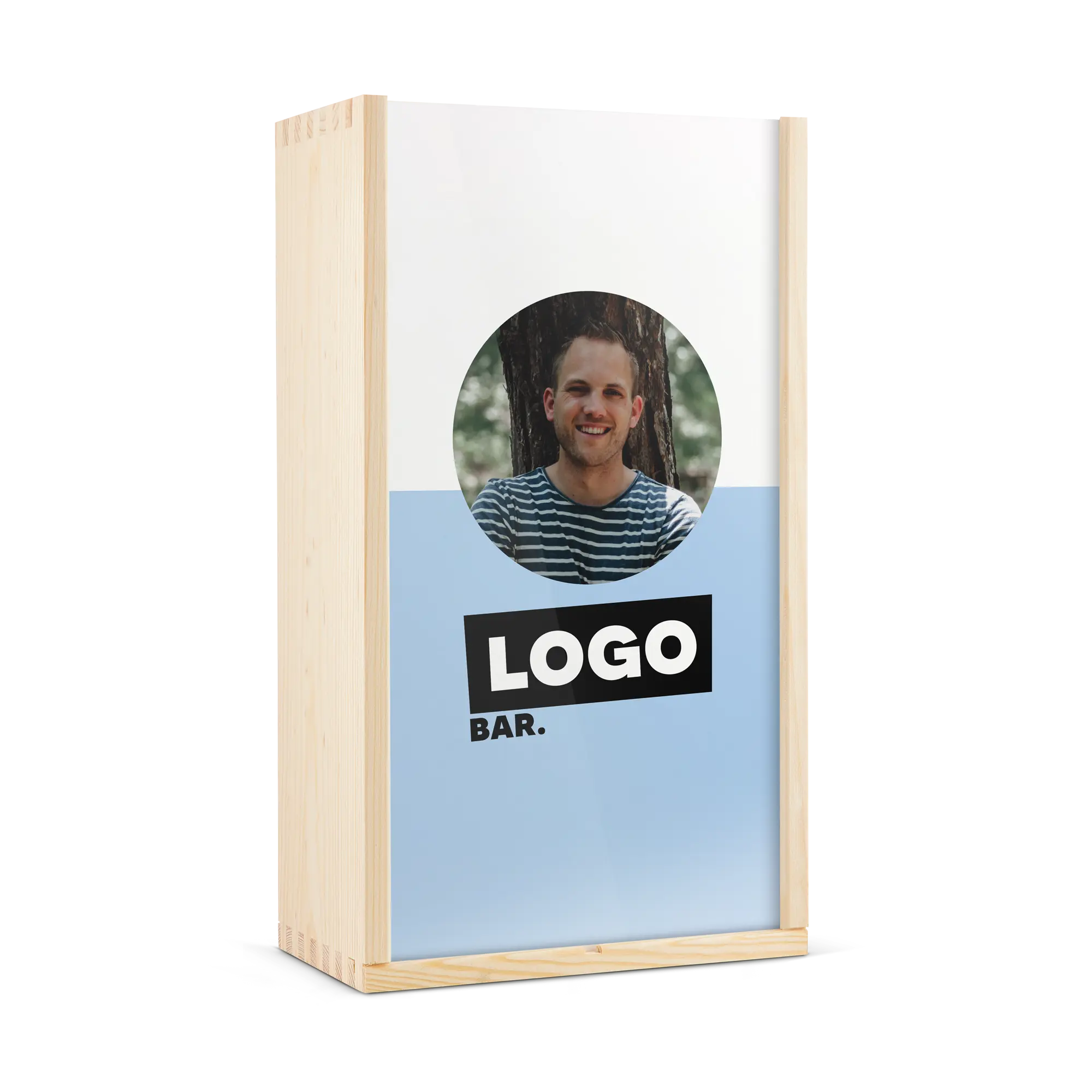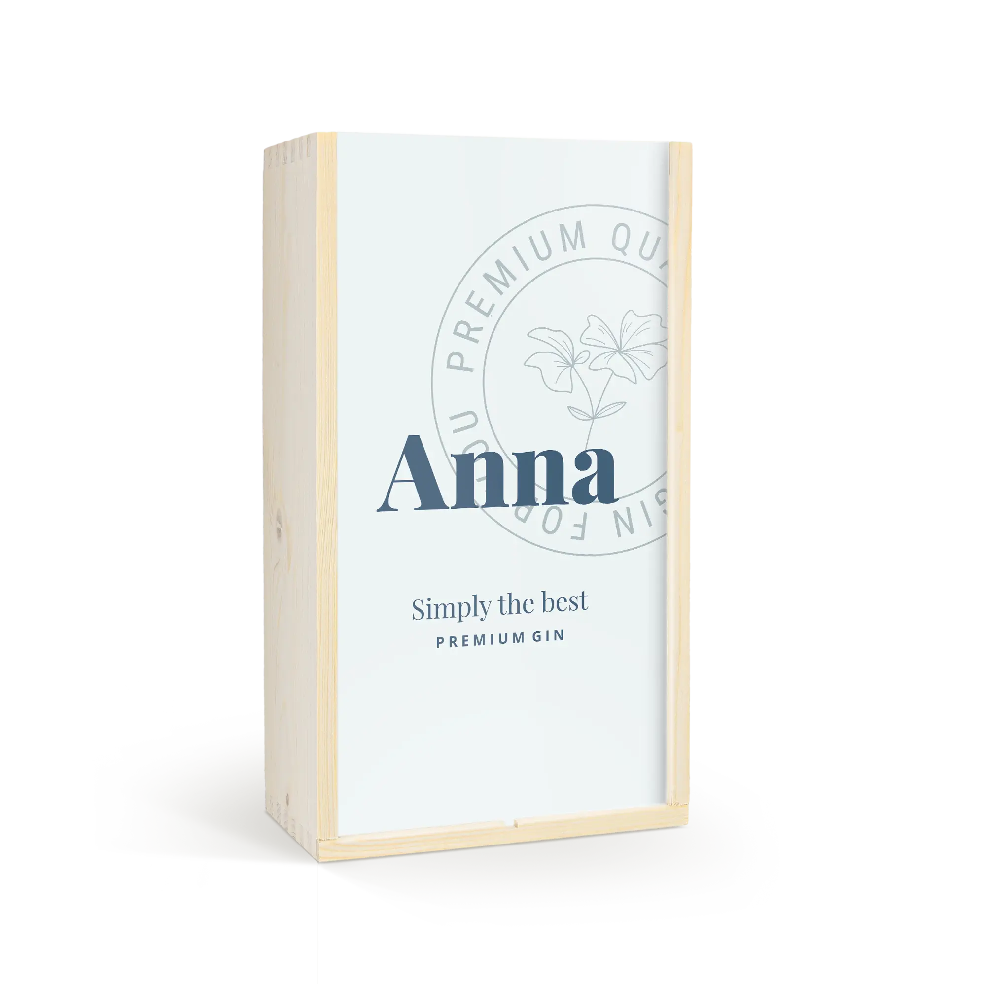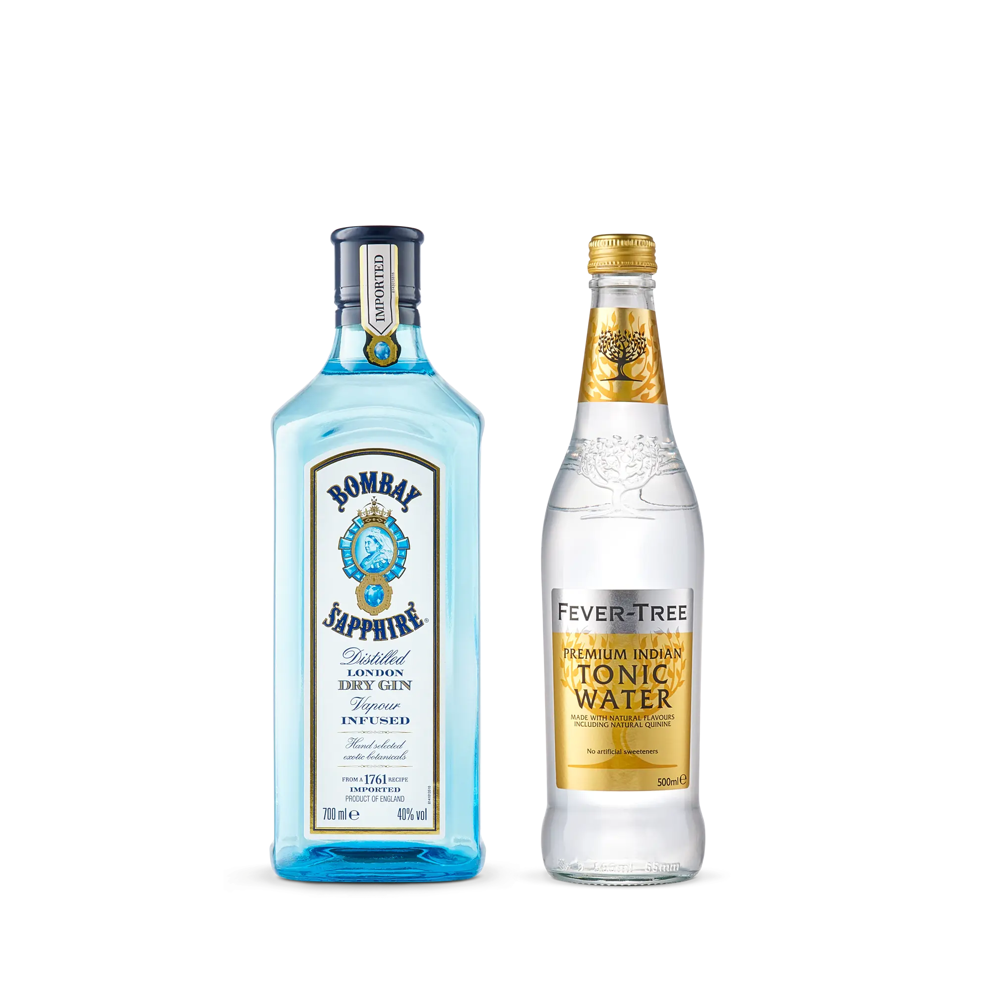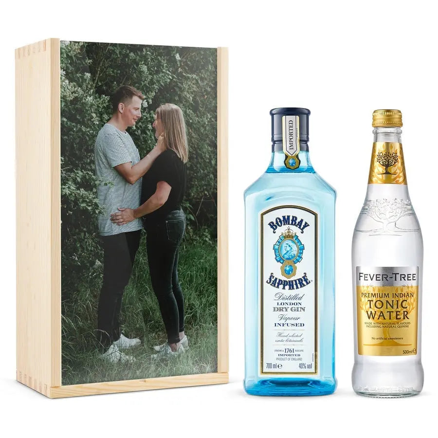 Eşsiz bir gin ve tonik seti, harika bir Bombay Sapphire Gin şişesi ve Fever Tree Tonik ile ahşap kutuda. Kapağında sizin tasarımınızla!