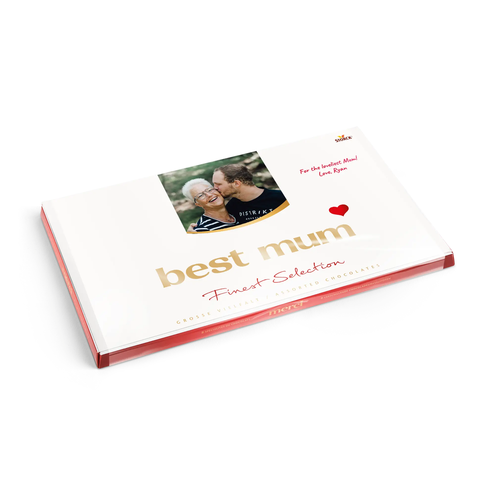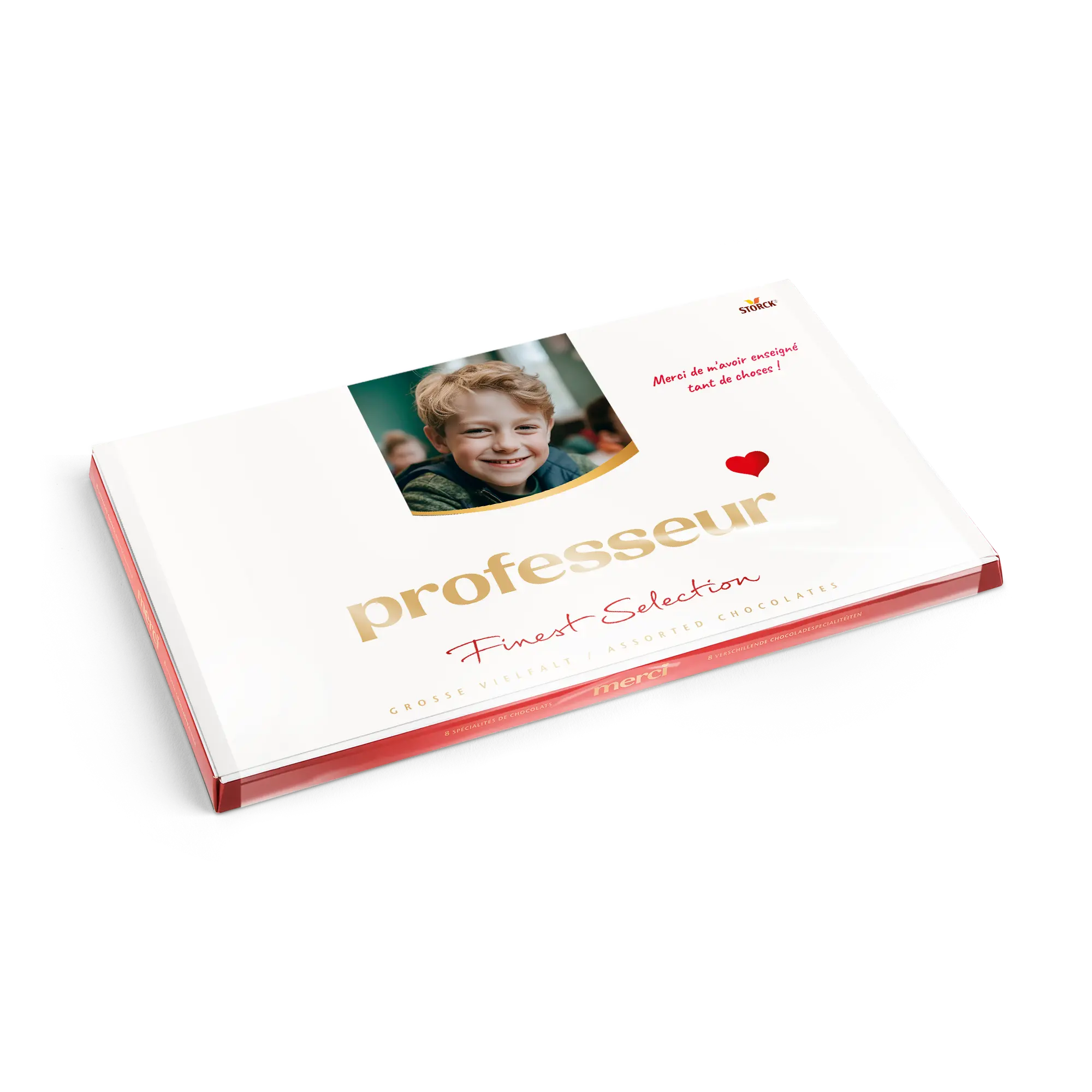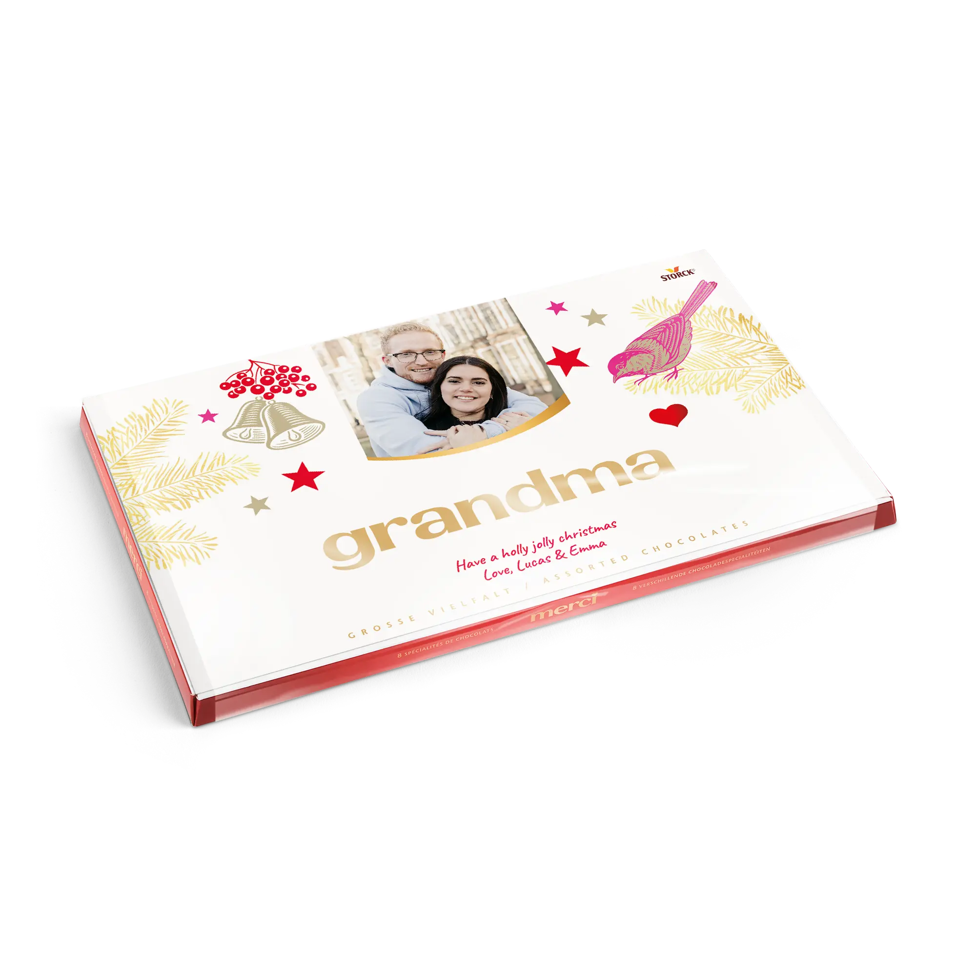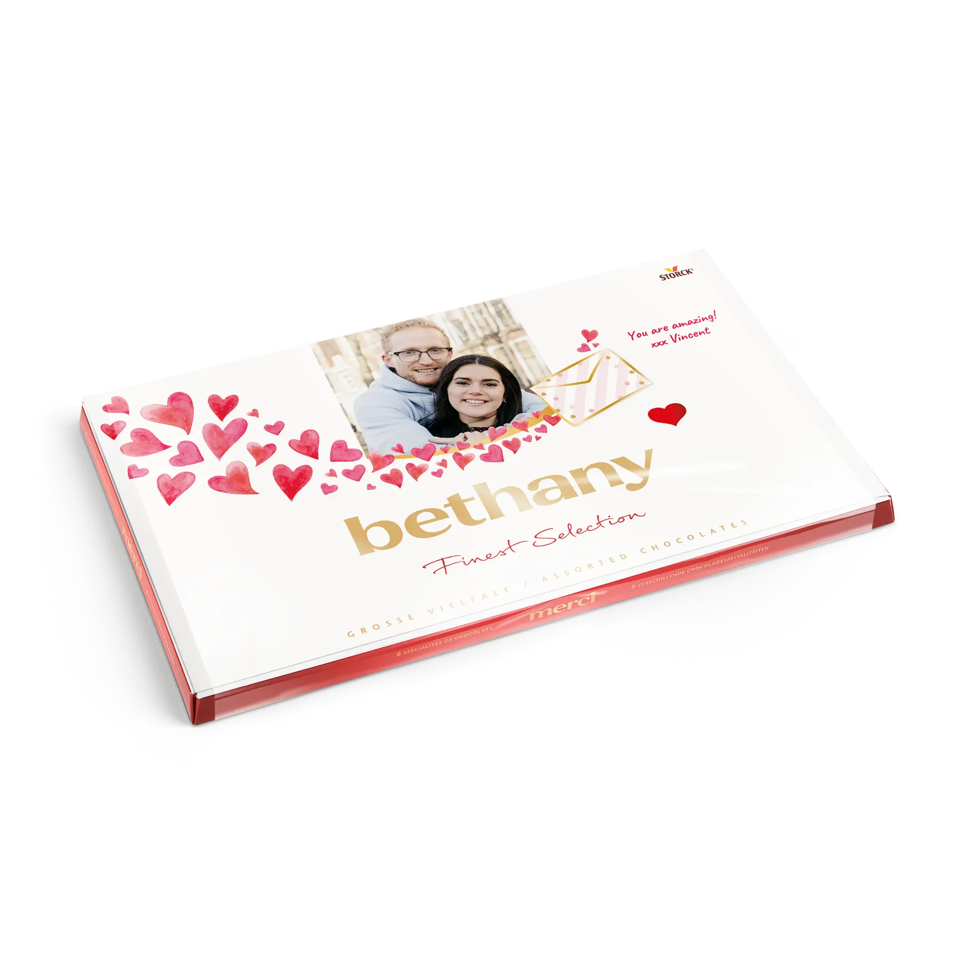 Kişiselleştirilmiş bir kart ile birlikte, istediğiniz fotoğraf, isim ve/veya metni içeren bir Merci çikolata kutusu. Klasik Merci tasarımı!