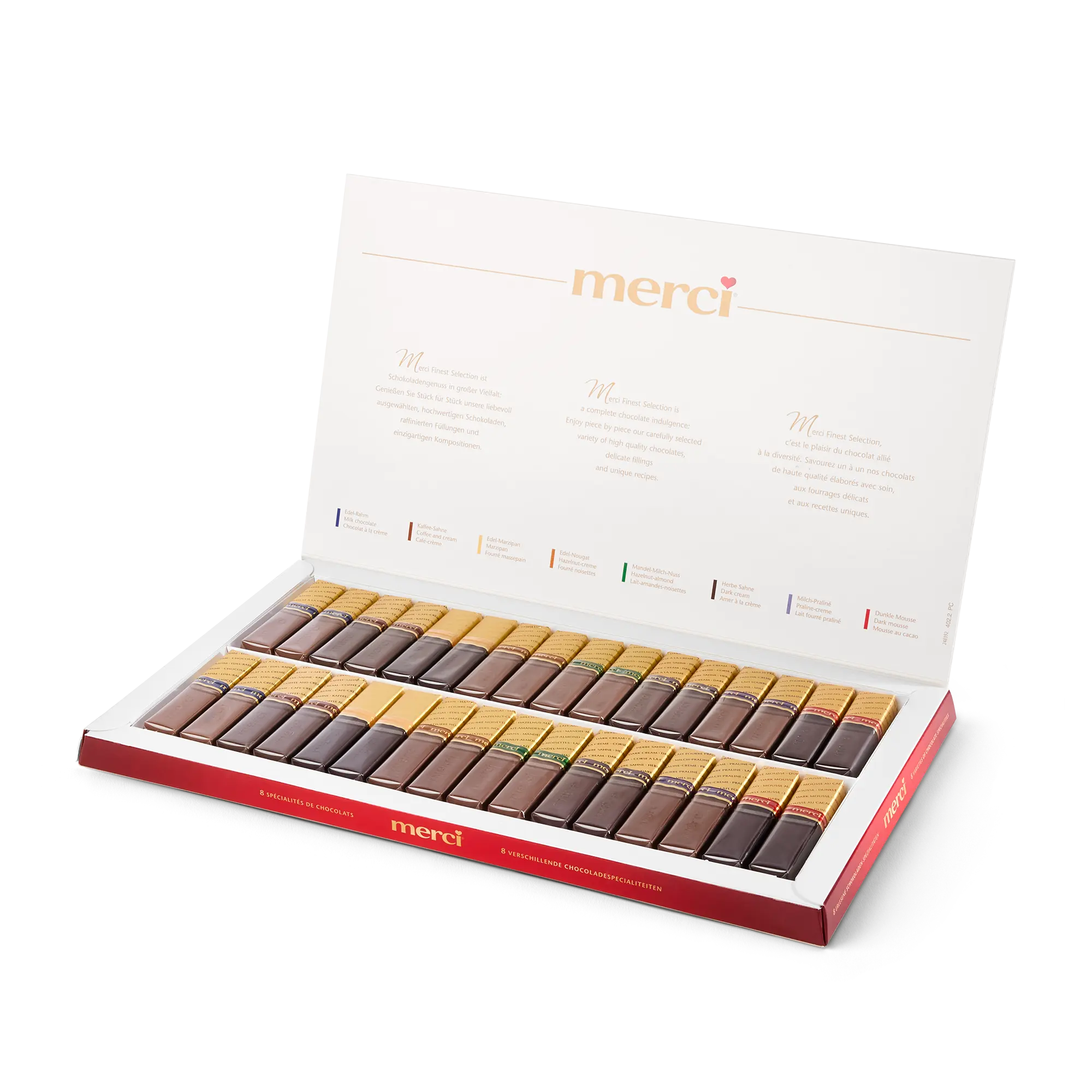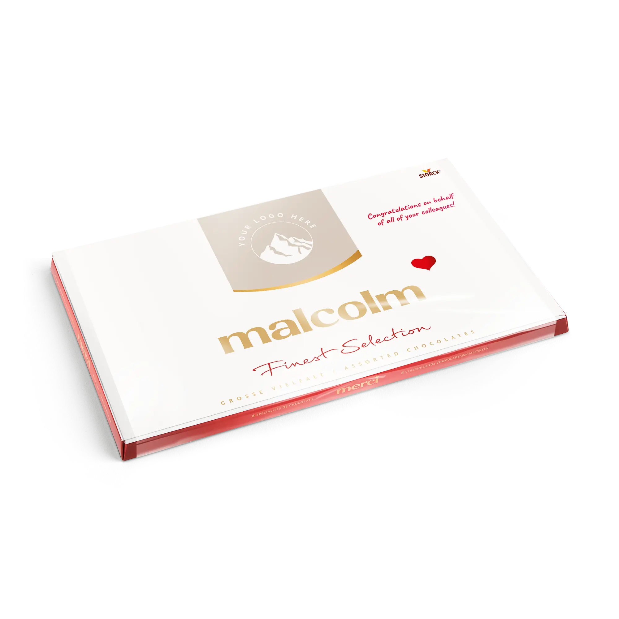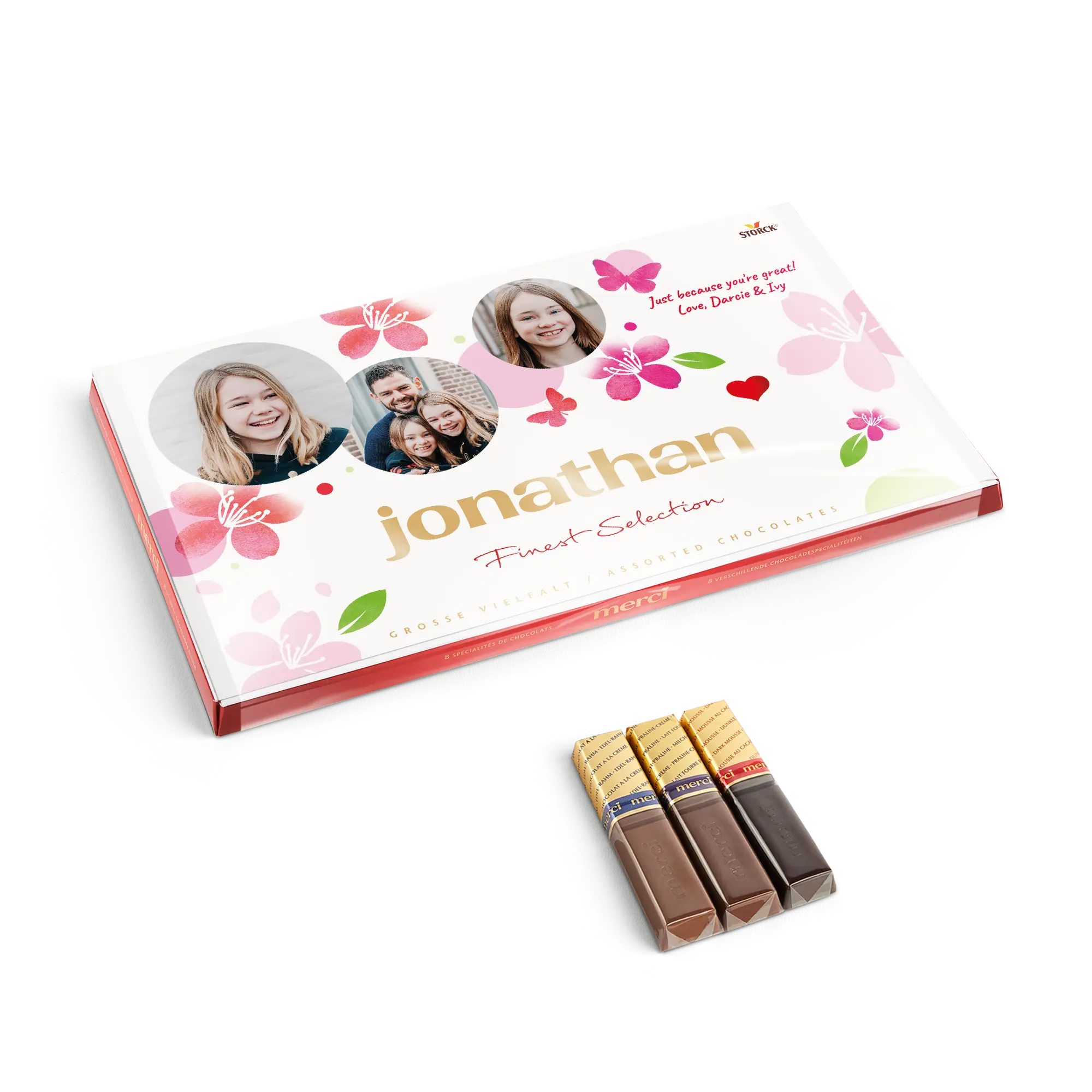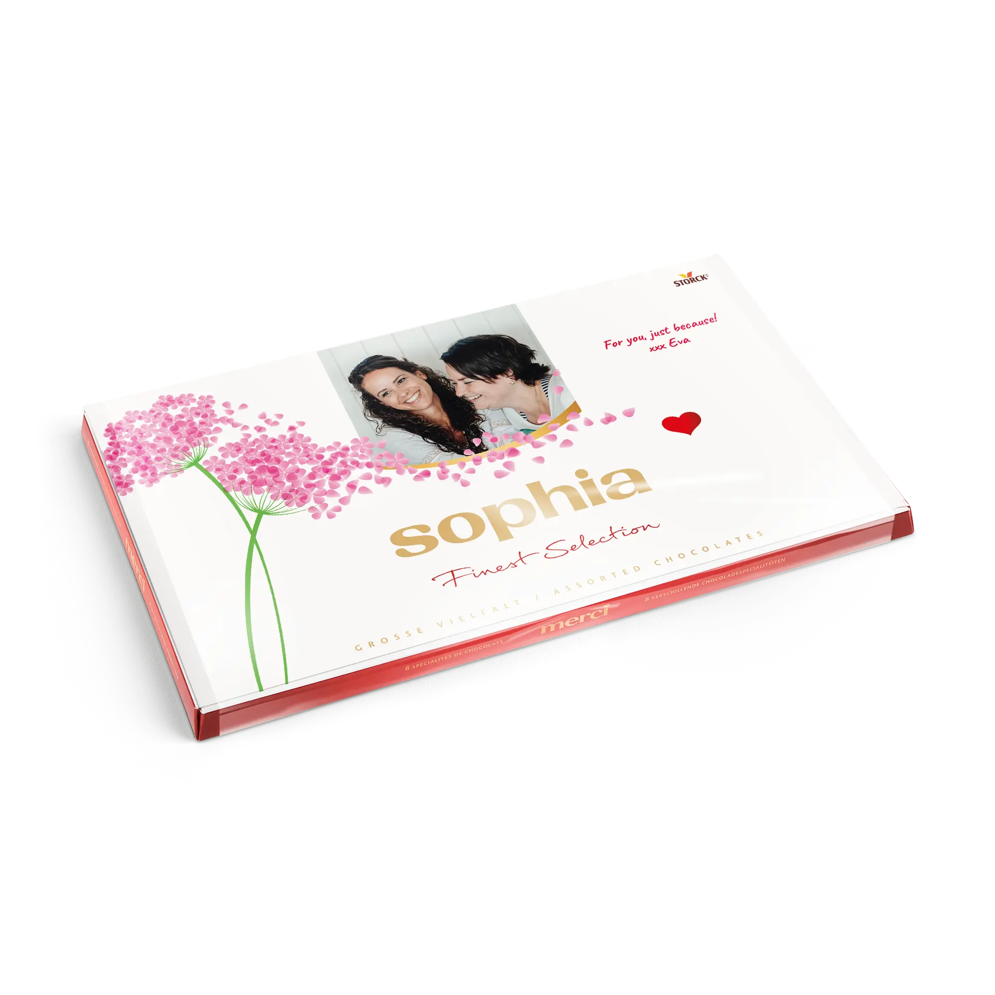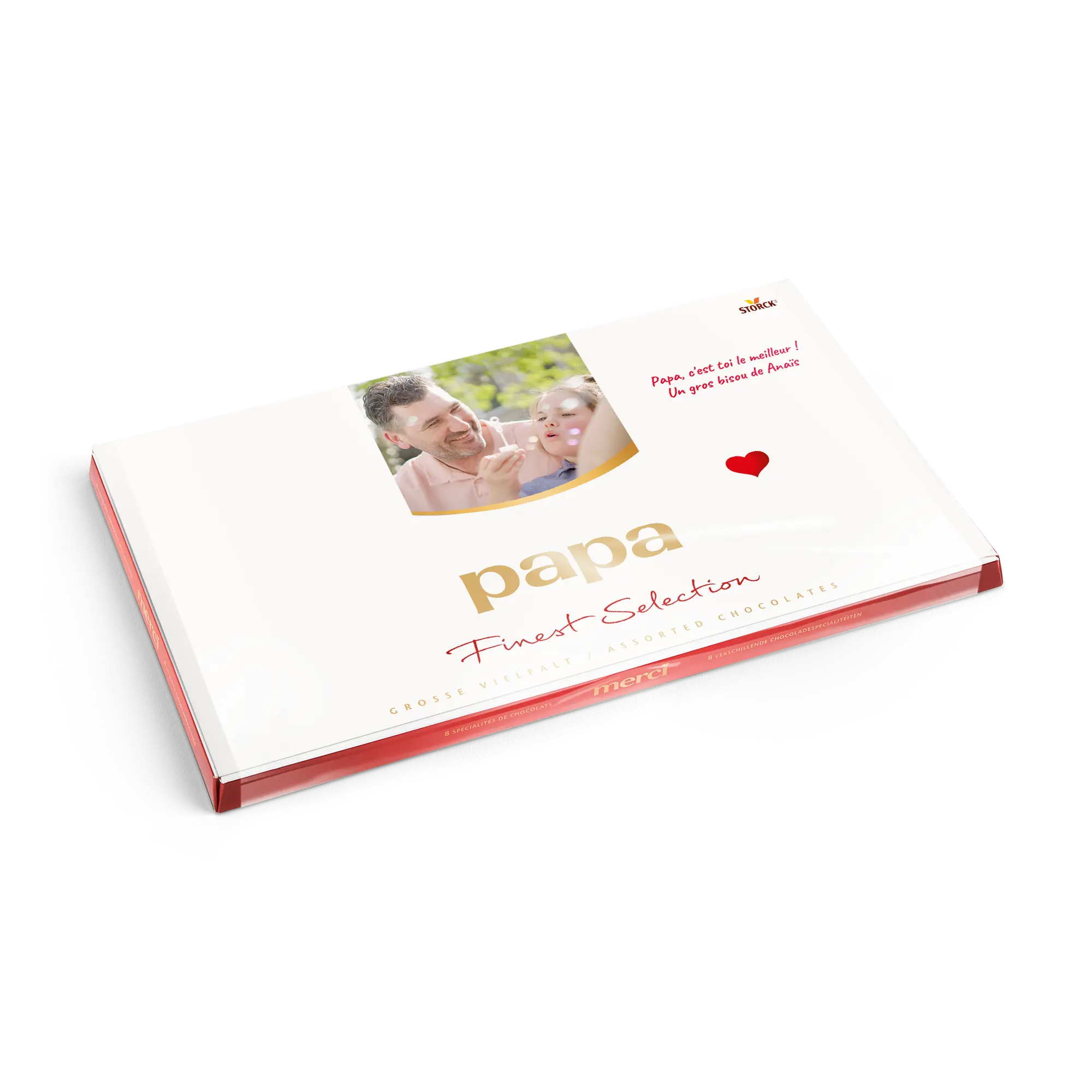 Kişiselleştirilmiş bir kart ile birlikte, istediğiniz fotoğraf, isim ve/veya metni içeren bir Merci çikolata kutusu. Klasik Merci tasarımı!