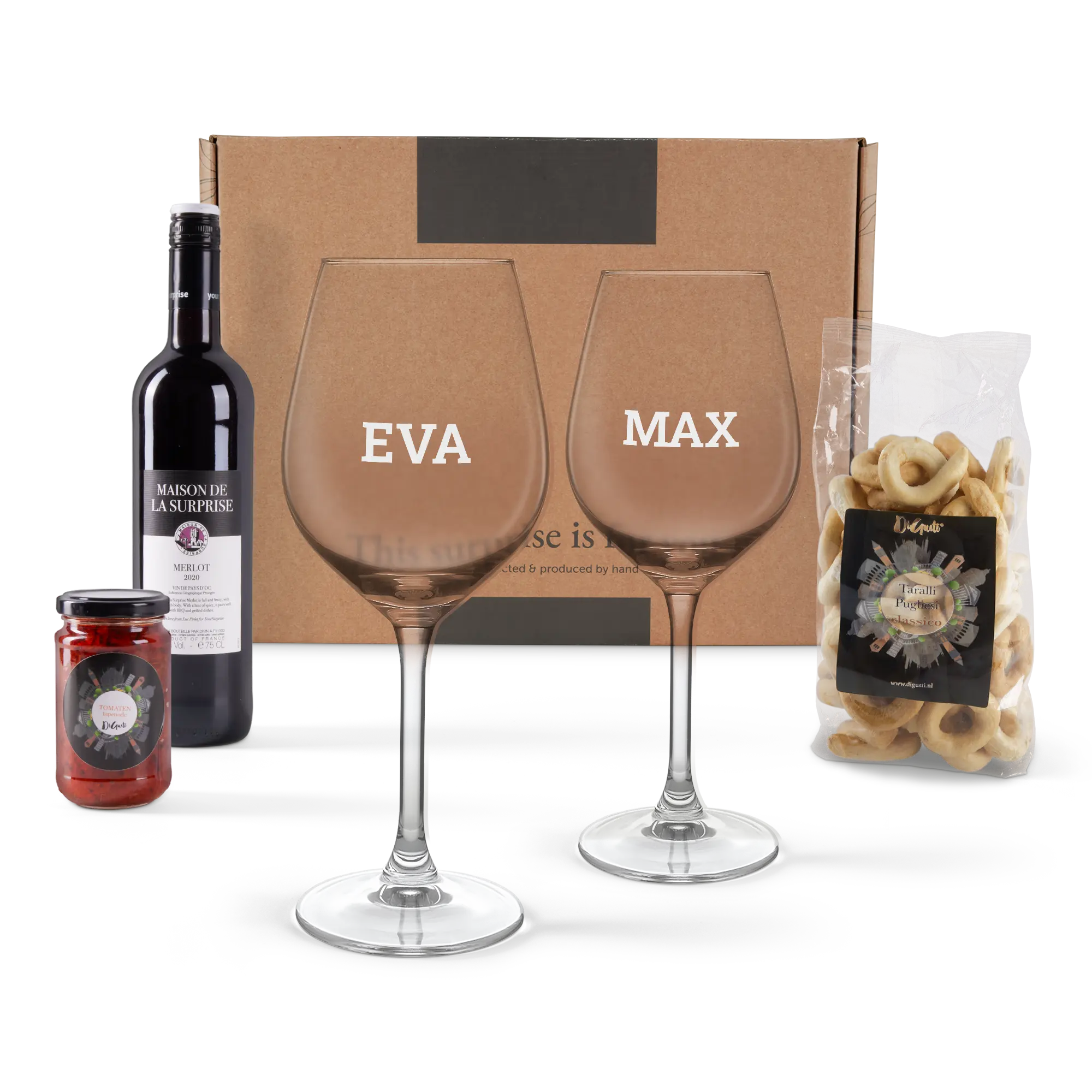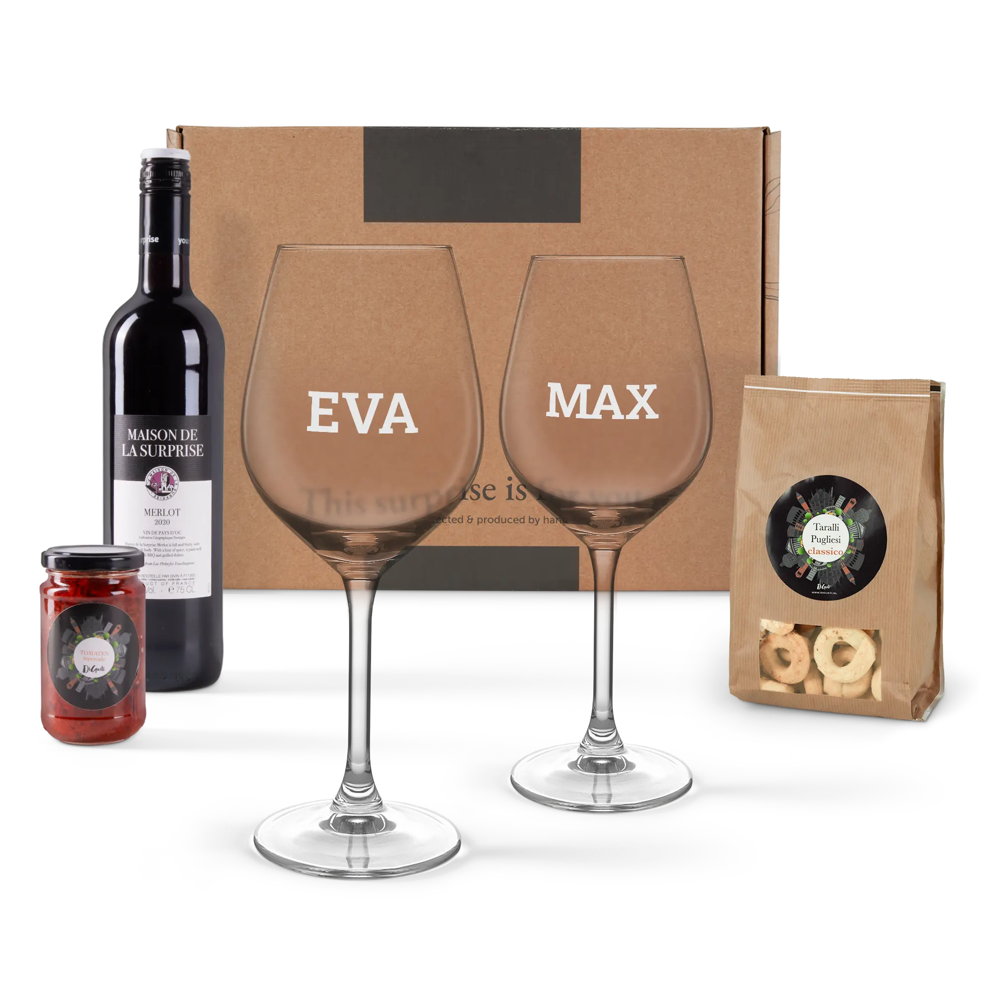 Bir kırmızı şarap ve atıştırmalıklar hediye seti; kırmızı şarap, atıştırmalıklar ve gravürlü şarap kadehleri içerir. Her özel gün için mükemmel bir hediye.
