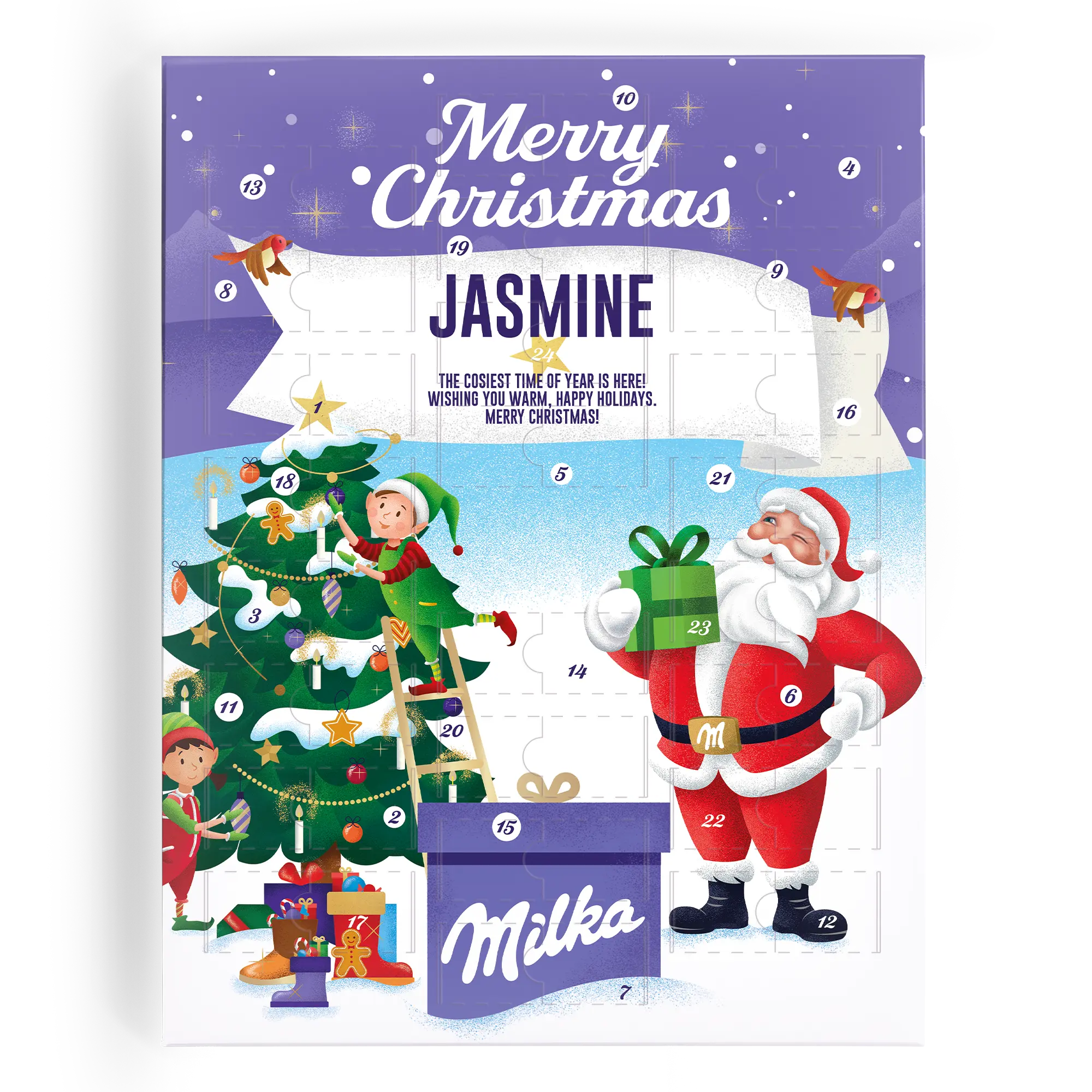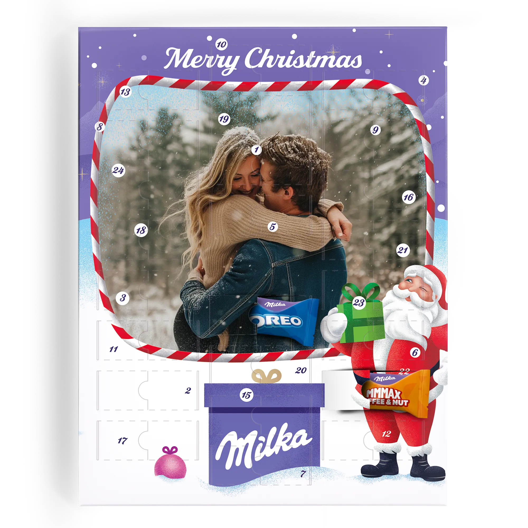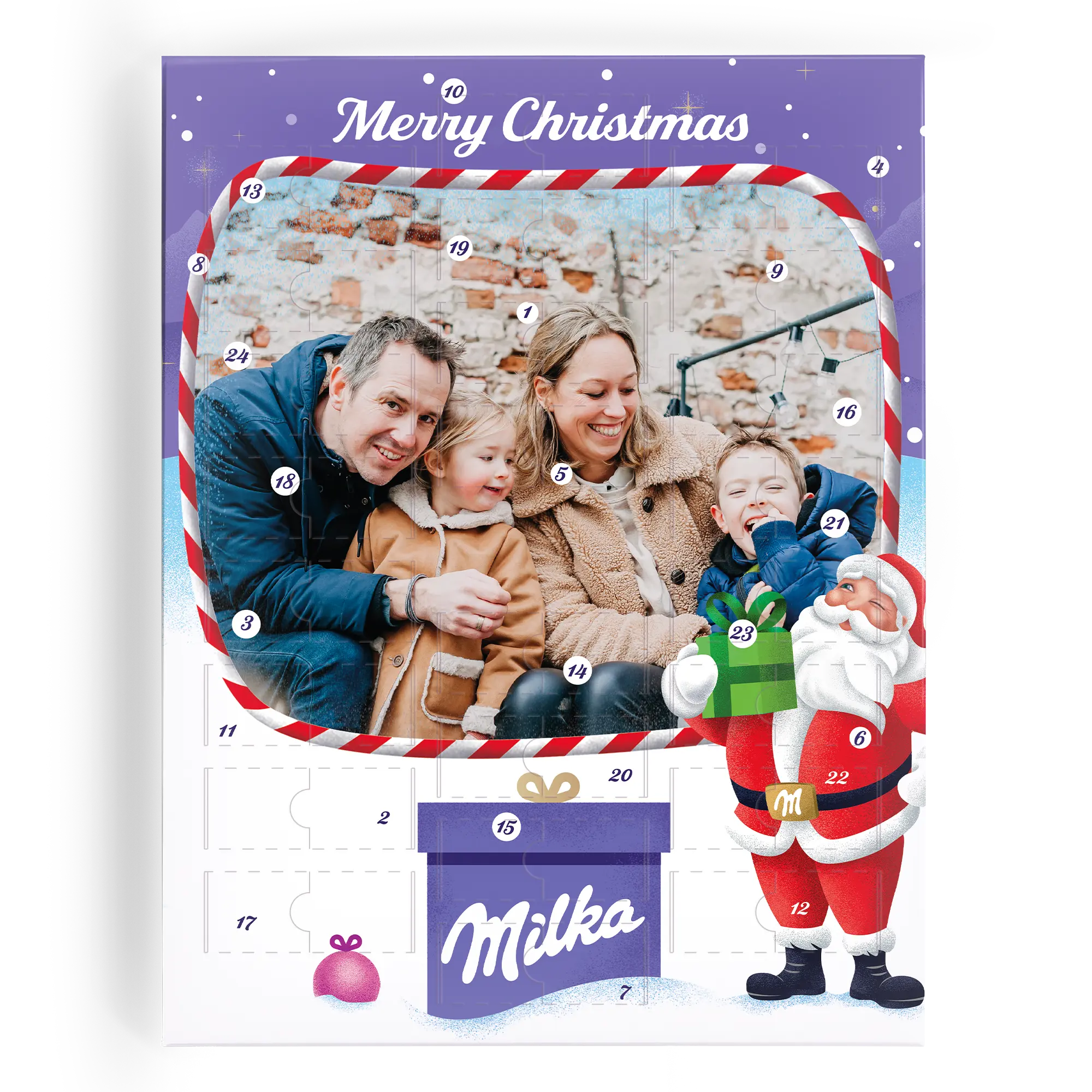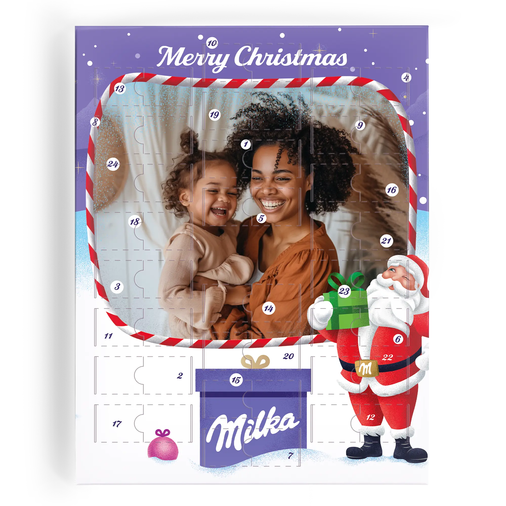 Milka advent takvimi, fotoğraf, isim ve/veya metin ile kişiselleştirilebilir. 24 lezzetli Milka çikolatası ile dolu. Noel'e lezzetli bir geri sayım!