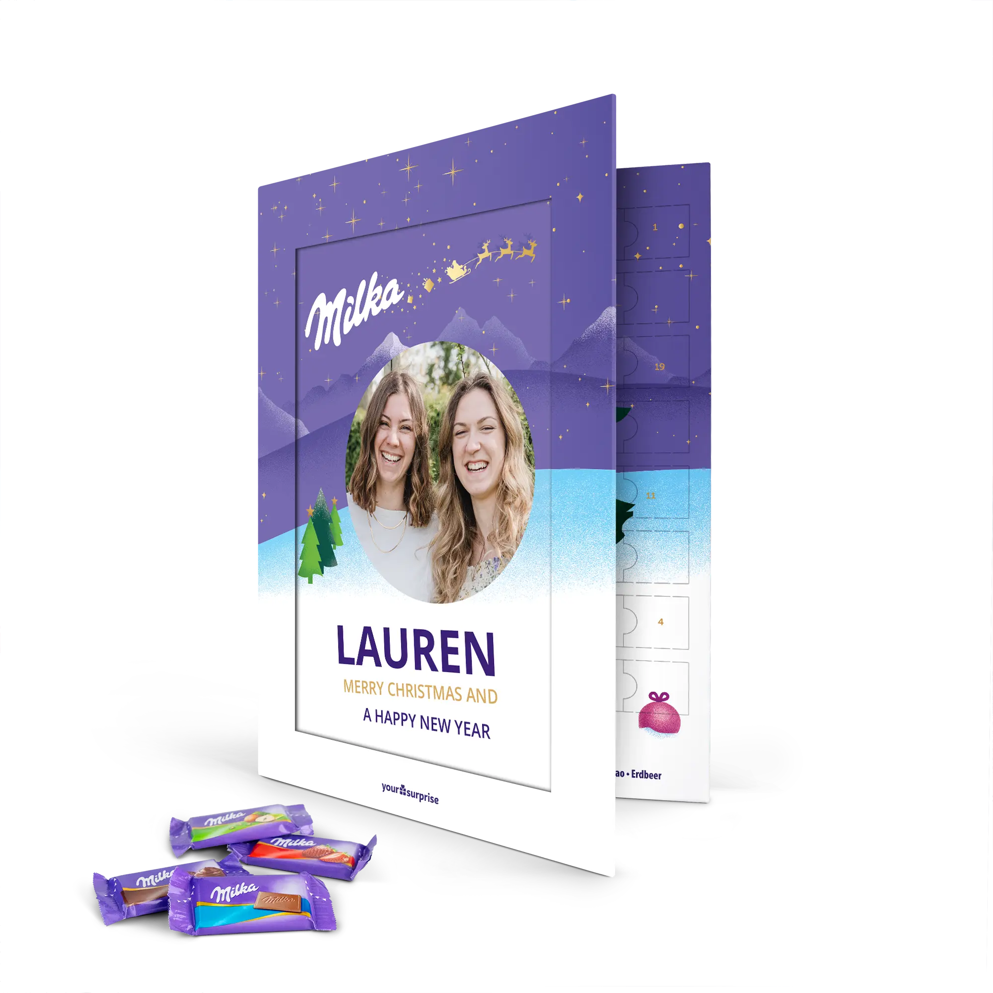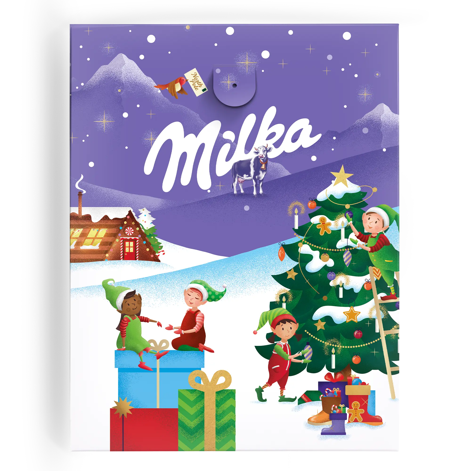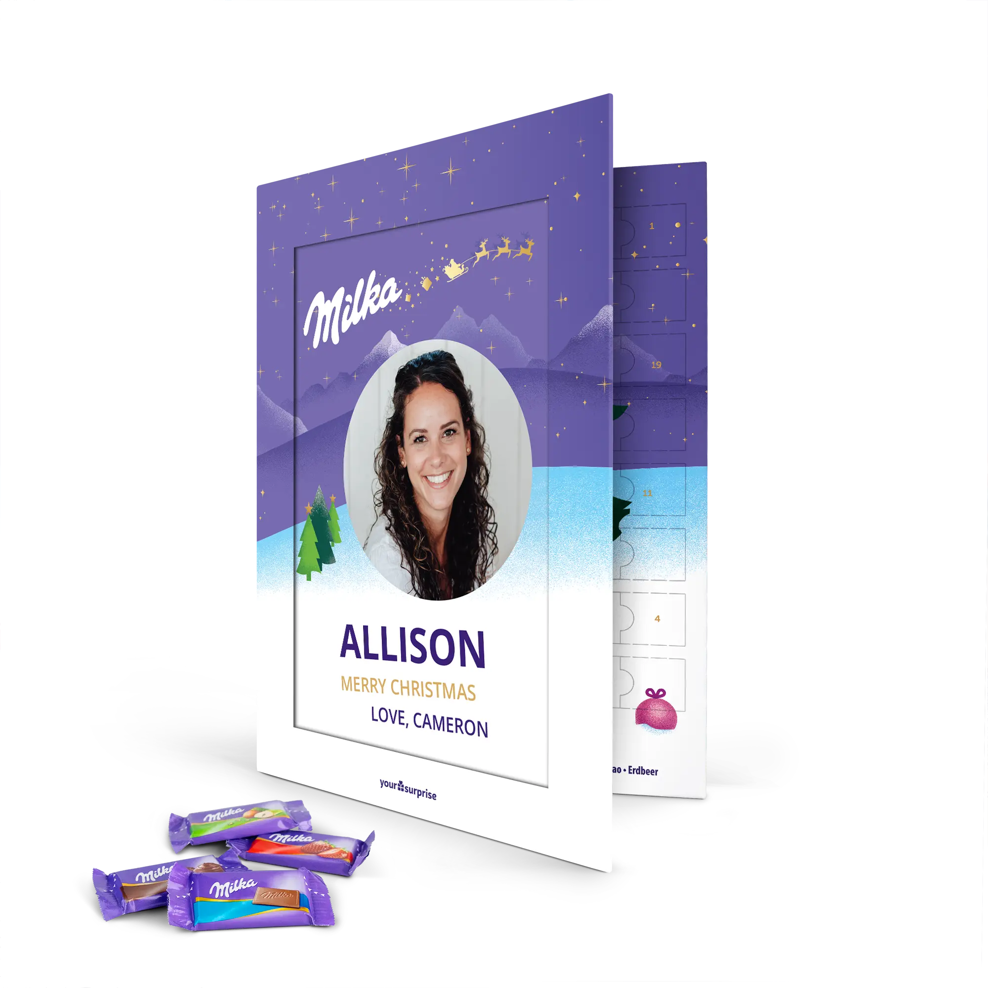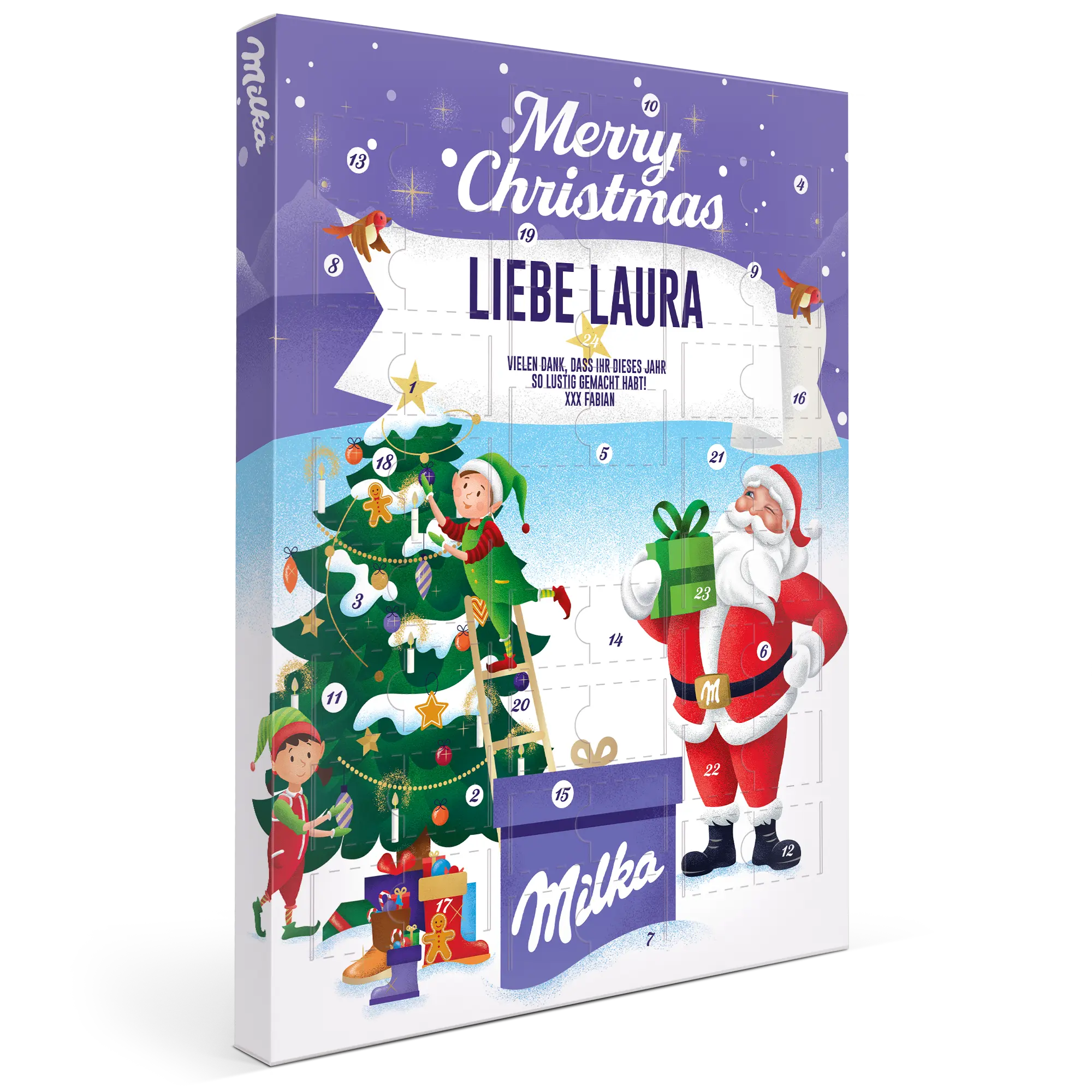 Milka advent takvimi, fotoğraf, isim ve/veya metin ile kişiselleştirilebilir. 24 lezzetli Milka çikolatası ile dolu. Noel'e lezzetli bir geri sayım!