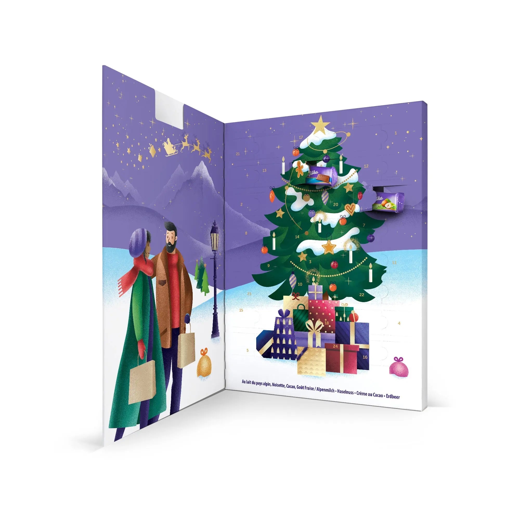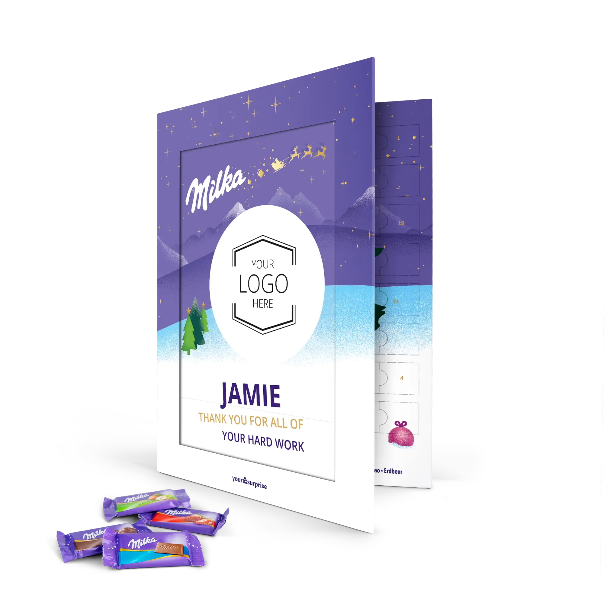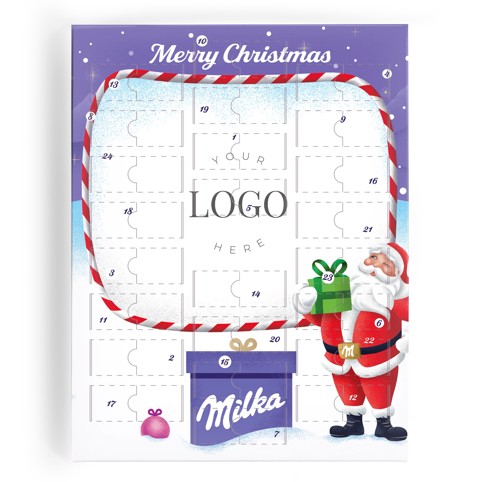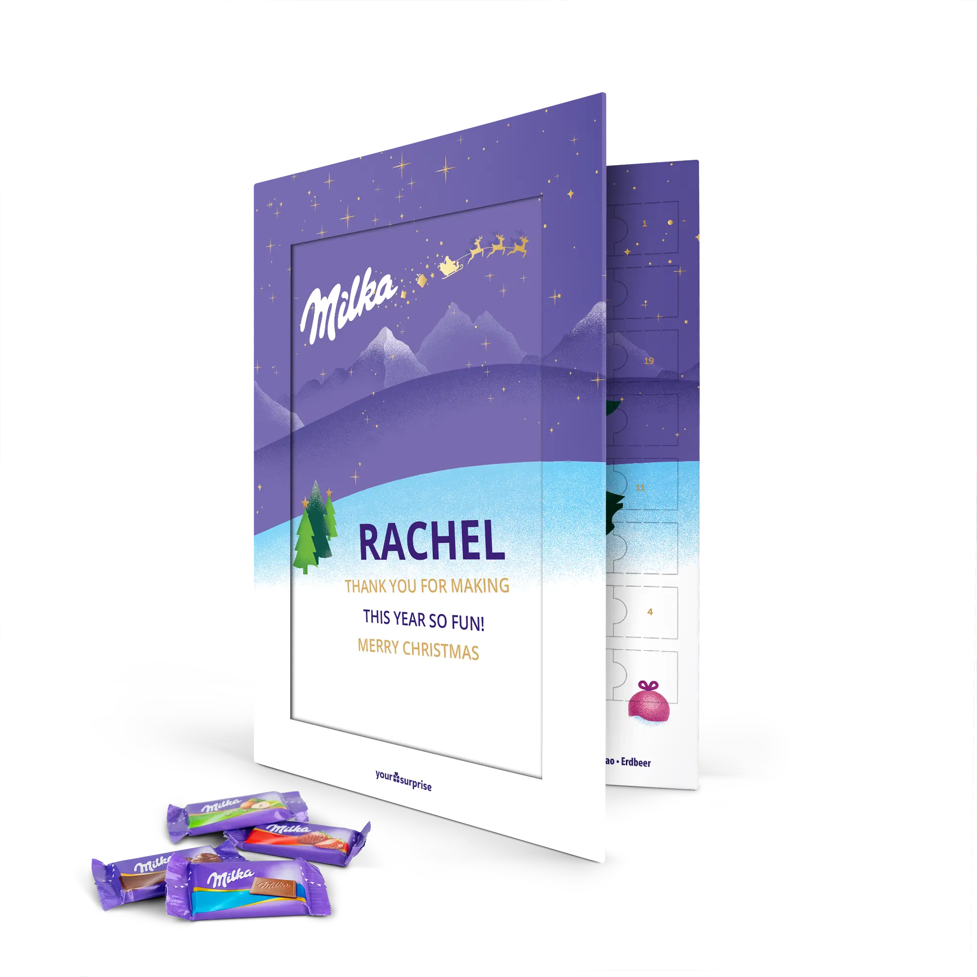 Milka advent takvimi, fotoğraf, isim ve/veya metin ile kişiselleştirilebilir. 24 lezzetli Milka çikolatası ile dolu. Noel'e lezzetli bir geri sayım!