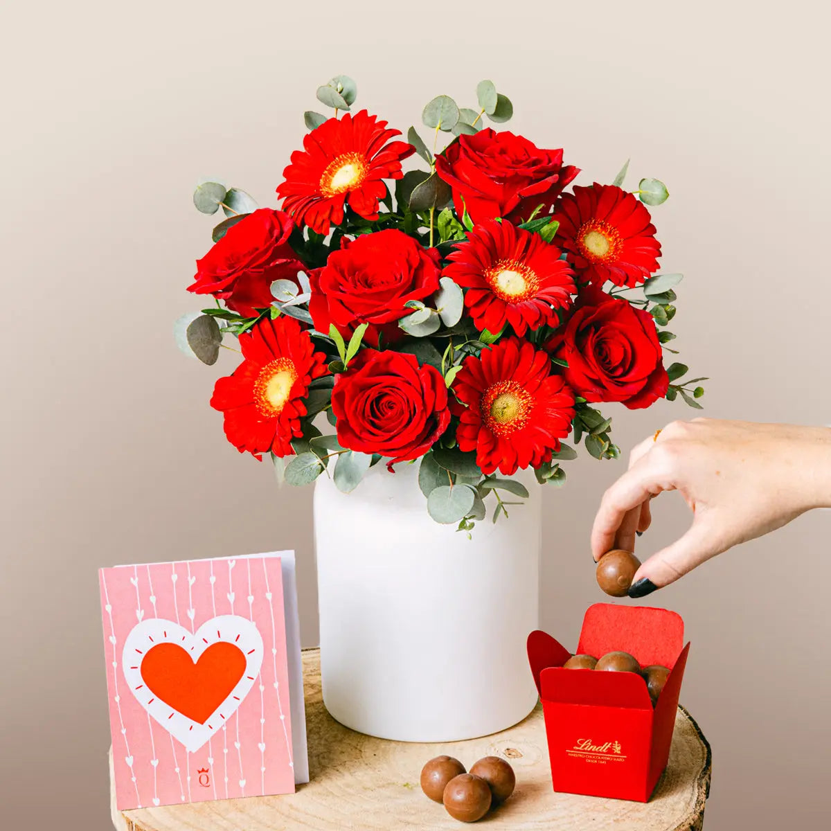 Kırmızı güller ve gerberalardan oluşan canlı bir buket, okaliptüs, çikolatalar ve bir kartla birlikte, sevgi ve neşeyi iletmek için mükemmel.