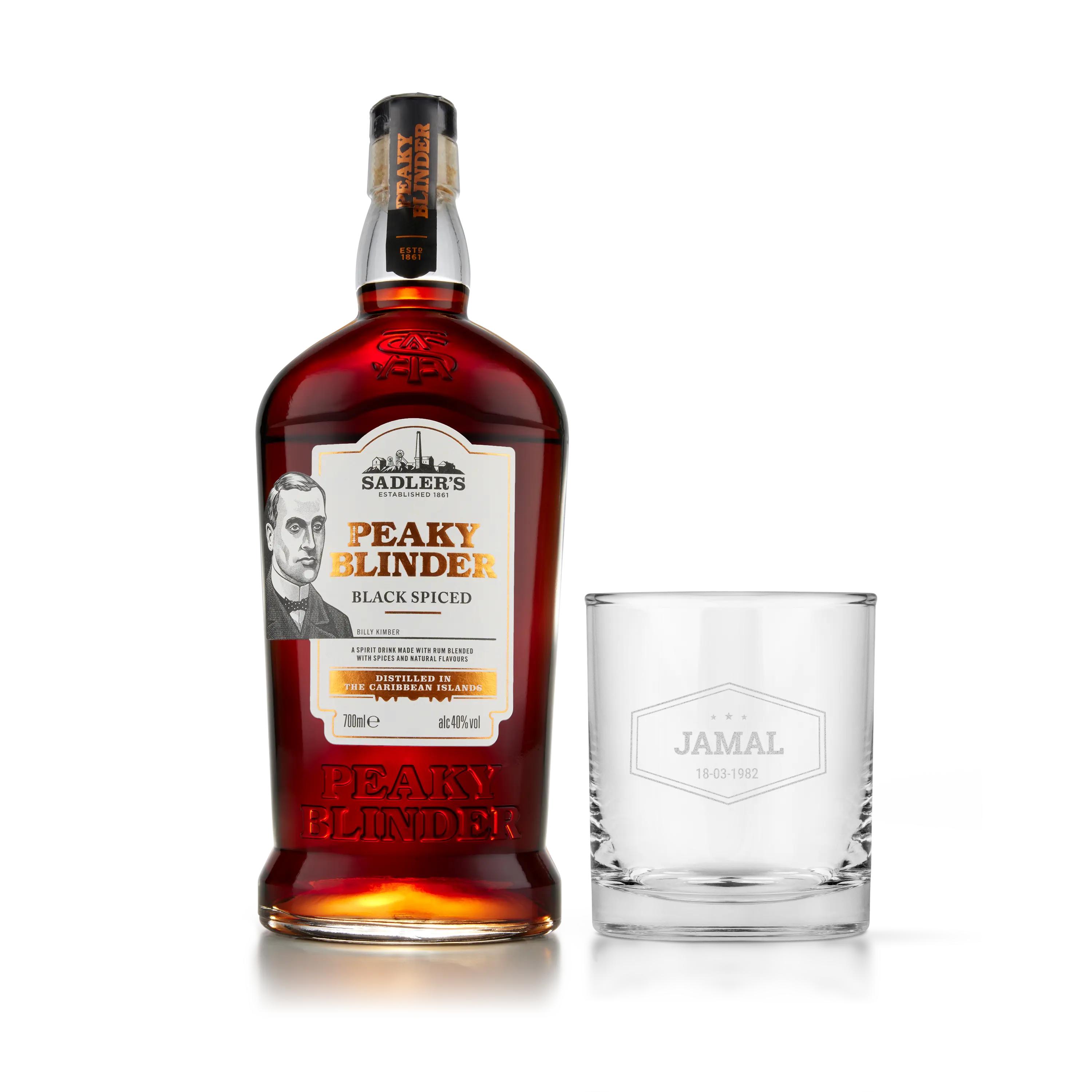 700 ml Sadler's Peaky Blinder Black Spiced Rum, kişiselleştirilmiş rum bardağı, FSC onaylı ahşap kutu.