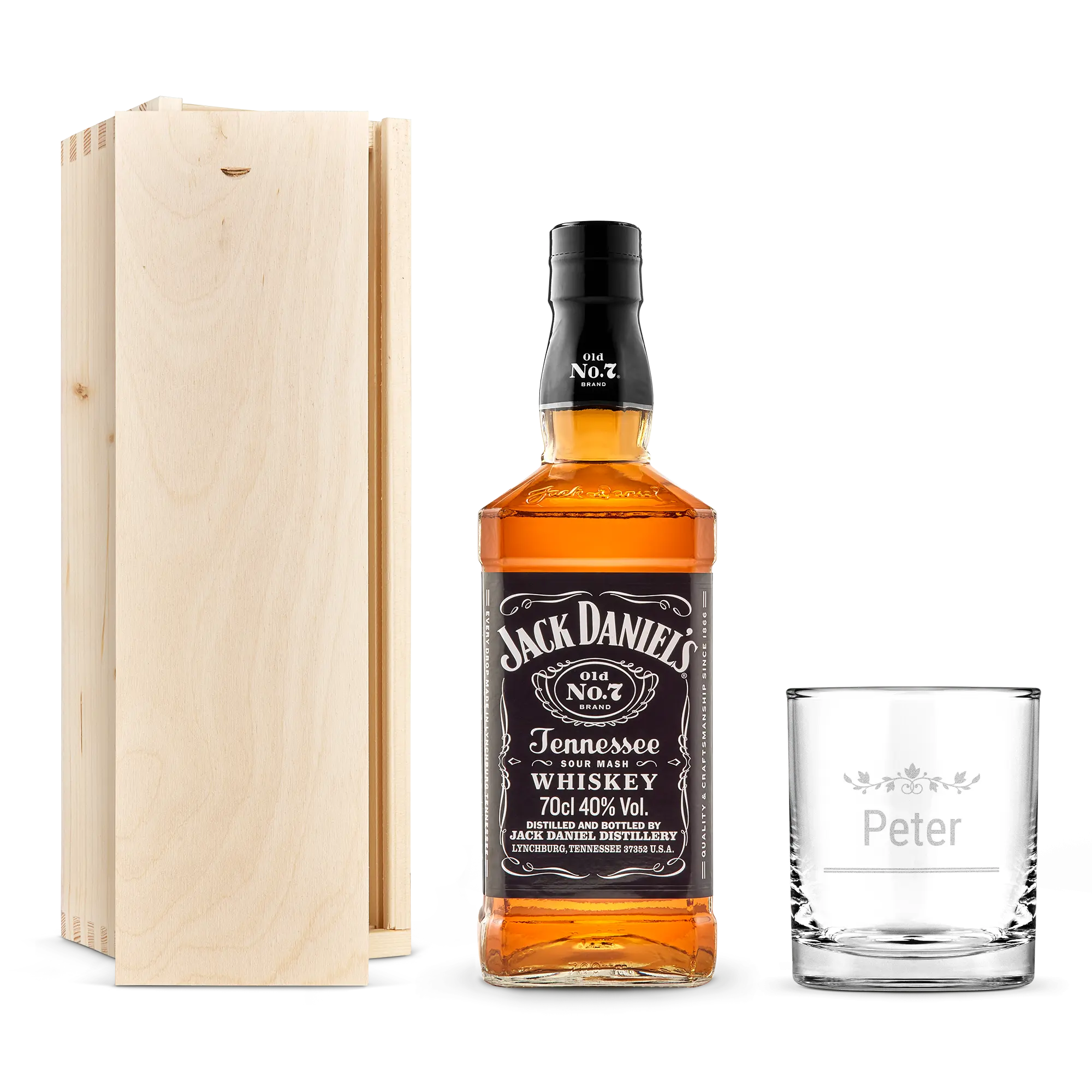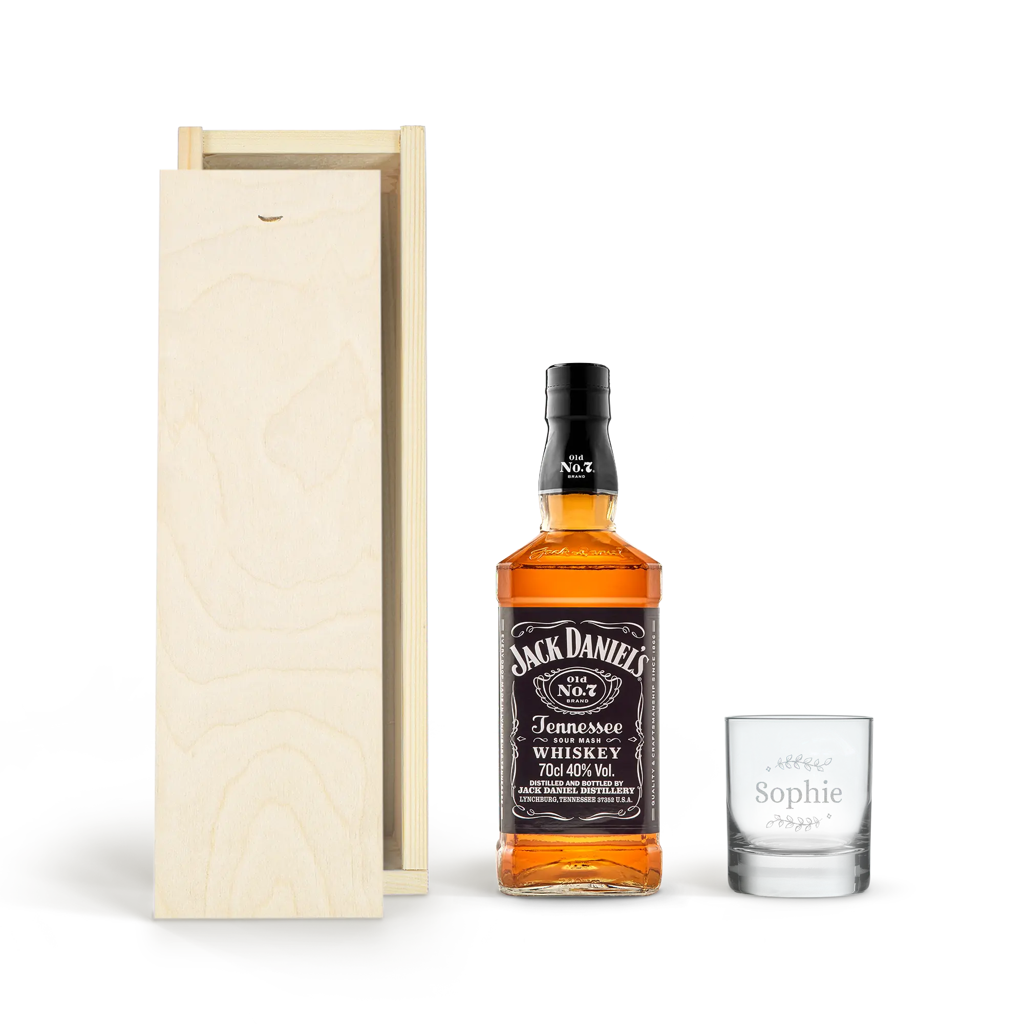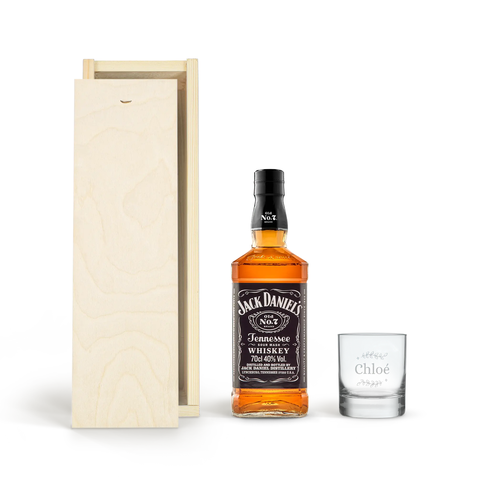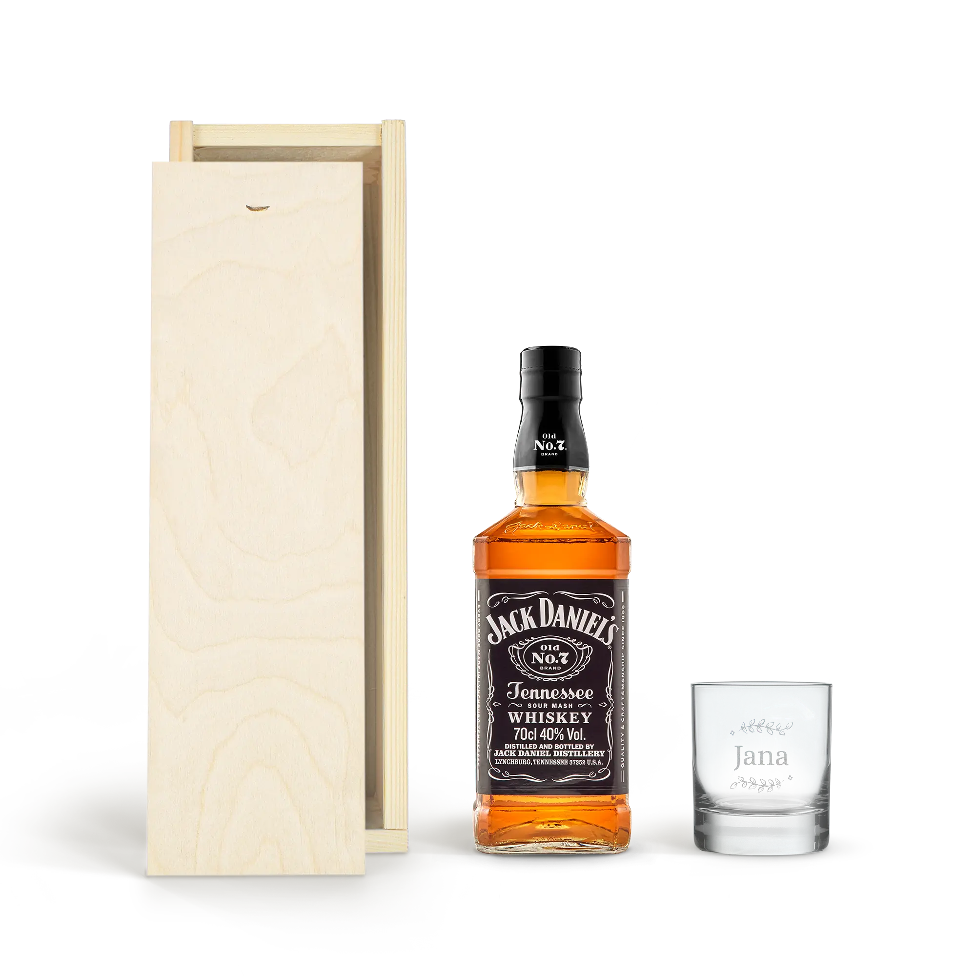 Jack Daniels viski, kişiye özel bardak, ahşap kutu (FSC sertifikalı).