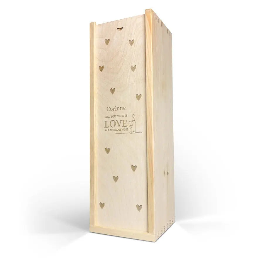 Tamamlayıcılar: Özel olarak kazınmış isim, Sadece Aşk ve Bir Şarap Gerekiyor tasarımı, ince kalp detayları, dayanıklı ahşap yapısı, ince şaraplar için hediye olarak uygun.