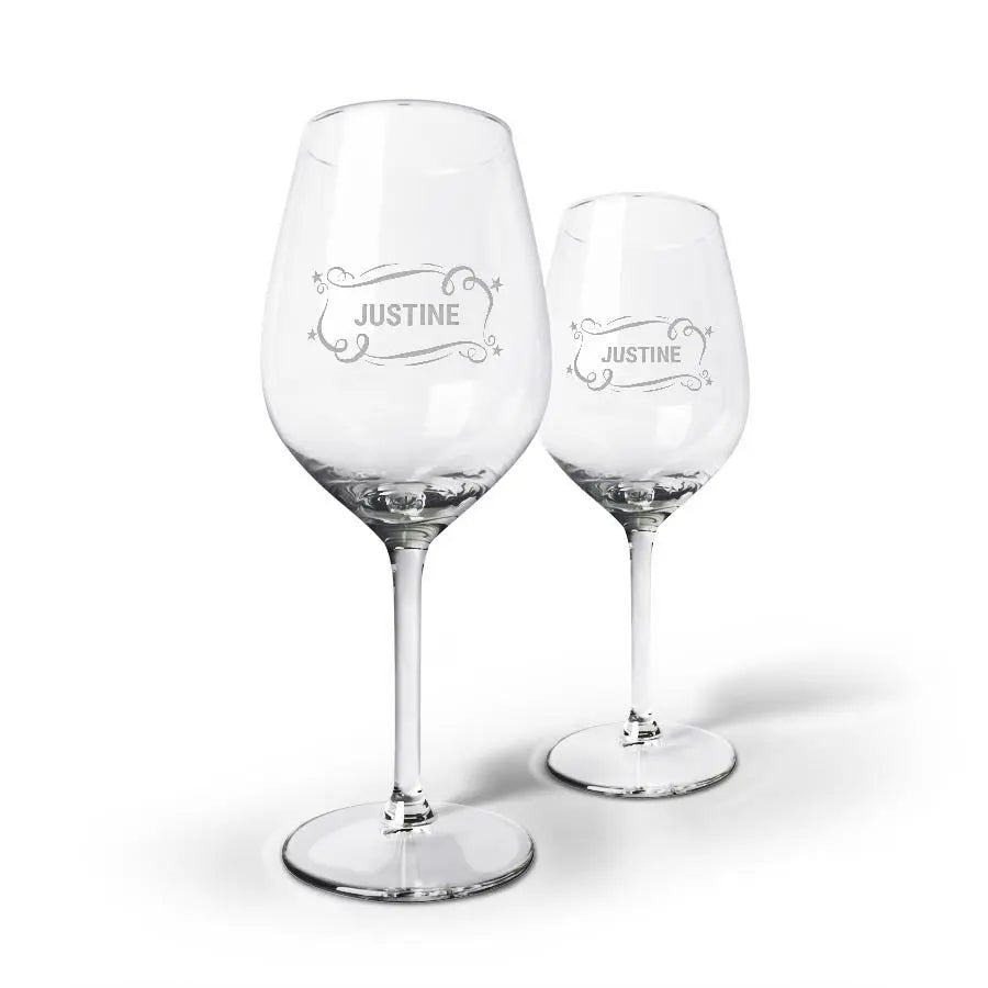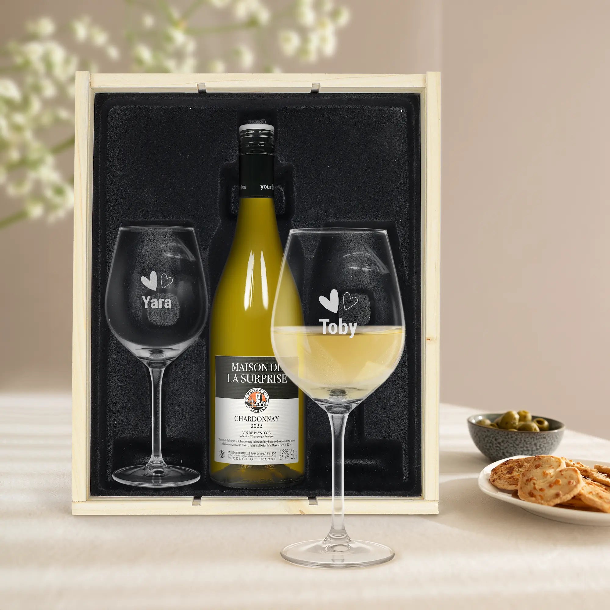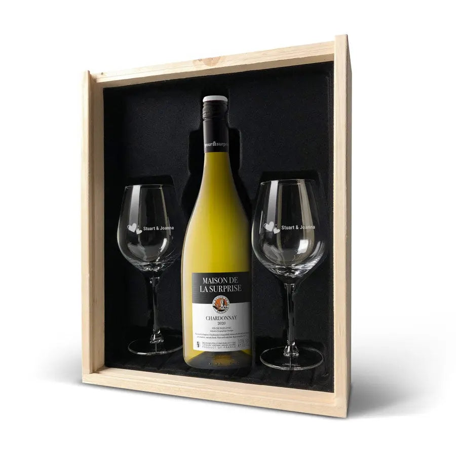 Şarap hediye seti ile kadehler - Maison de la Surprise Chardonnay - Gravürlü kadehler