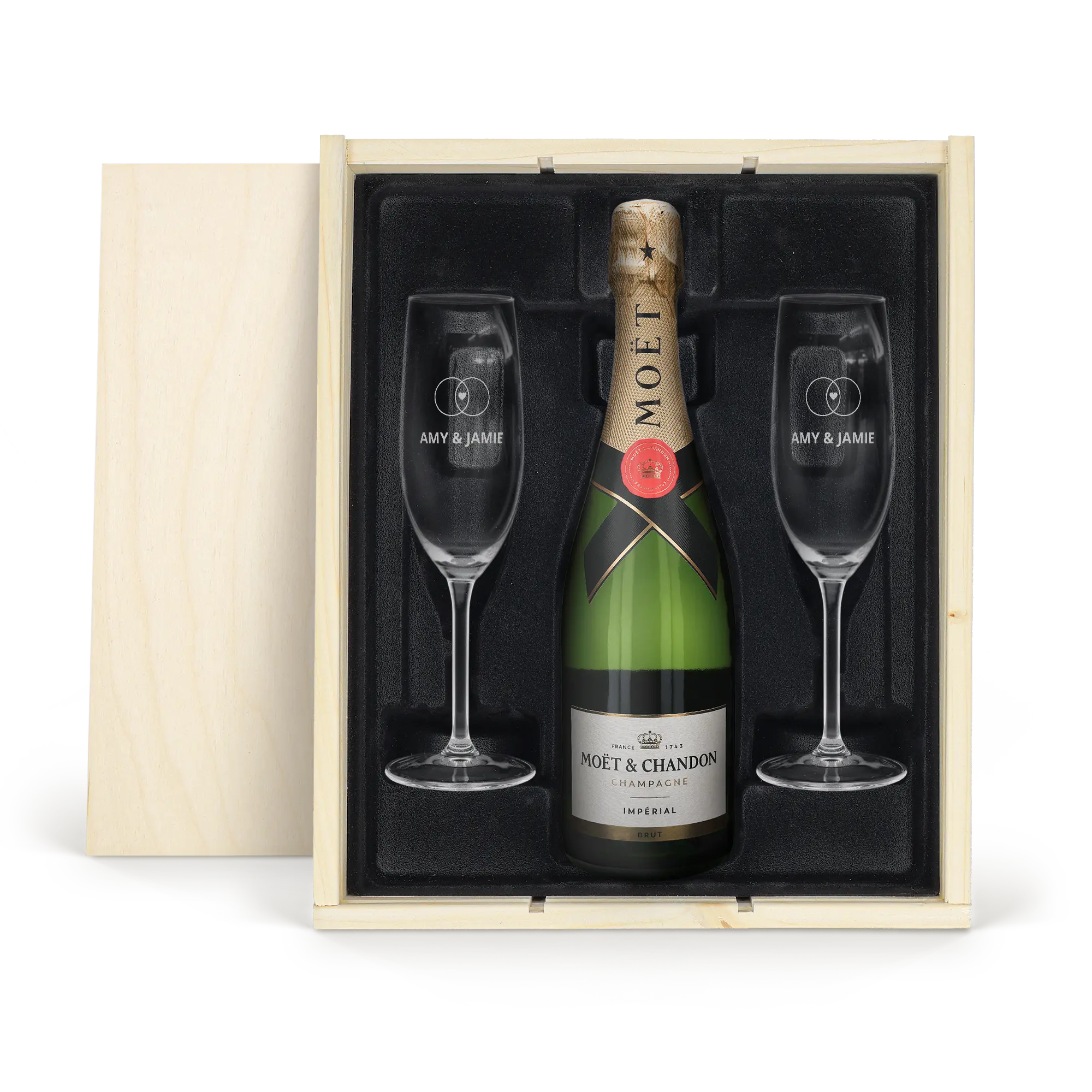 Lezzetli bir Moët et Chandon şampanyası ve iki adet gravürlü kadeh. Lüks ahşap hediye kutusunda, mükemmel bir şampanya hediyesi. Şerefe!