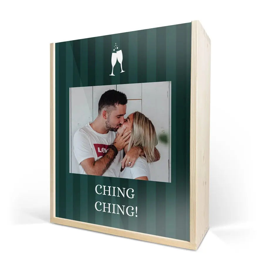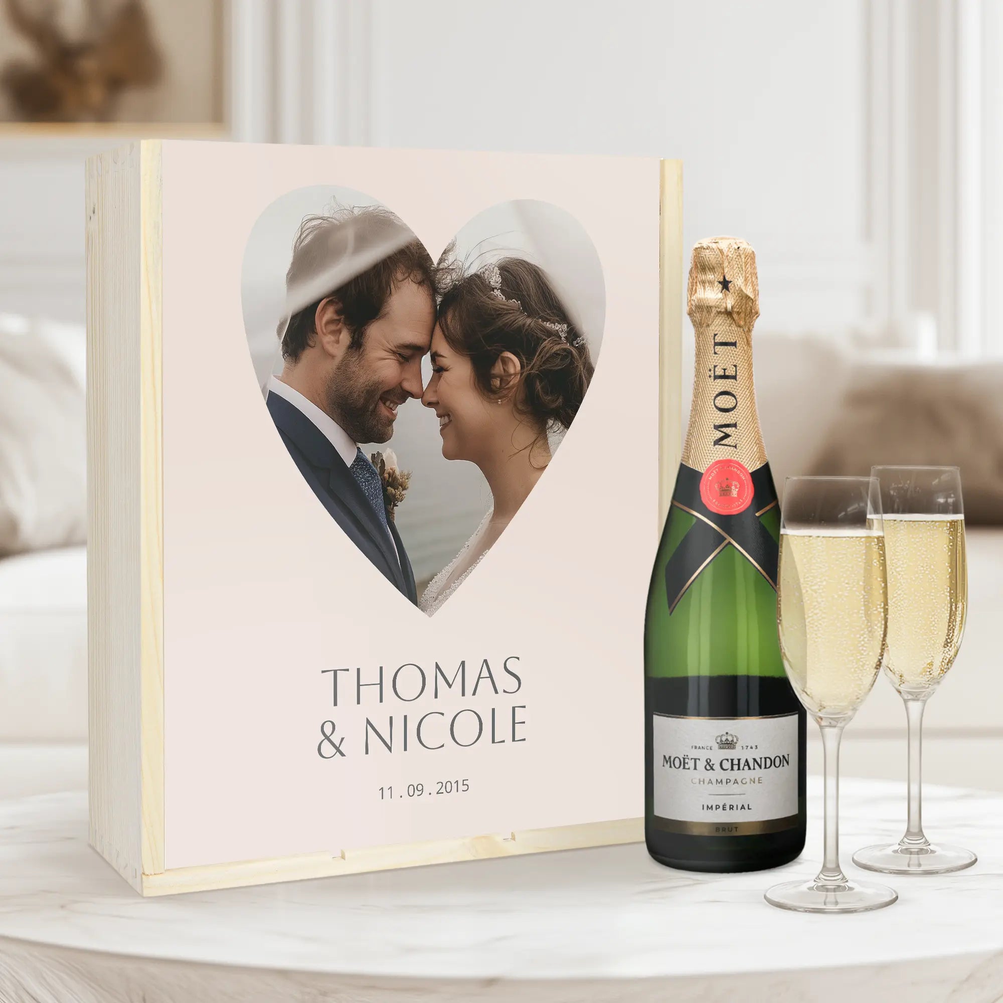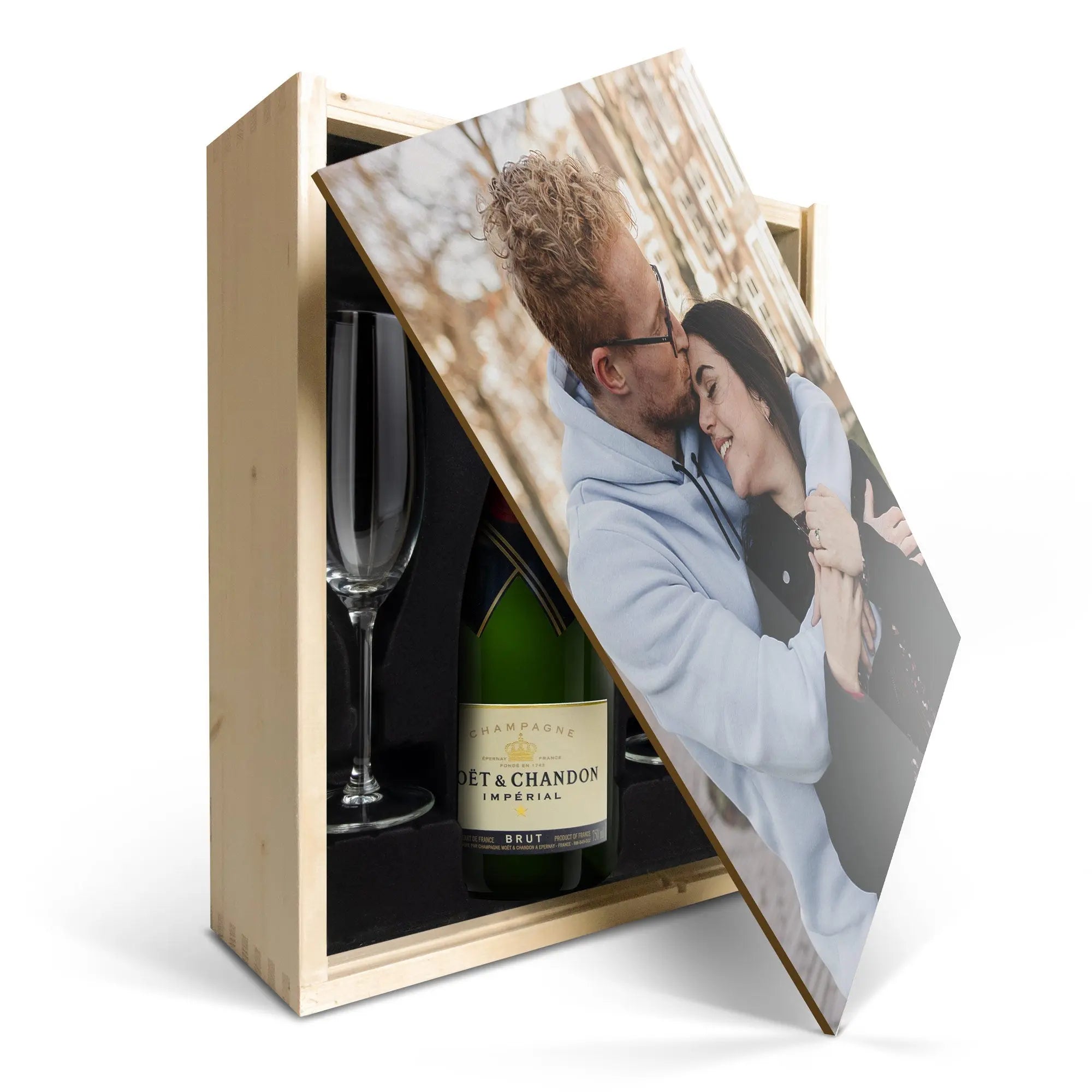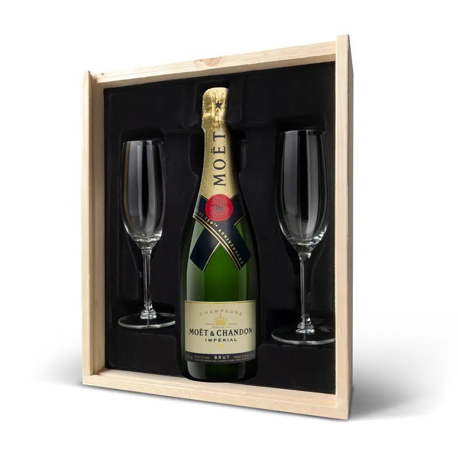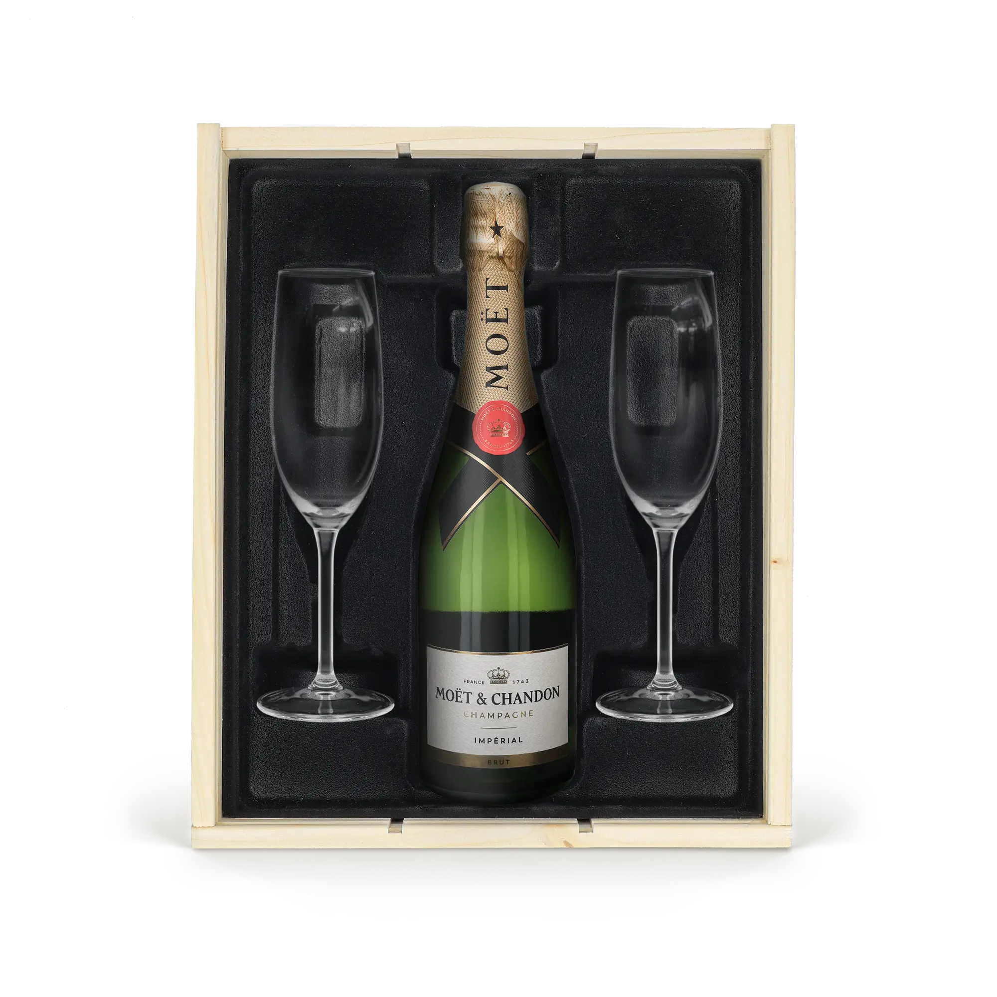 İki kadehli şık bir Moët & Chandon şampanya şişesi. Kendi tasarımınızla kişiselleştirilmiş lüks bir ahşap kutuda. Şerefe!
