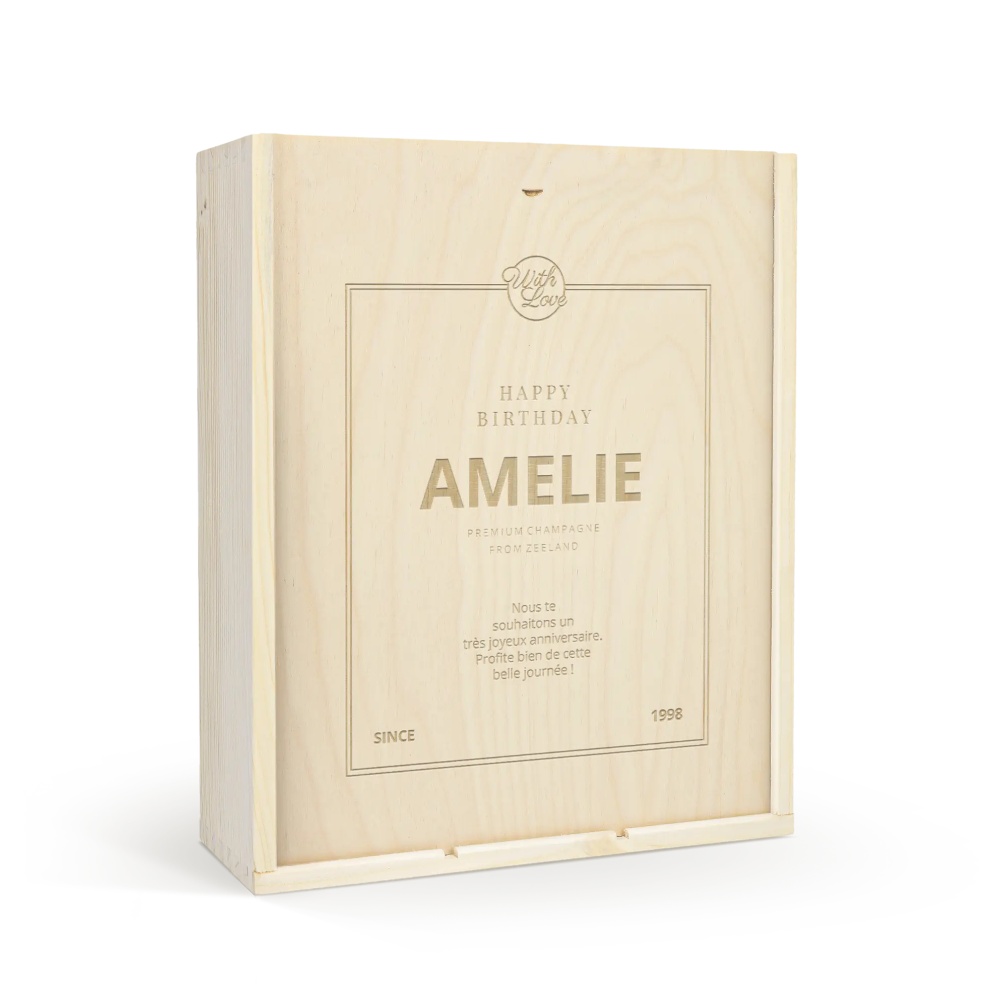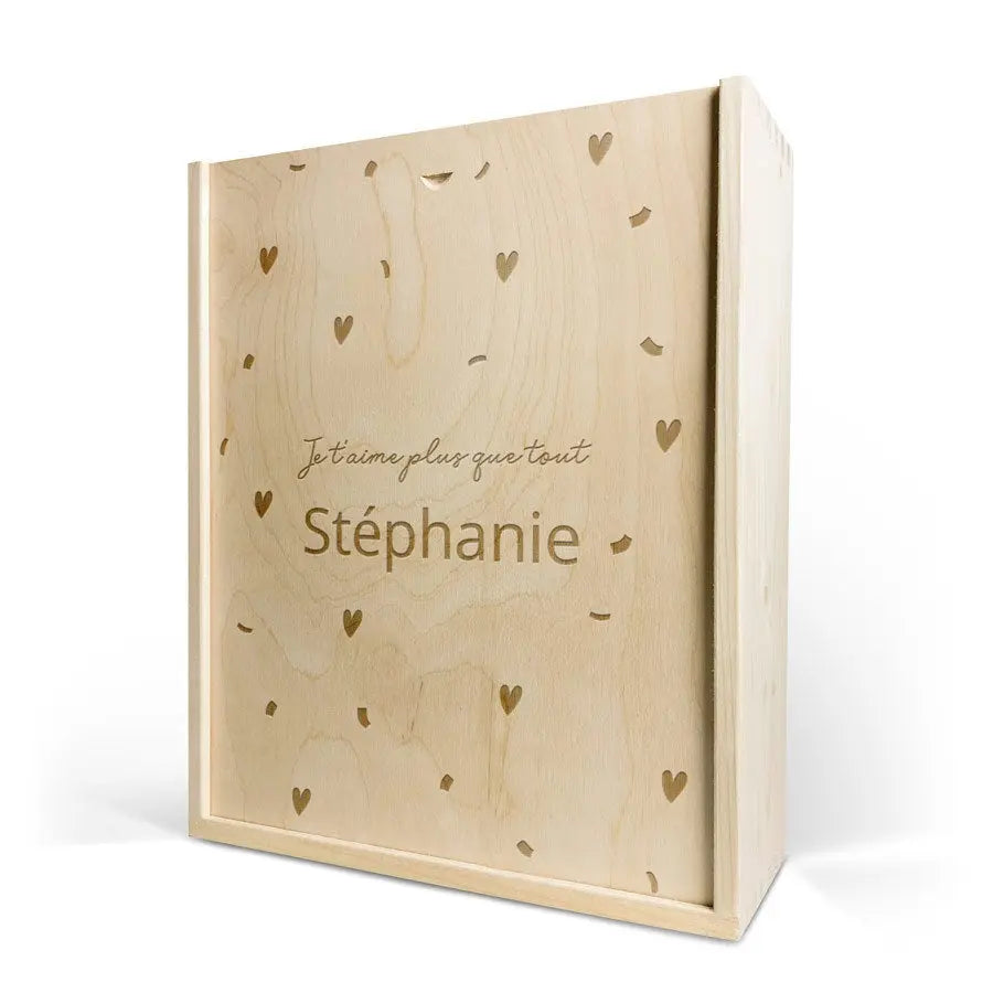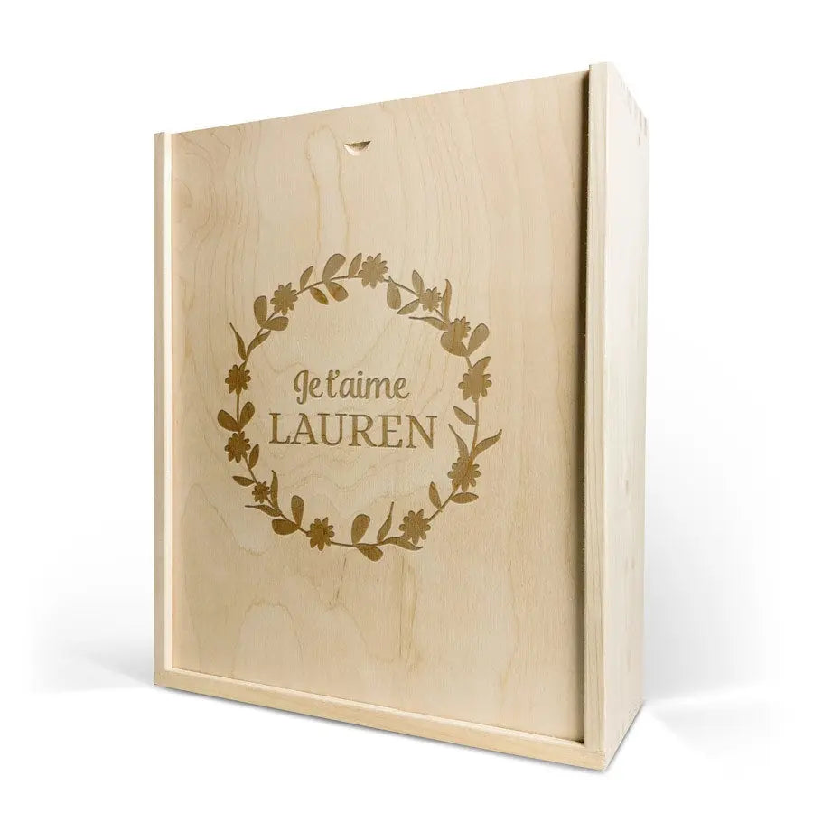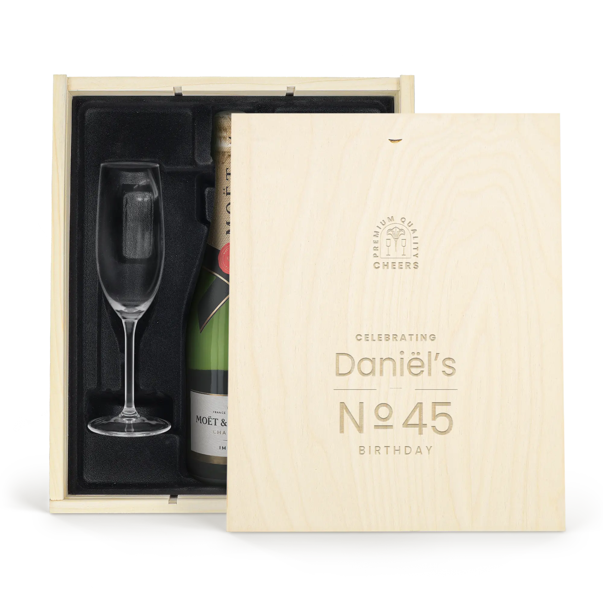 Lezzetli bir Moët & Chandon şampanyası ve iki kadeh. Kendi tasarımınızla süslenmiş lüks, oyma ahşap kutuda. Şerefe!