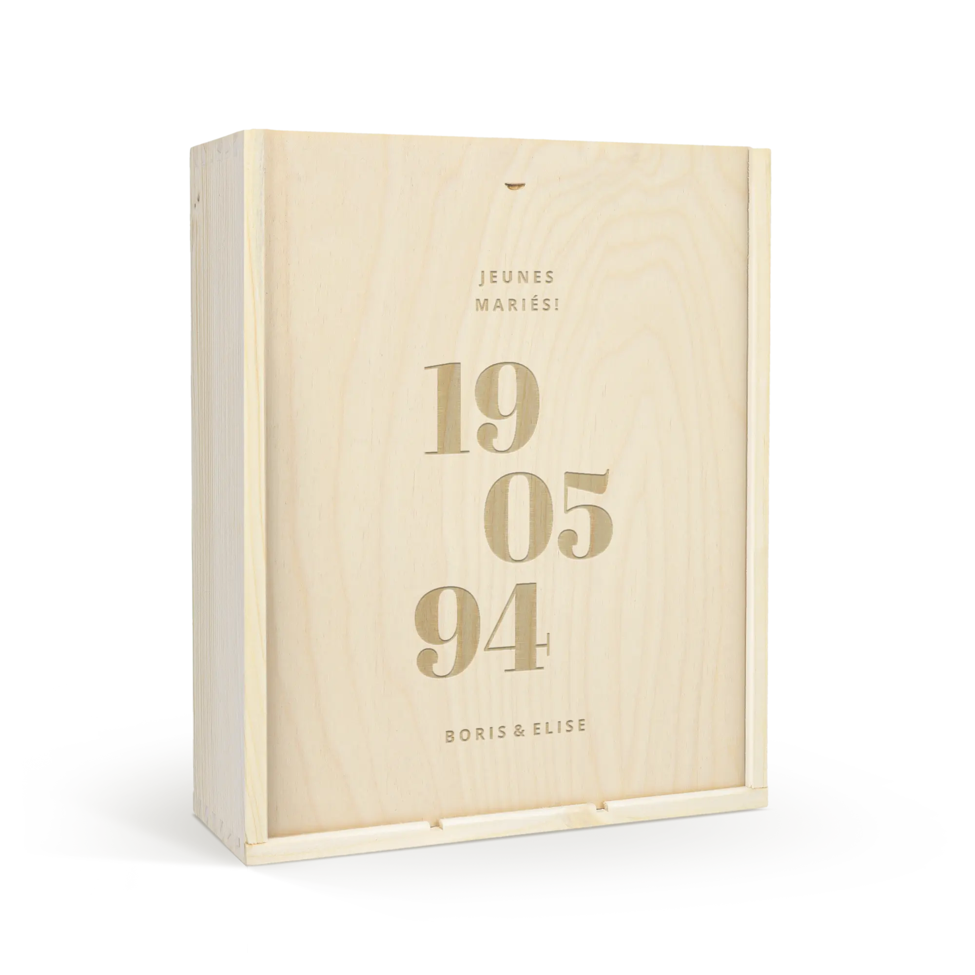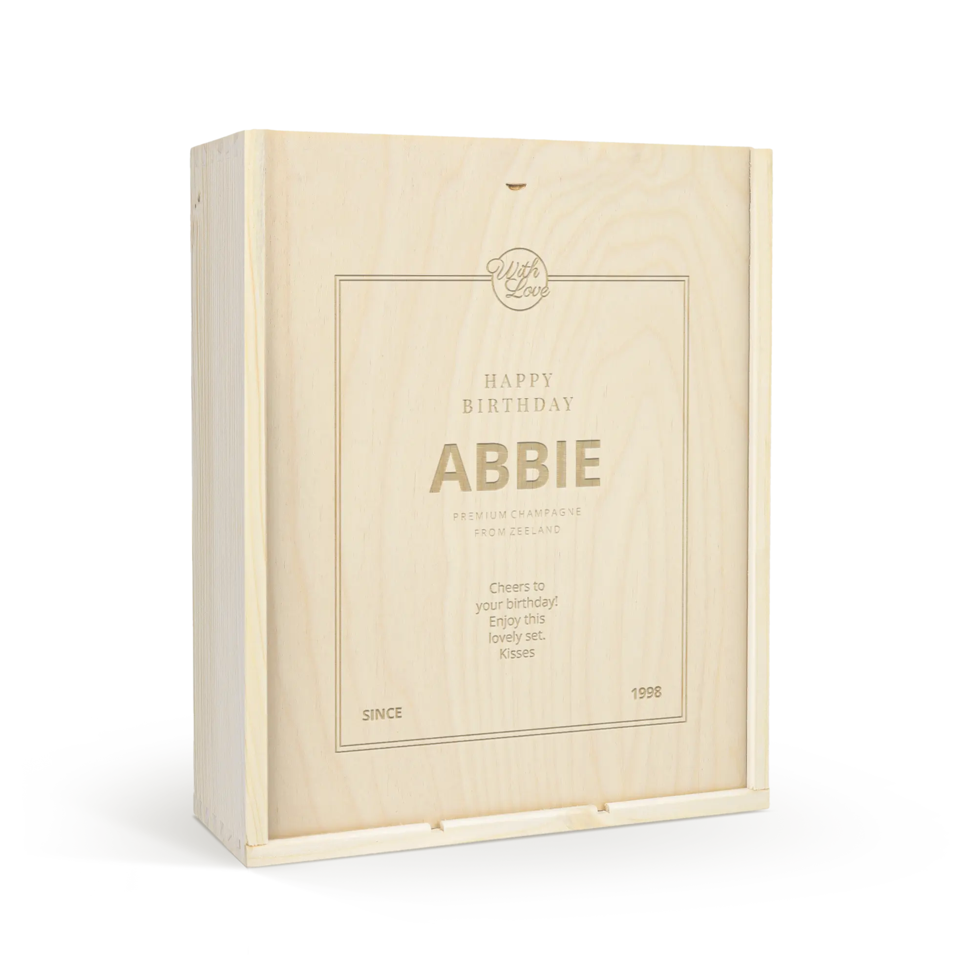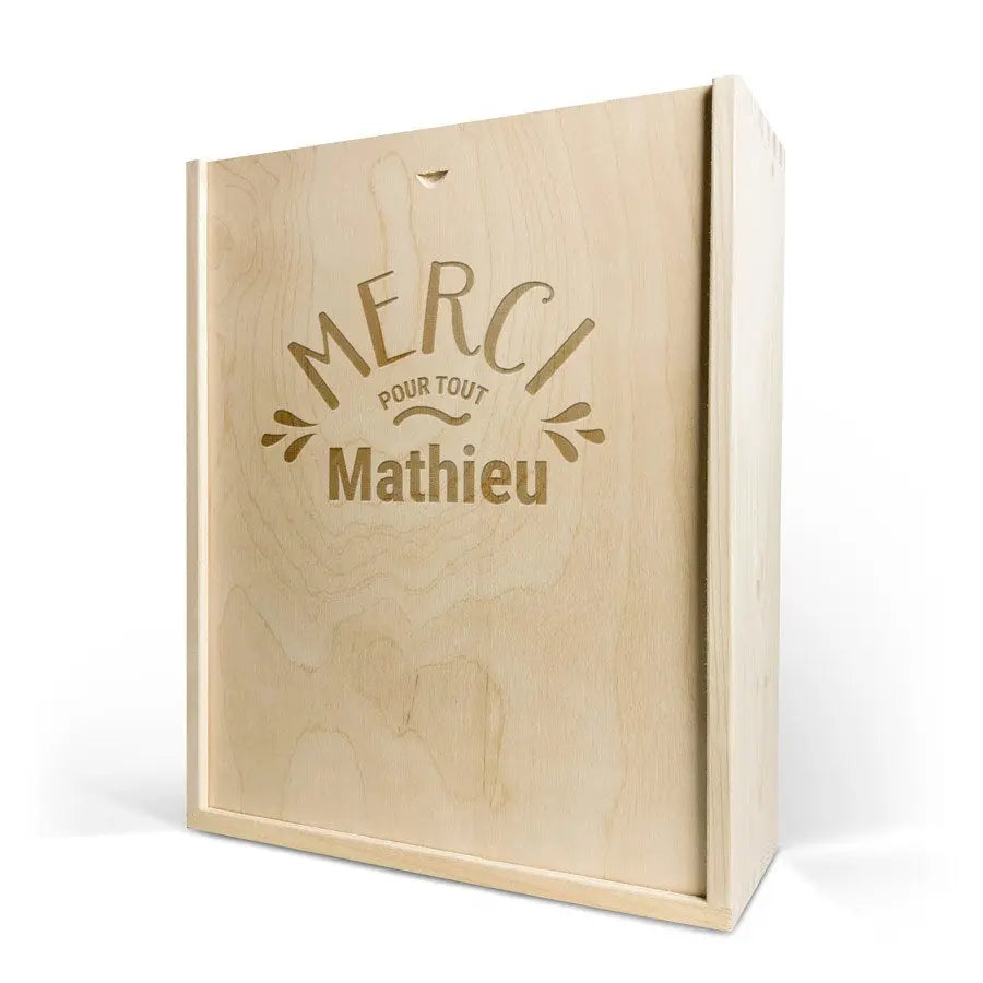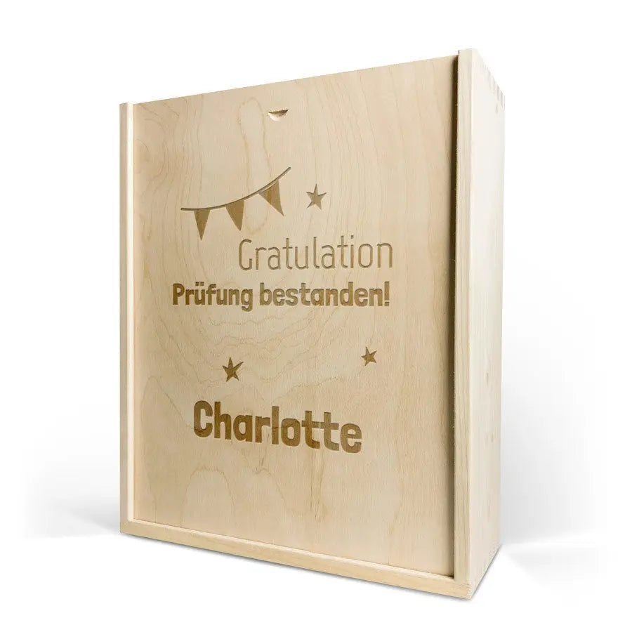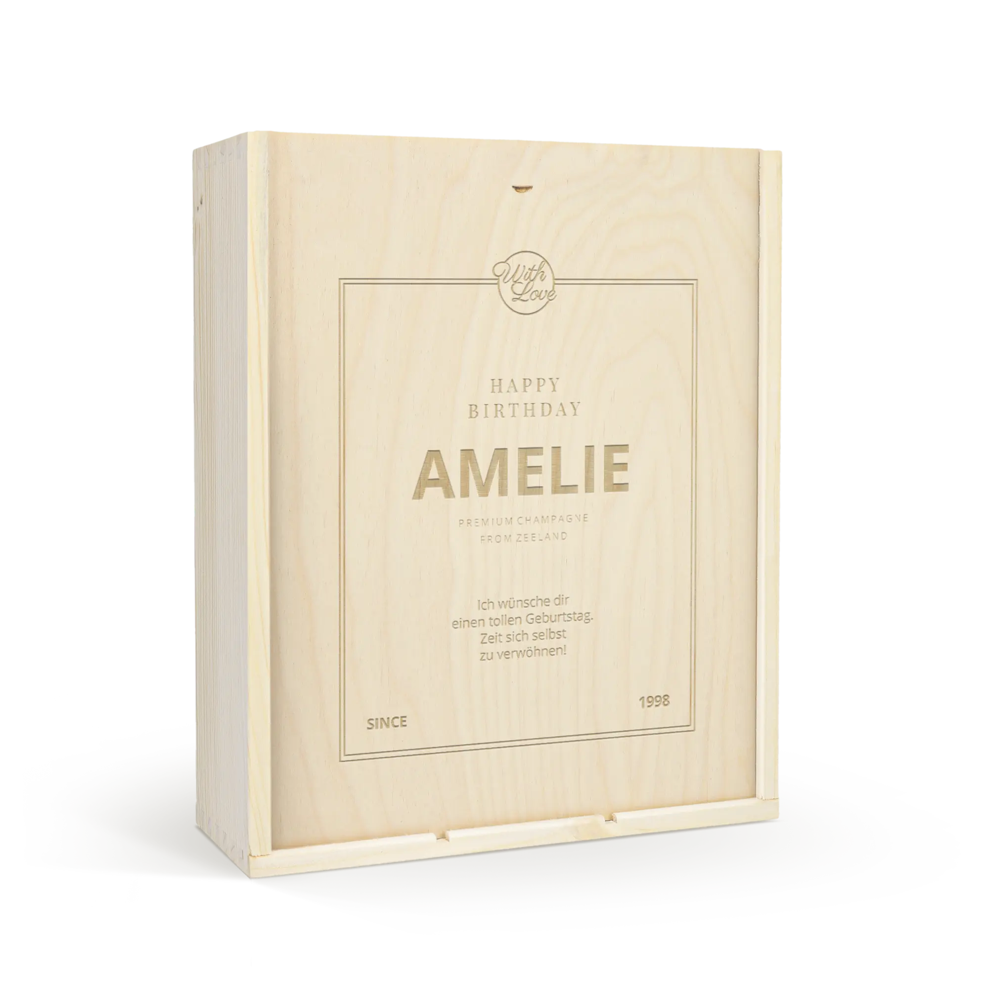 Lezzetli bir Moët & Chandon şampanyası ve iki kadeh. Kendi tasarımınızla süslenmiş lüks, oyma ahşap kutuda. Şerefe!