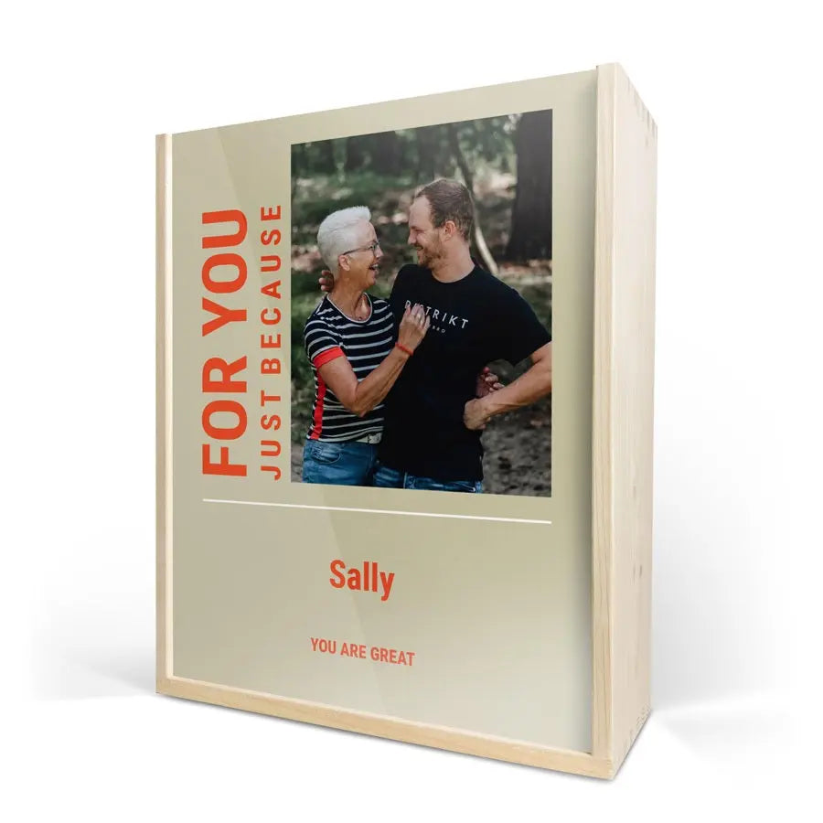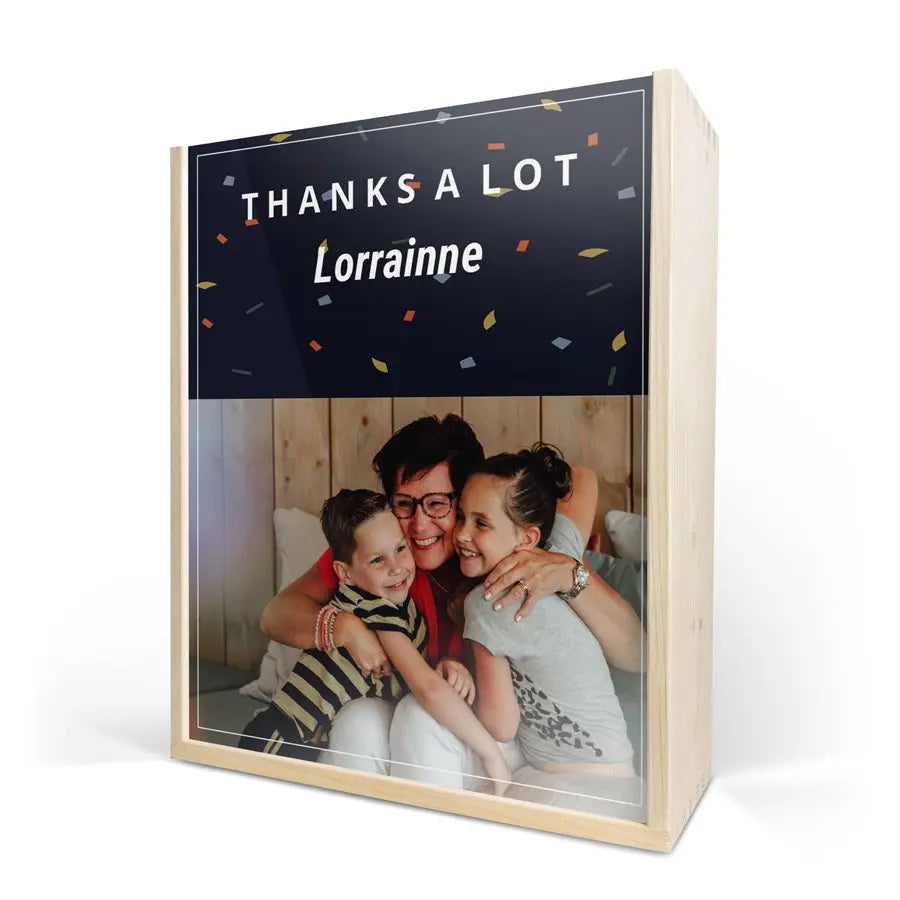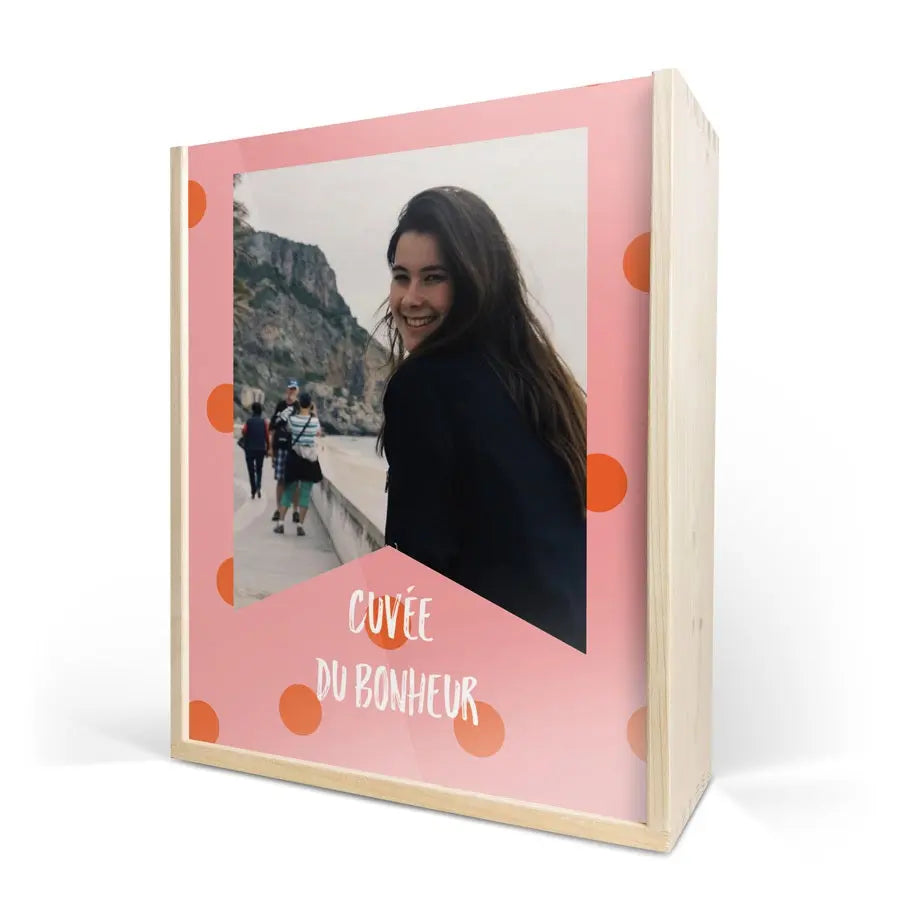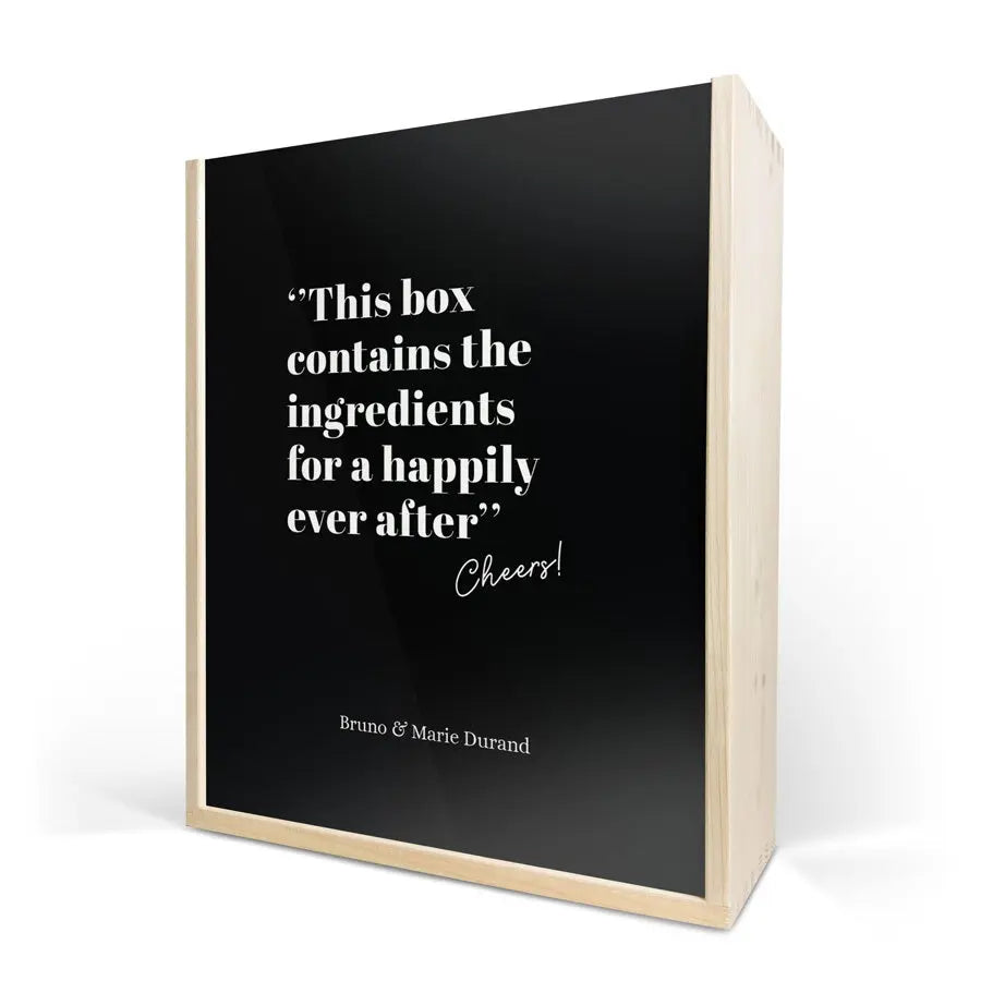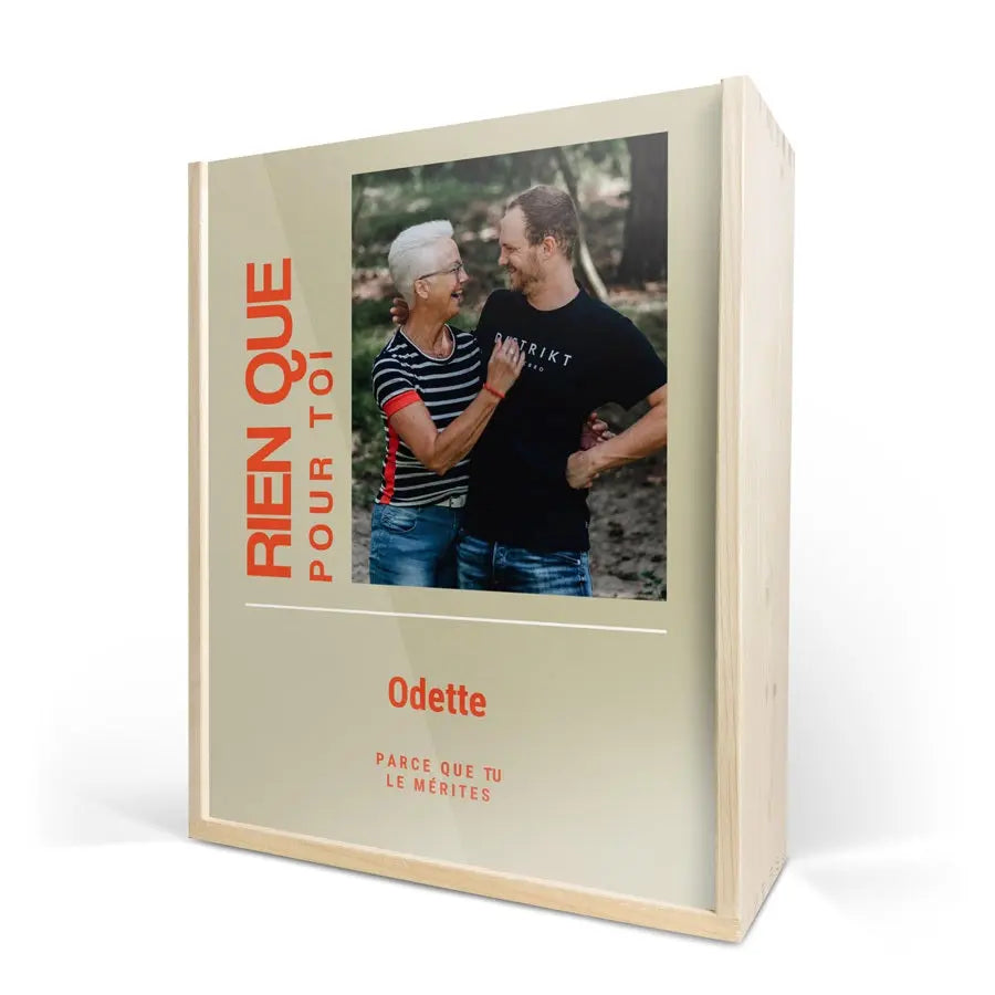 Lüks kişiye özel kutuda lezzetli bir şişe şarap. Seçiminize göre fotoğraf, logo, kolaj, isim ve/veya metin ile kişiselleştirilmiş!