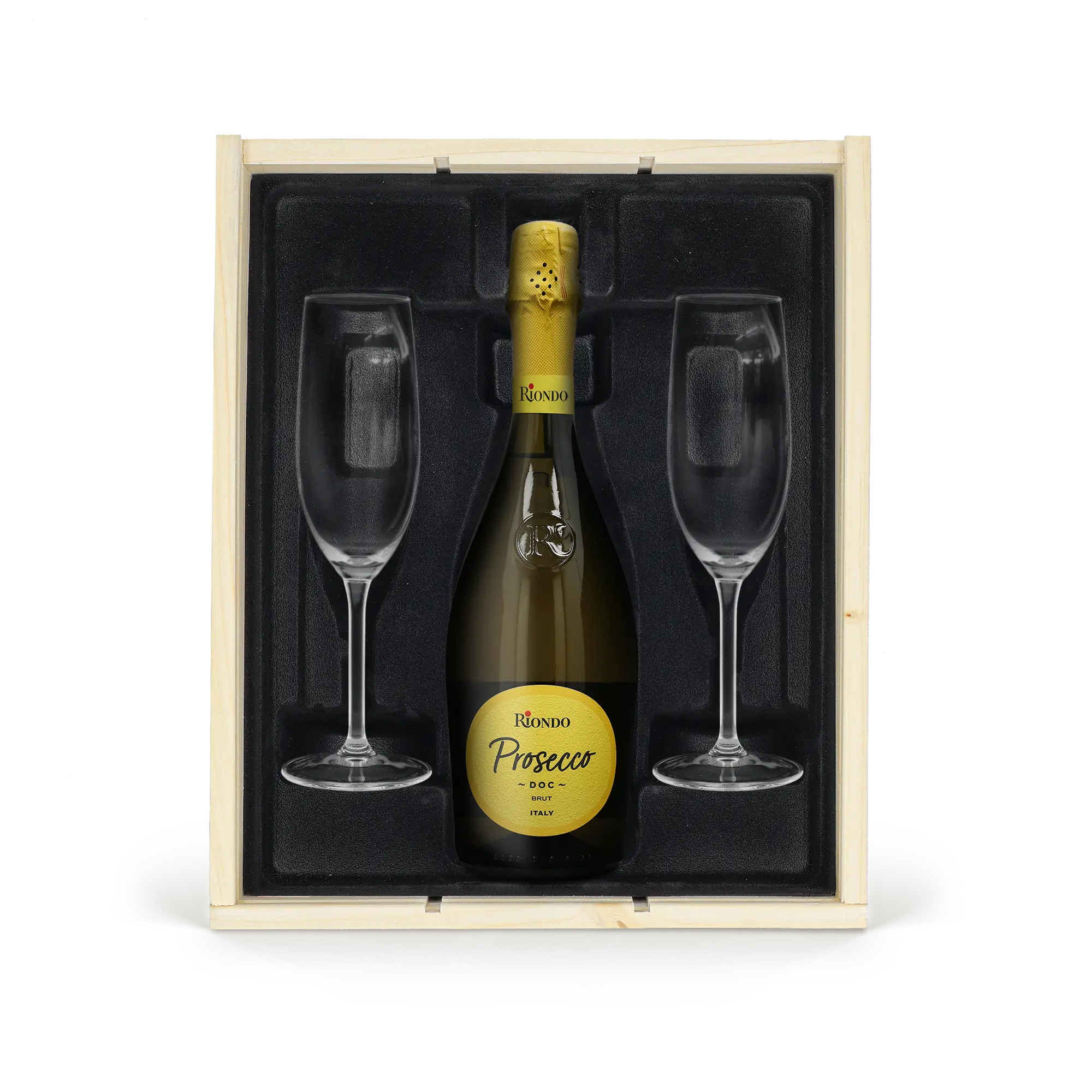 Tamamlayıcılar: Riondo Prosecco (DOC, Ekstra Kurutulmuş), iki zarif cam bira bardağı, özel olarak kazımlı ahşap sunum kutusu, lüks siyah yün iç kaplama.