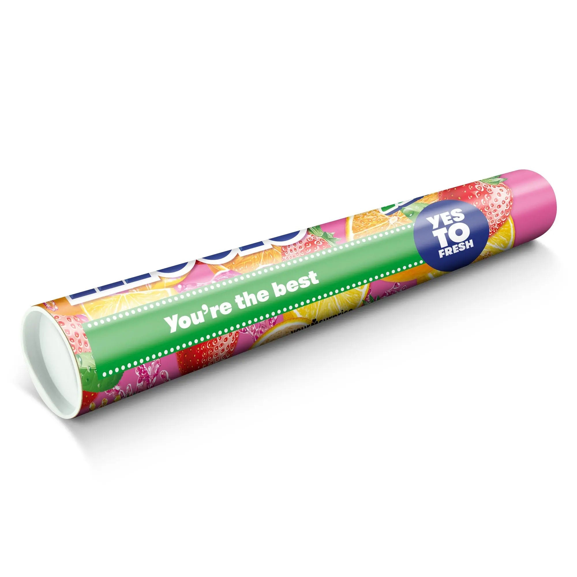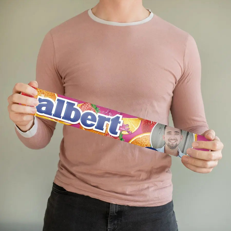 Kendi kişiselleştirilmiş XXL Mentos'unuz, 21 adet Mentos Meyve rulosu ile birlikte! Seçtiğiniz fotoğraf, isim ve/veya metin ile kişiselleştirilmiş!