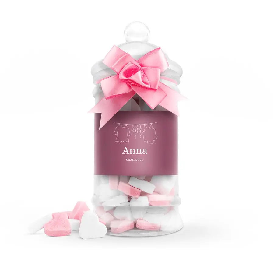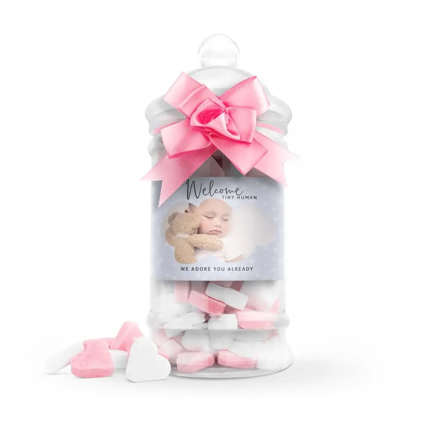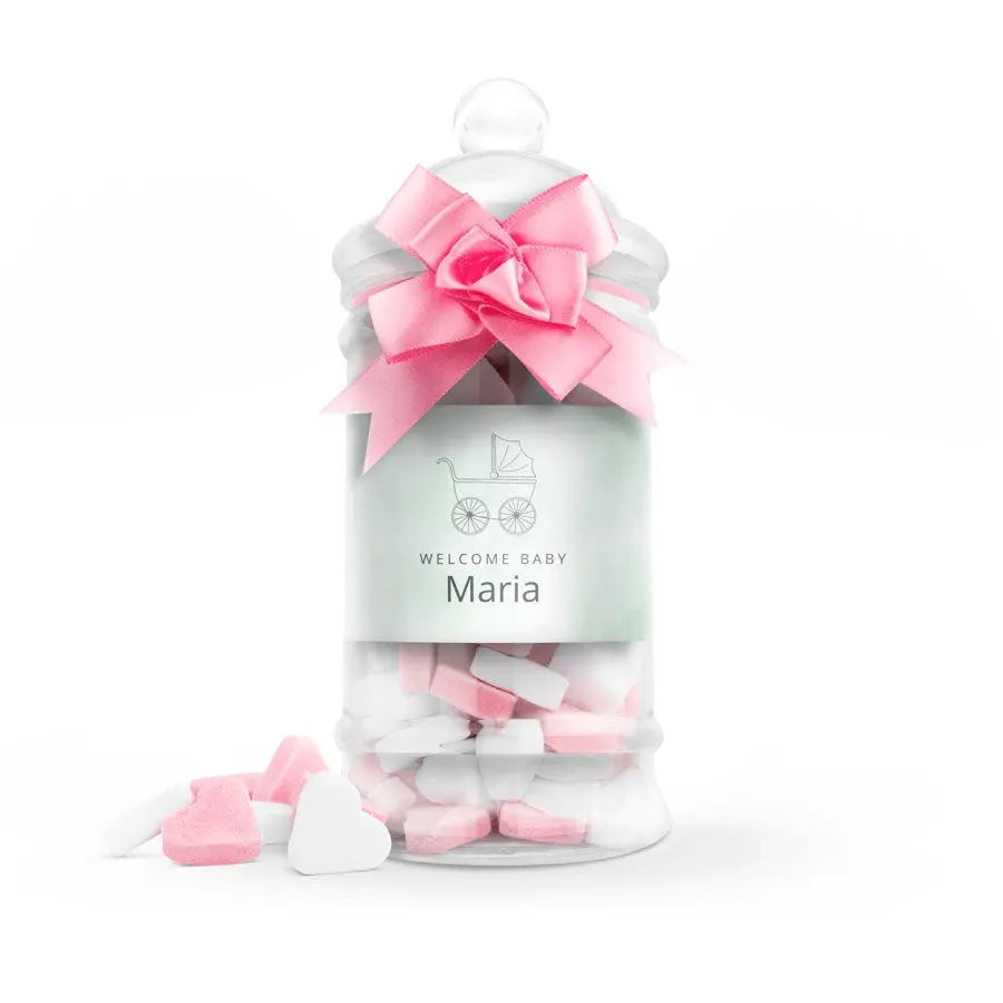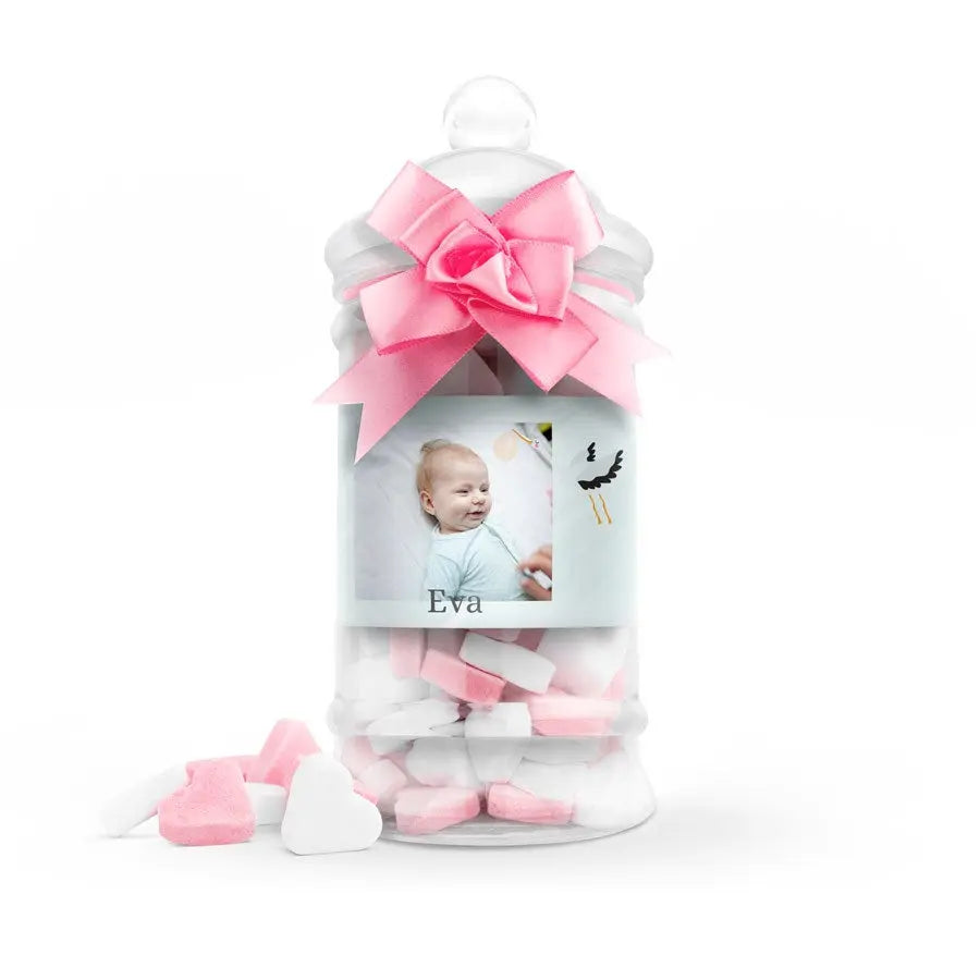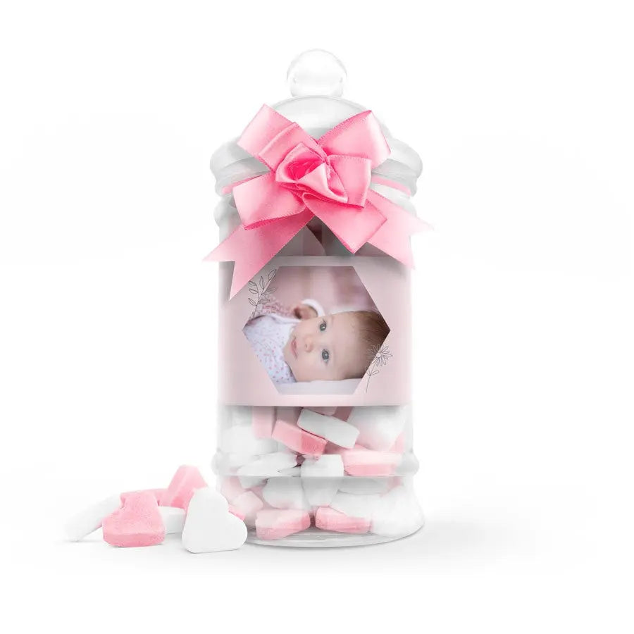 Yeni bir doğumu şık bir şekilde kutlamak mı istiyorsunuz? İçinde kalp şekerleri bulunan bu bebek biberonunu özel bir hediye olarak gönderin. İsimleri, doğum tarihi ve/veya fotoğraflarıyla kişiselleştirebileceğiniz bir hediye.