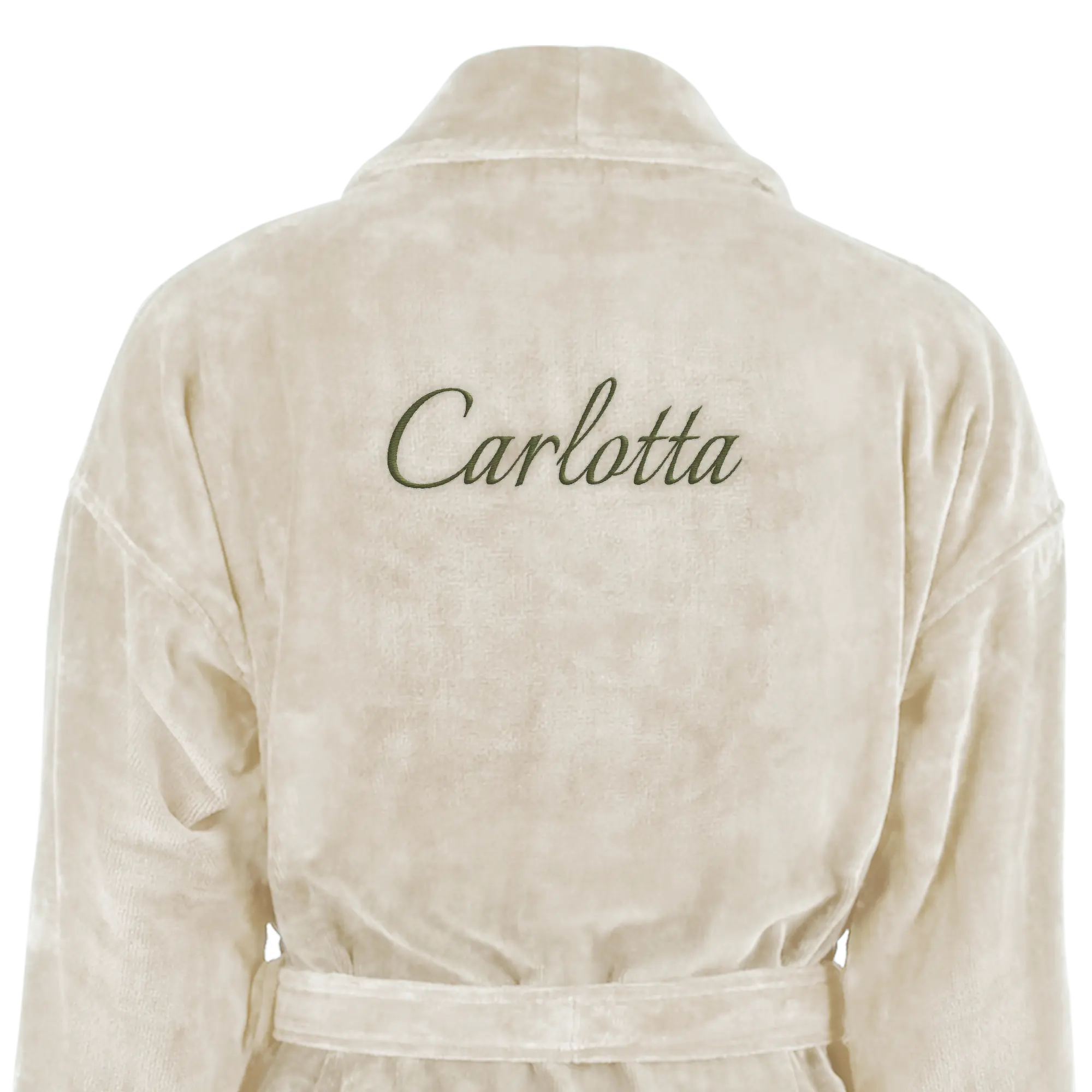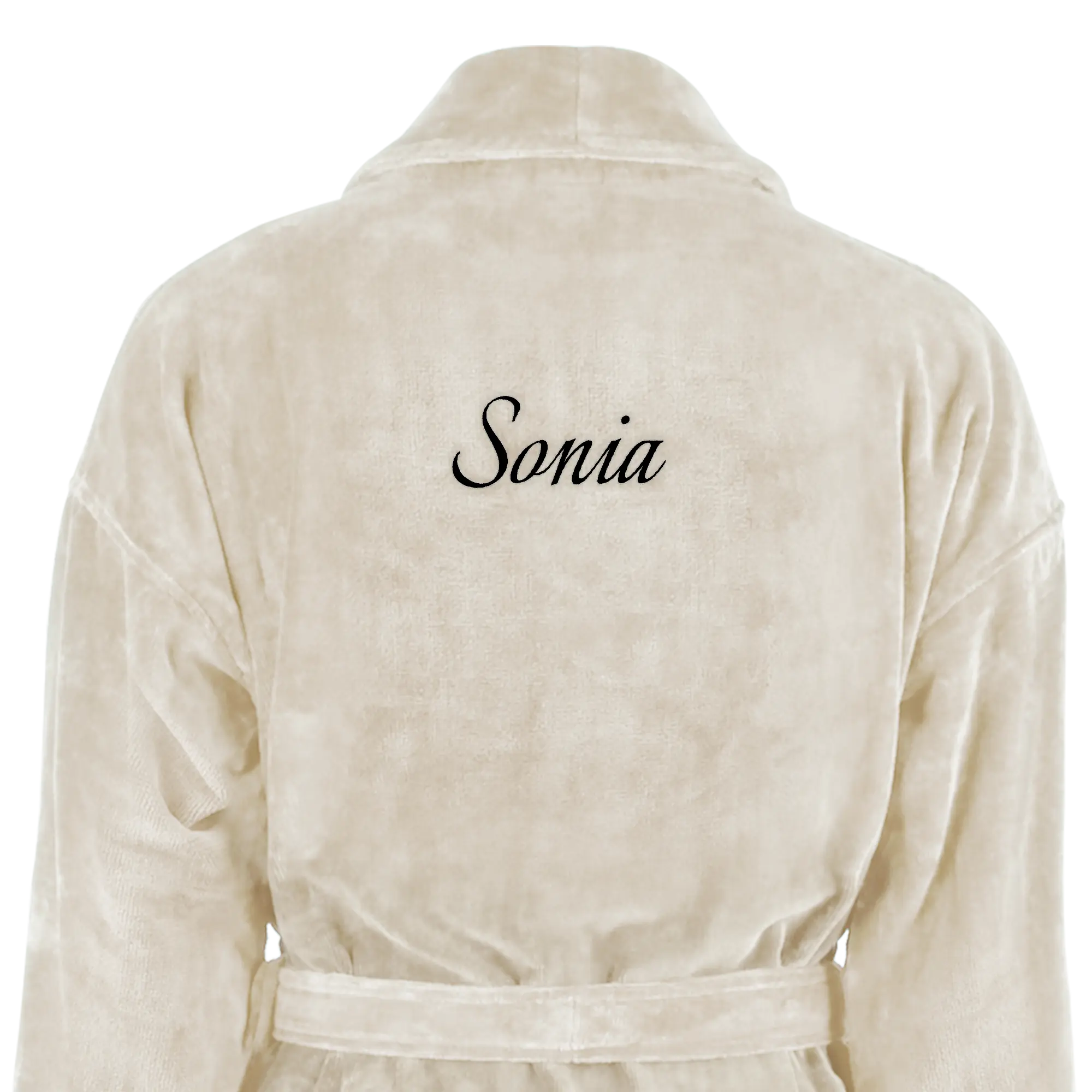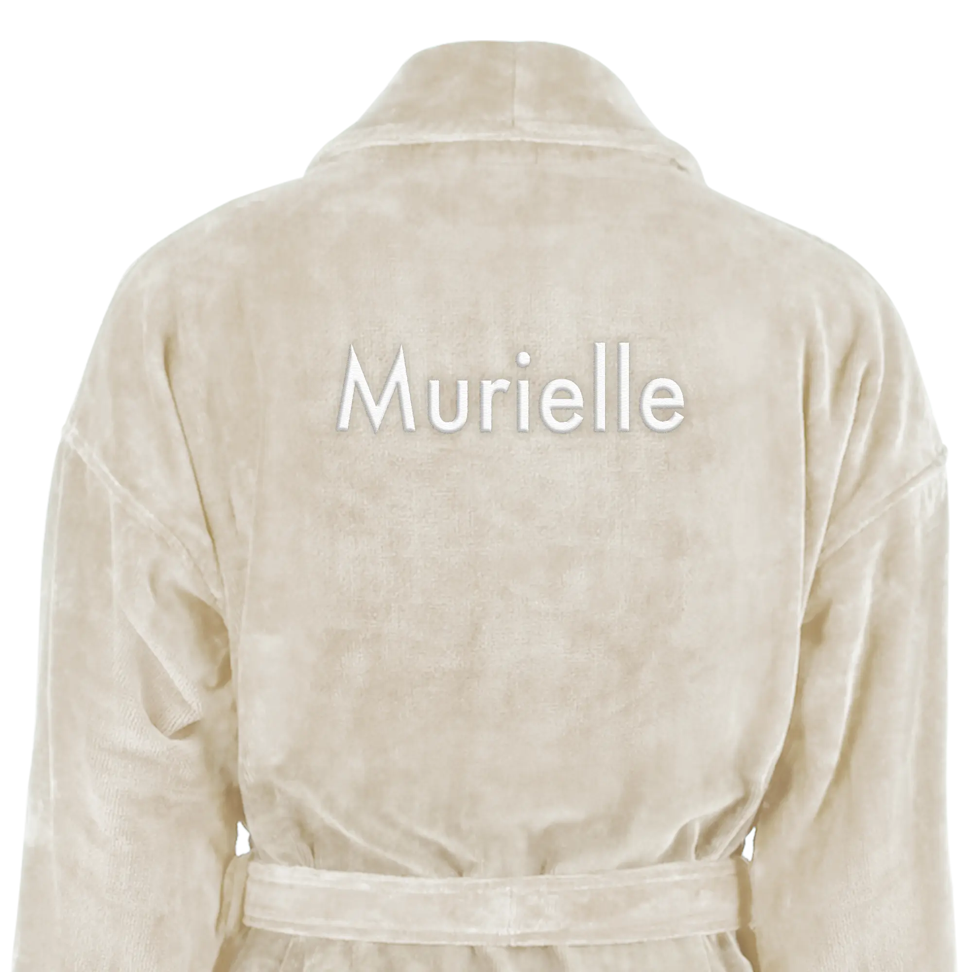 Kadınlar için kişiye özel, istediğiniz isim veya metinle işlenmiş bornoz. Şimdi kendi bornozunuzu oluşturun!