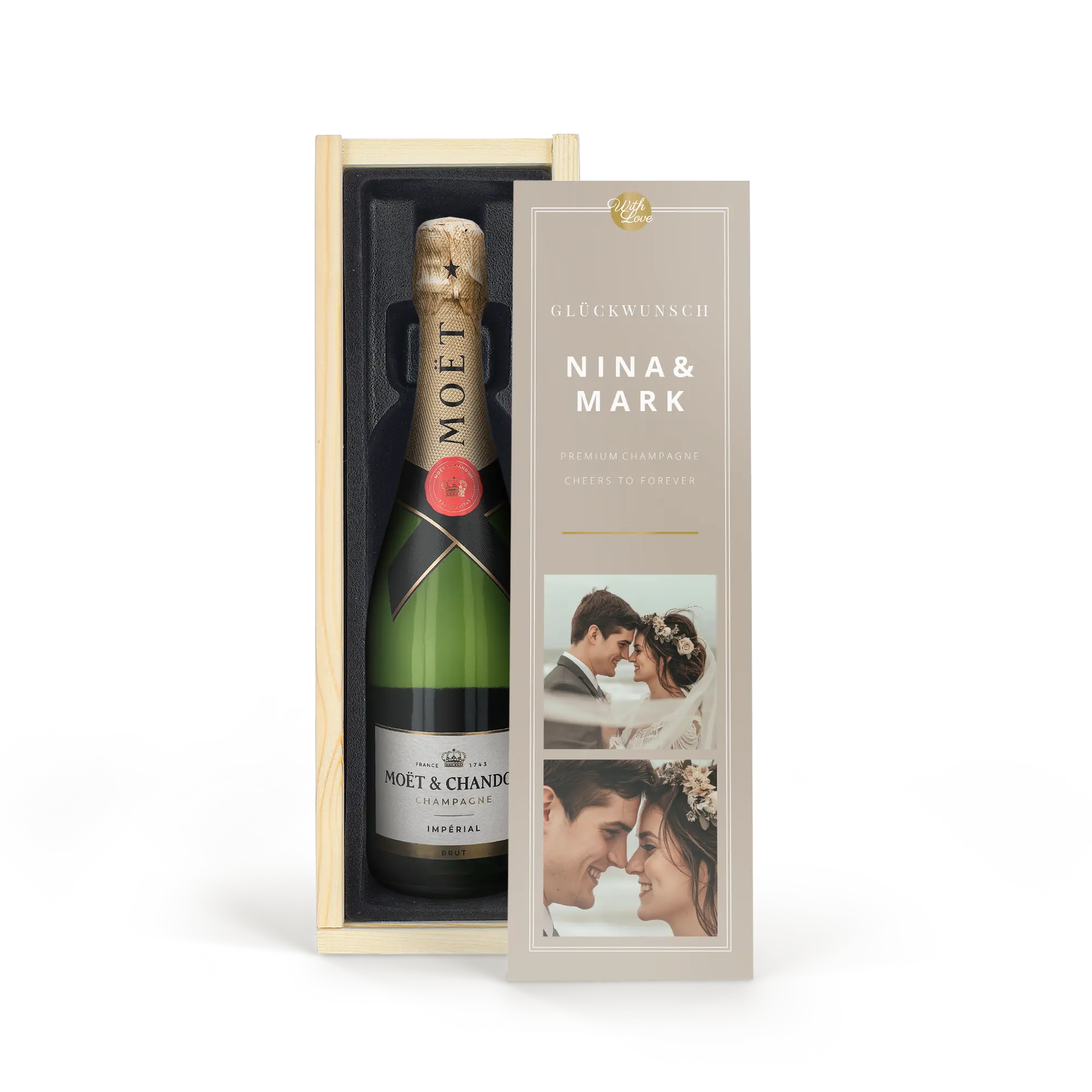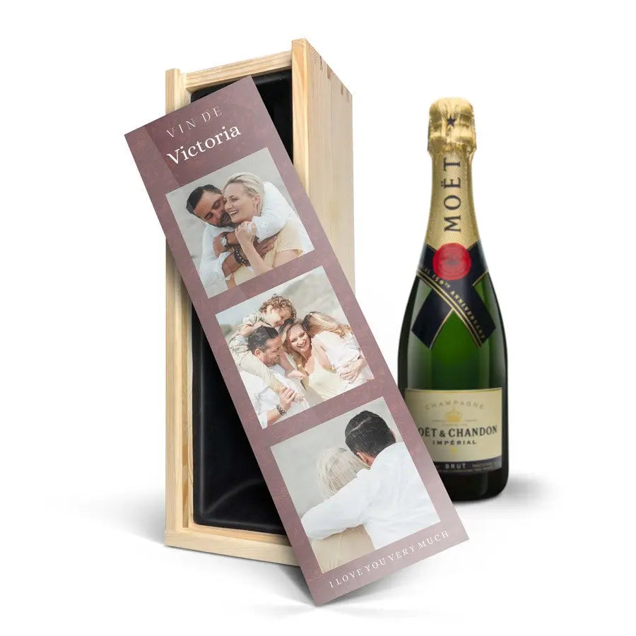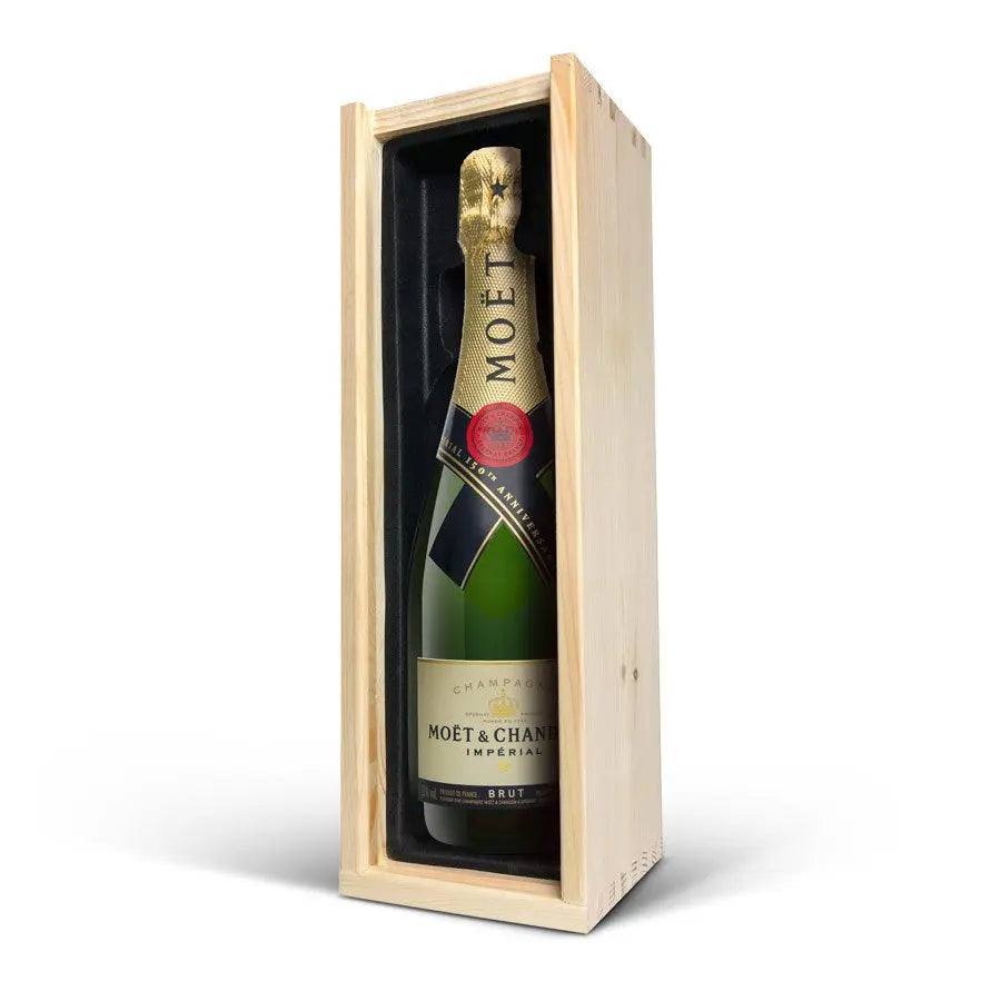 Adınız veya metninizle kişiselleştirilmiş, gerçek Moët & Chandon şampanyası içeren lezzetli bir şişe, ahşap bir kutuda. Farklı şişe boyutları mevcut!