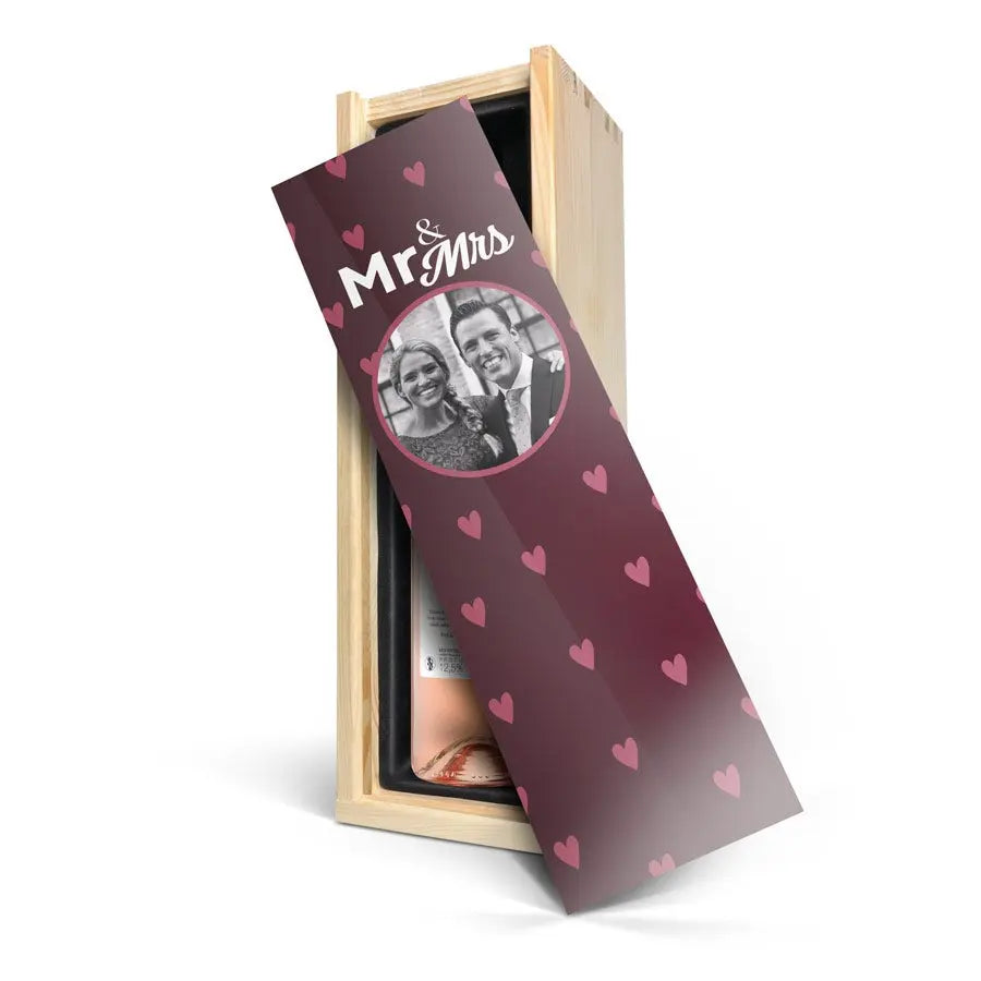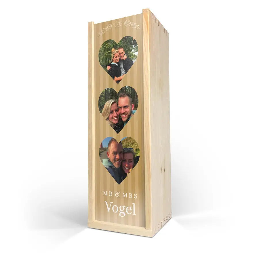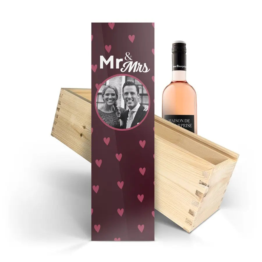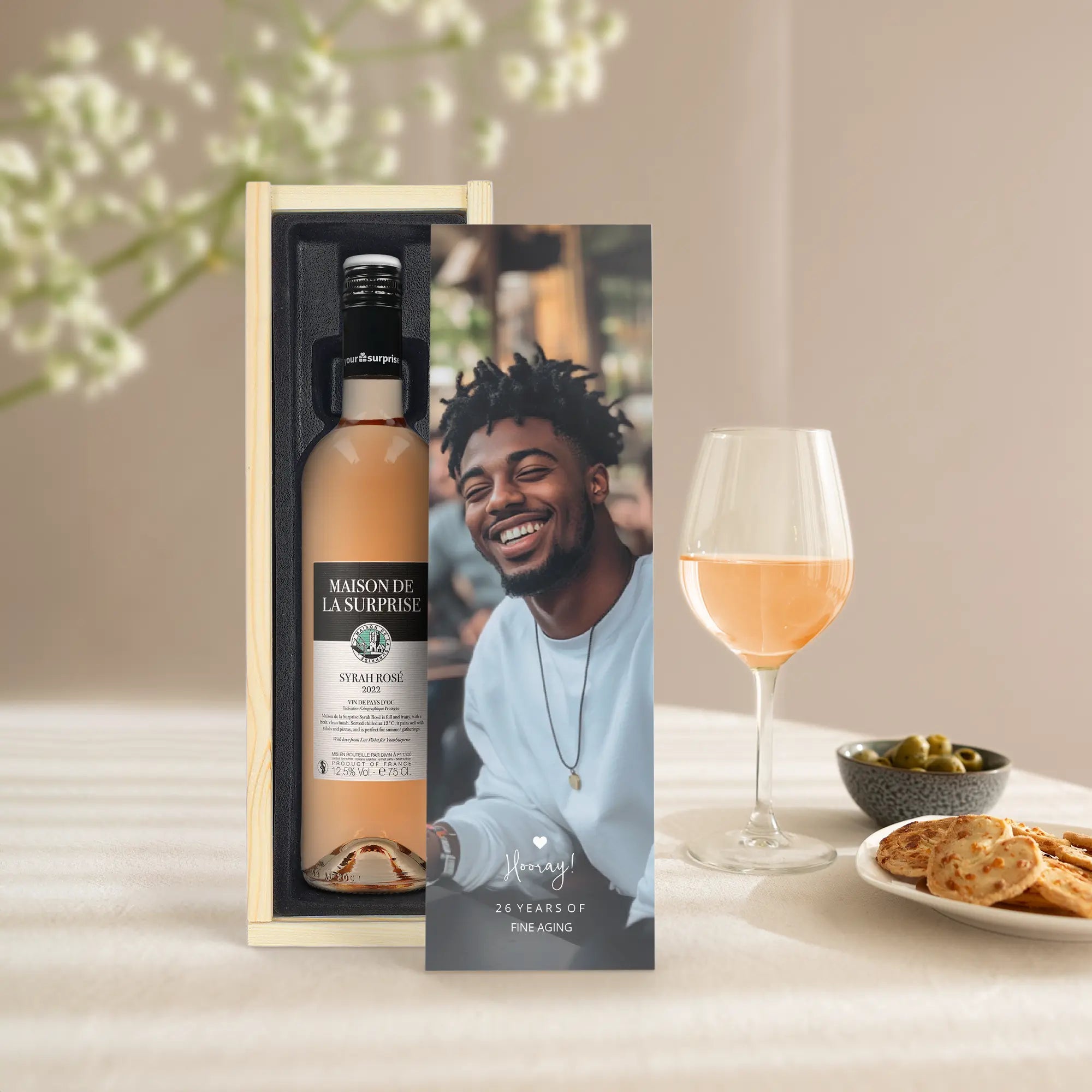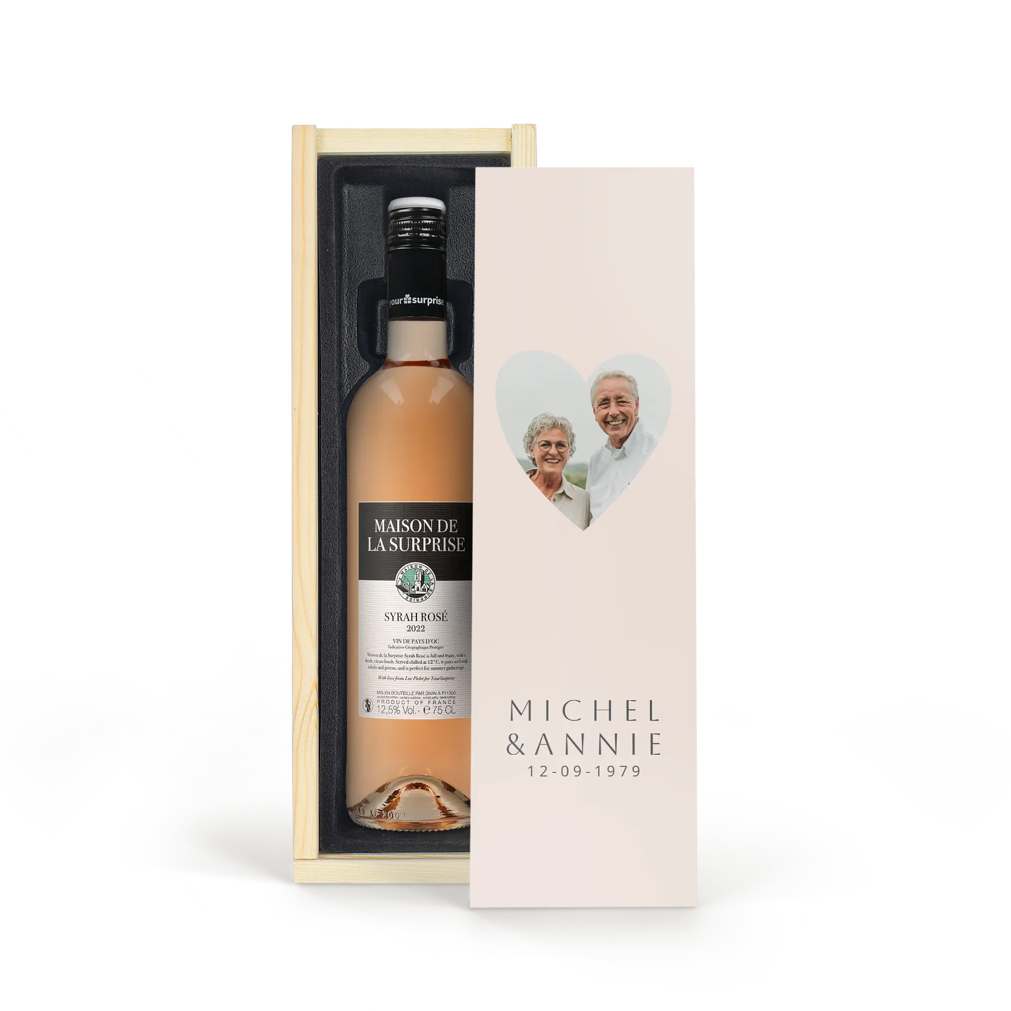 Lezzetli Maison de la Surprise şarabı, seçtiğiniz fotoğraf, logo ve/veya metin ile süslenmiş lüks ahşap kutuda. Şimdi kendi setinizi oluşturun!