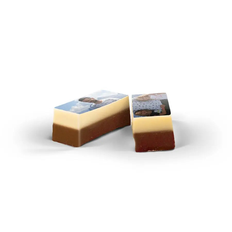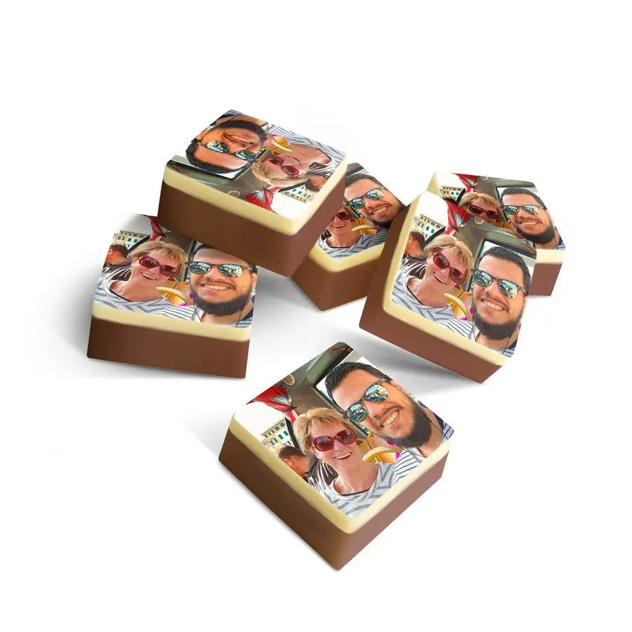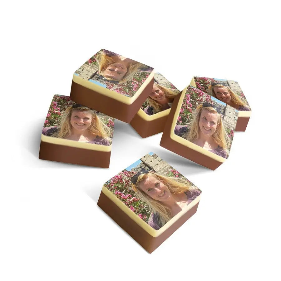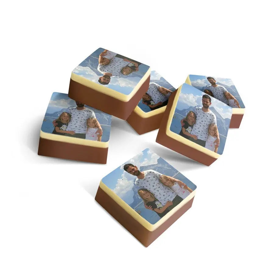 Adet: 48 çikolata Çikolata: sütlü çikolata ve beyaz çikolata kaplamalı çikolata Şekil: kare Çikolata boyutu: 2,6 x 2,6 cm Kişiselleştirme: fotoğraf veya logo ile basılı Baskı: yenilebilir ve tam renkli Sıcaklık 25 derecenin üzerine çıkarsa, siparişinize dondurulmuş bir ürün eklemenizi öneririz. İçindekiler: Sütlü çikolata: şeker, kakao yağı, tam süt tozu, kakao kütlesi, emülgatör (soya lesitini), doğal vanilya aroması. En az %34 kakao katı. Beyaz çikolata: şeker, kakao yağı, tam süt tozu, emülgatör (soya lesitini), doğal vanilya aroması. En az %29 kakao katı. Saklama önerisi: Çikolataları 14-18°C sıcaklıkta serin, karanlık bir yerde 10 haftaya kadar saklayabilirsiniz. Alerjen bilgisi: soya, süt içerir. Her çikolatanın boyutu 2,6 x 2,6 cm'dir. Boyut çikolatadan çikolataya hafifçe değişiklik gösterebilir.