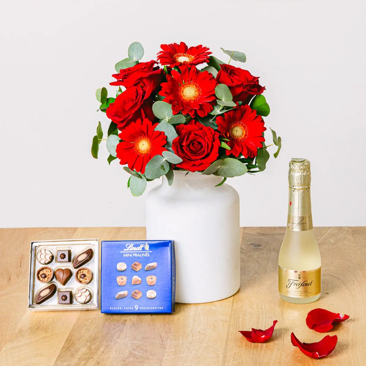 Çiçek aranjmanının yanında, bir şişe premium Freixenet cava yer alıyor. Seçkin kalitesiyle bilinen bu köpüklü şarap, taze ve ferahlatıcı bir tat sunarak hem büyük hem de küçük kutlamalar için idealdir. Bir kadeh ile eşleştirildiğinde, paylaşılan neşe ve festivite anları sağlar. Biraz şımartma katmak için, hediye setinde Mini Lindt Pralineleri de bulunmaktadır. Usta çikolata ustaları tarafından hazırlanan bu gurme çikolatalar, çeşitli lezzetler ve dokular sunarak her ısırıkta lüks bir tat deneyimi sunar. Bu tamamlayıcı set, doğum günleri, yıldönümleri veya kutlanmaya değer her özel an için neşe ve zarafet getirmek üzere özenle hazırlanmıştır. Bu yüksek kaliteli hediyeyi sevdiklerinizle paylaşın ve unutulmaz anılar yaratın.
