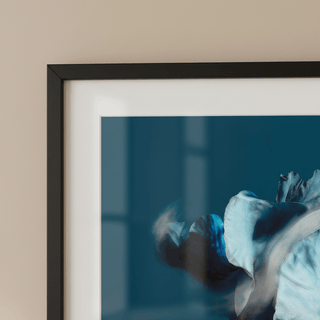 Hareket ve tazelikle dolu, girdap gibi mavi, çiçeklerden ilham alan bir figür. Canlı ve neşeli bir jest.