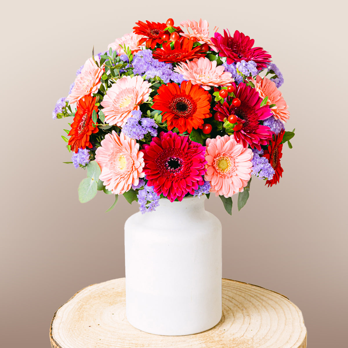 Yoğun tonlar tutkuyu yansıtırken, gerberalar neşe ve mutluluğu temsil eder. Bu düzenleme, samimi duyguları ifade etmenin en renkli yoludur.