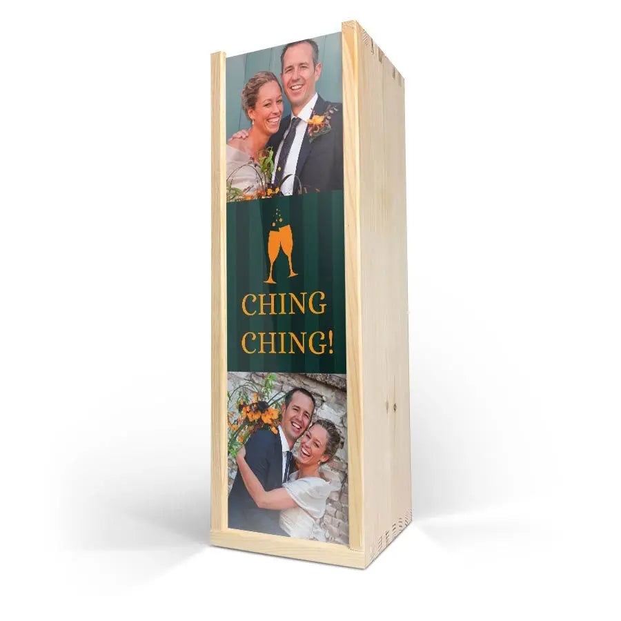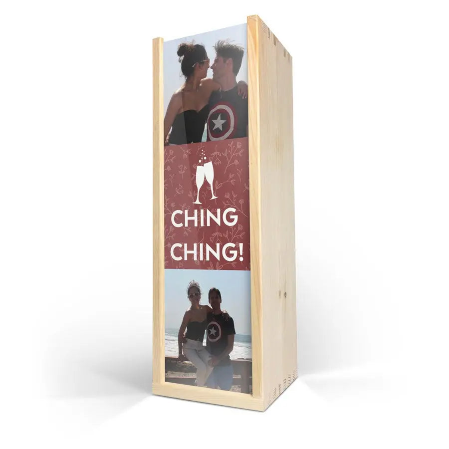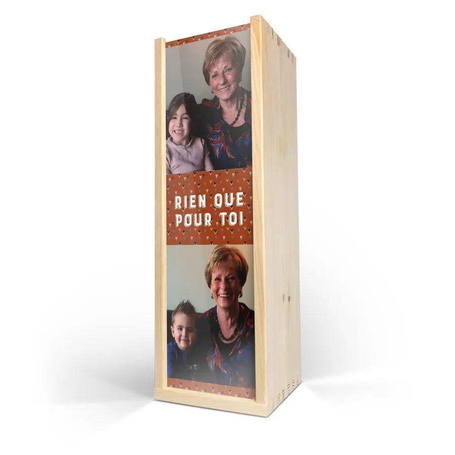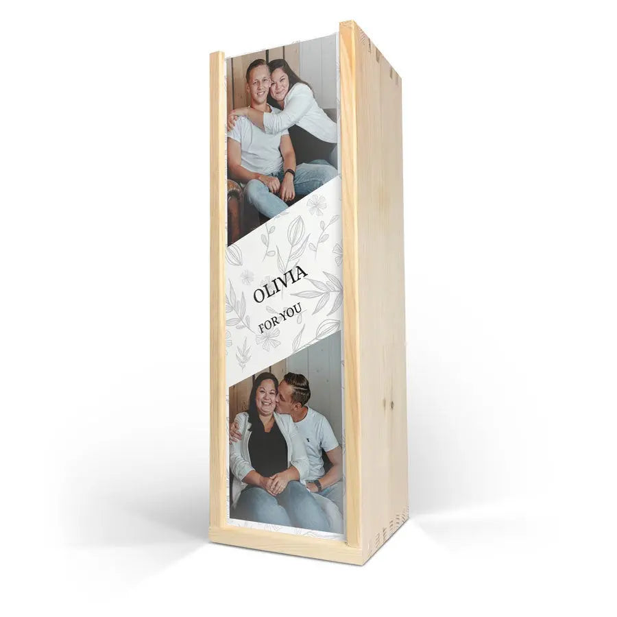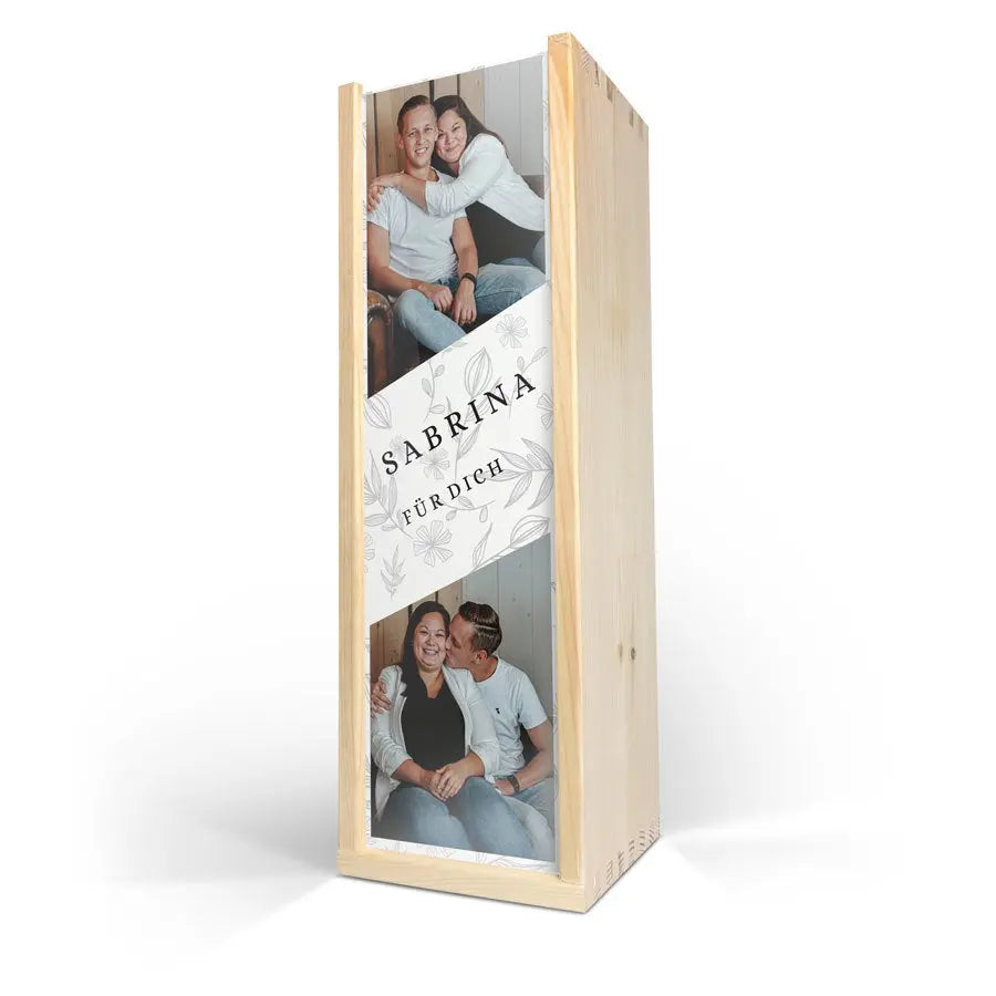 Tamamlayıcılar: Dayanıklı ahşap şarap kutusu, İkili Şarap konseptiyle özel fotoğraf bantları, standart bir şarap şişesi için alan (içinde bulunmaz).