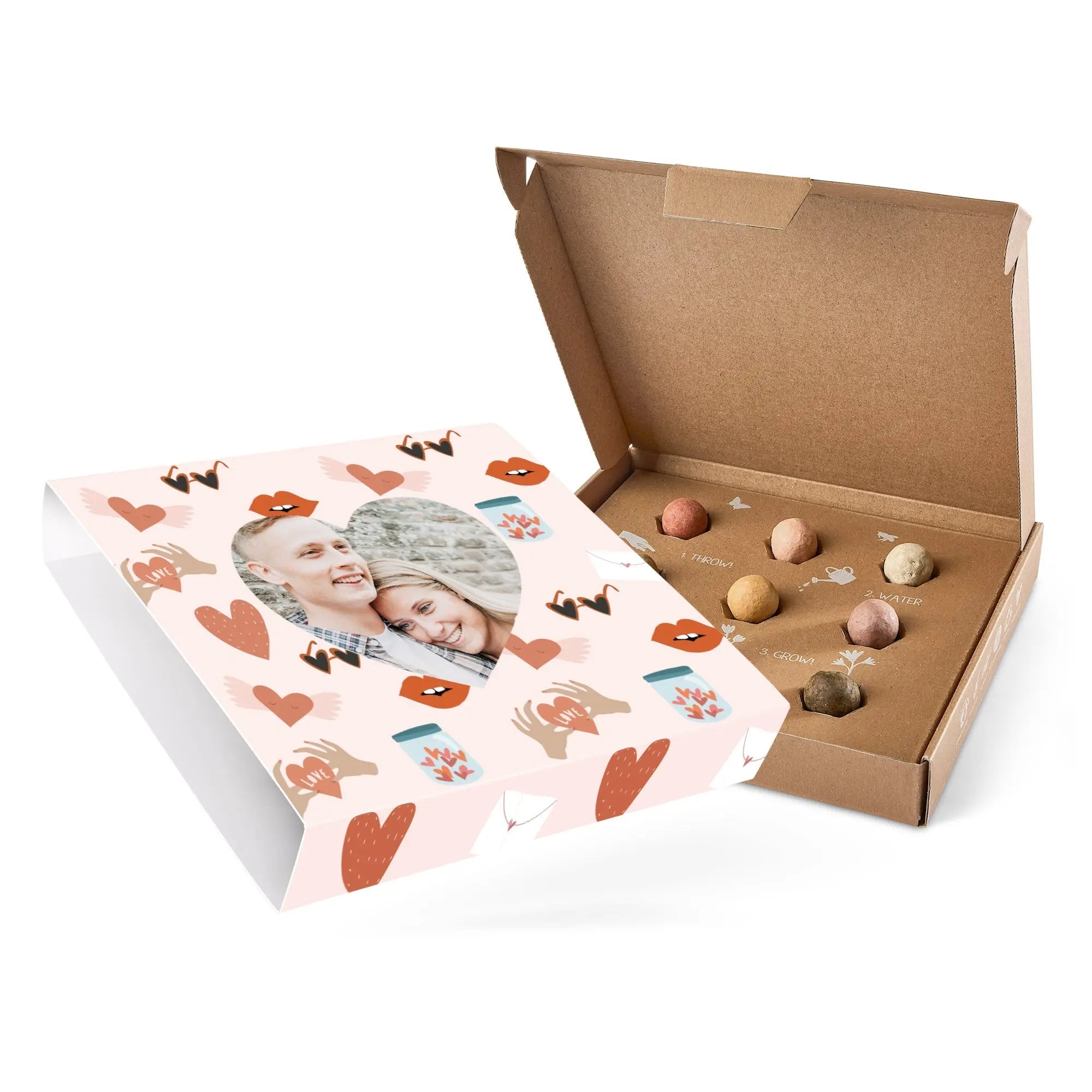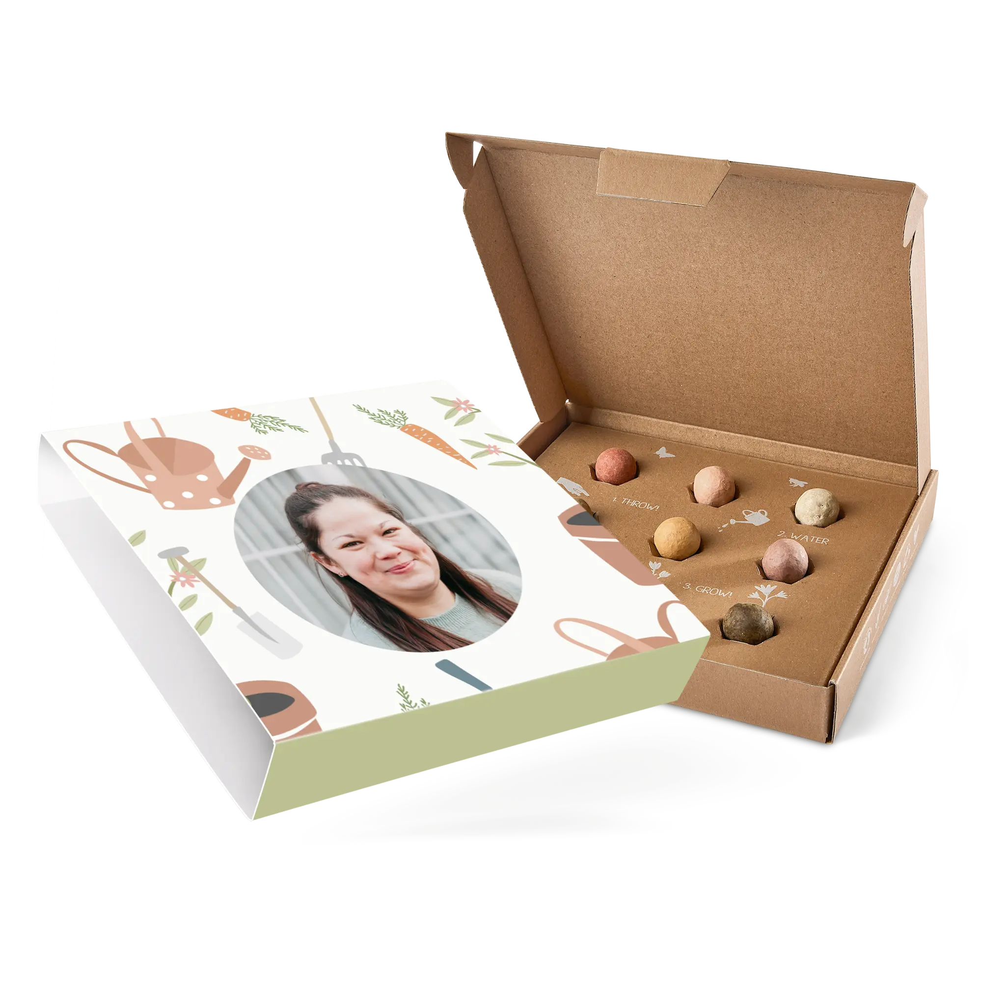 Yerli çiçek tohum bombaları hediye kutusu, seçtiğiniz fotoğraf ve/veya metinle kişiselleştirilmiş kapak ile. Şimdi kendi tasarımınızı oluşturun!