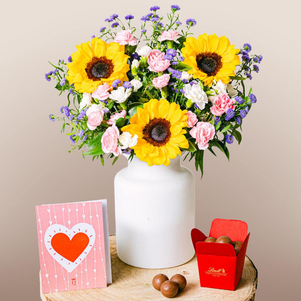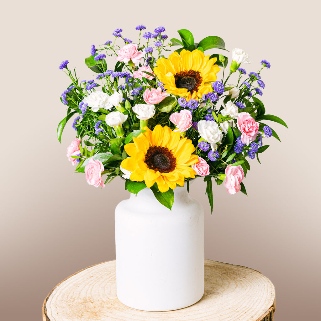 Ayçiçeklerinin enerjisi ve statice'in dinginliği bir araya gelerek pozitif duyguları harekete geçirir. Bu buket, neşeyi ve sıcaklığı ifade etmenin mükemmel yoludur.