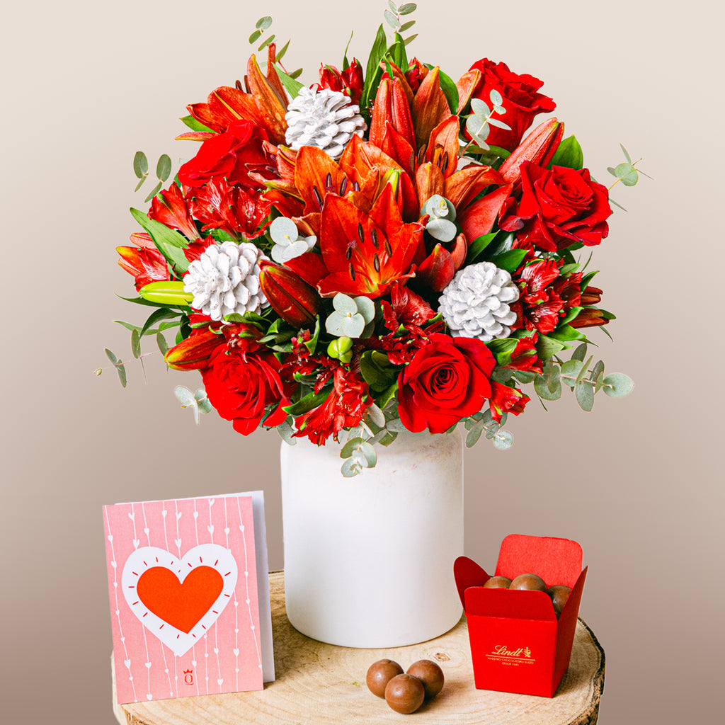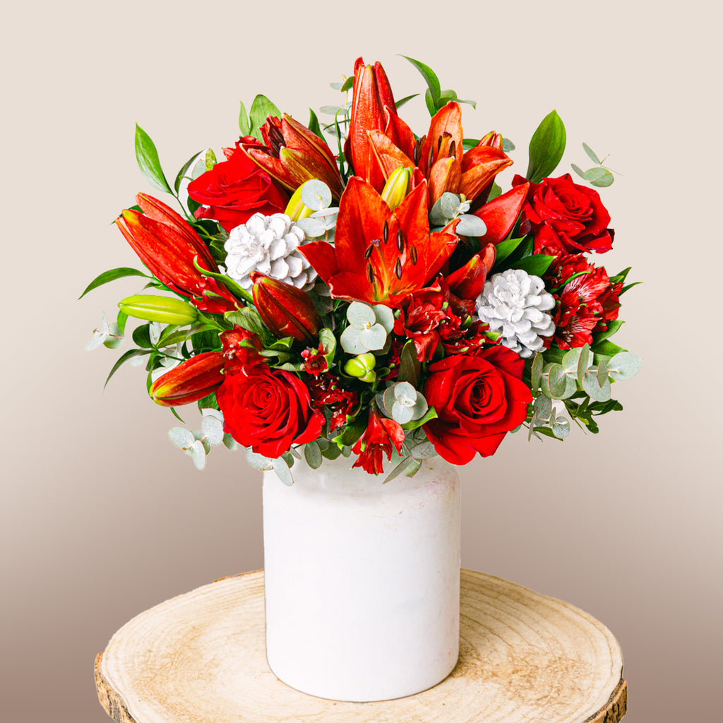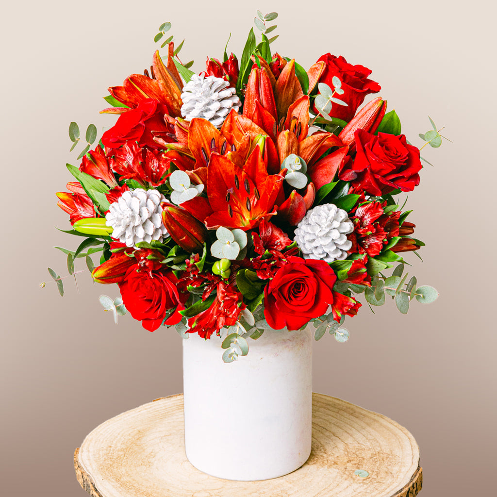 Bu zarif buket, uğurlu klasik renk olan kırmızıyı tam anlamıyla yansıtıyor. Zambaklar, güller ve alstroemerialar, çam kozalaklarının detaylarıyla tamamlanıyor ve bu buketi mükemmel bir Noel hediyesi haline getiriyor. Uzaktaki birine göndererek, kendisini evinde hissetmesini sağlayabilirsiniz.
