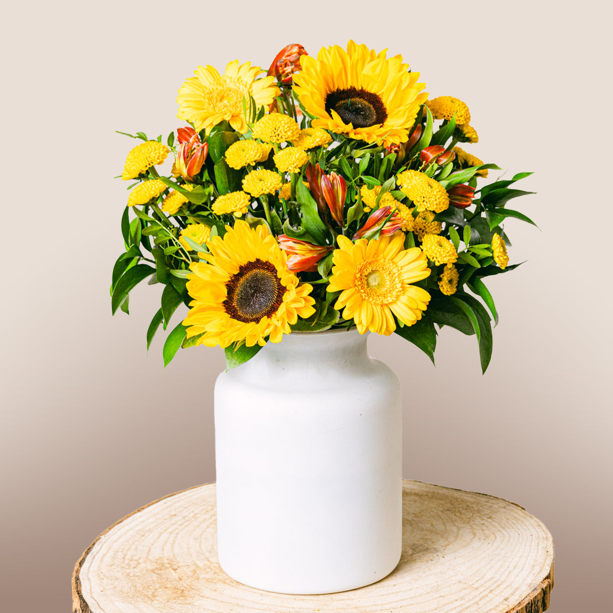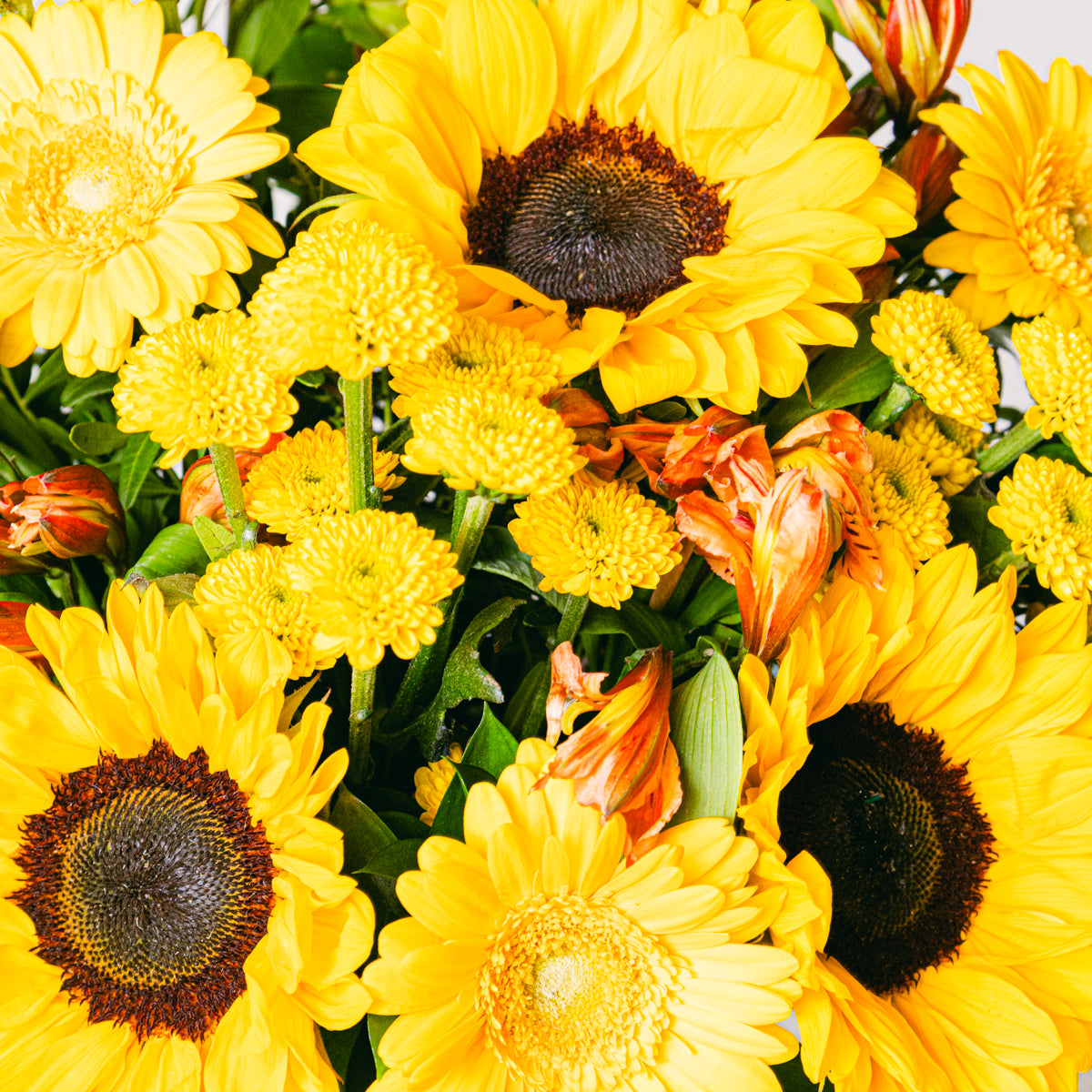 Ayçiçekleri, Turuncu Krizantemler, Turuncu Alstroemerialar, Mini Sarı Gerberalar