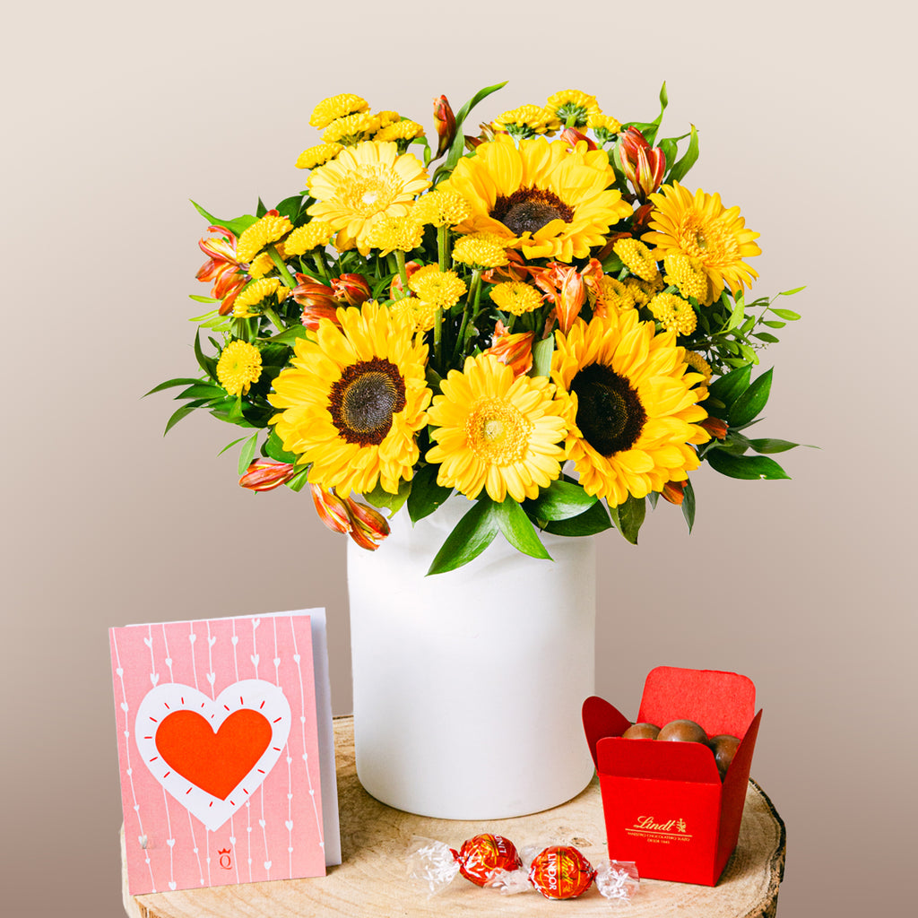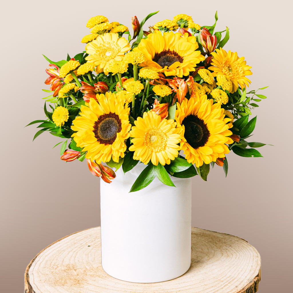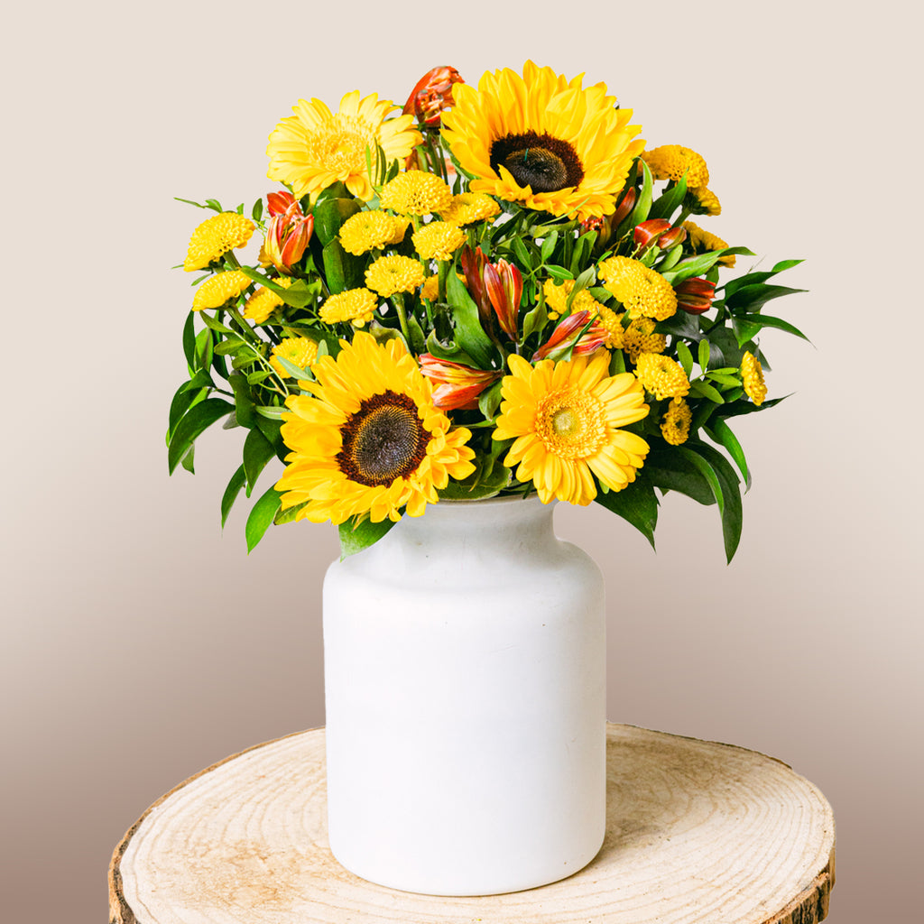 Ayçiçeklerinin neşesi ve turuncunun sıcaklığıyla dolu buket, pozitif enerji ve mutluluk yayar. İçten bir gülümseme ve aydınlık bir gün dileğiyle gönderin.