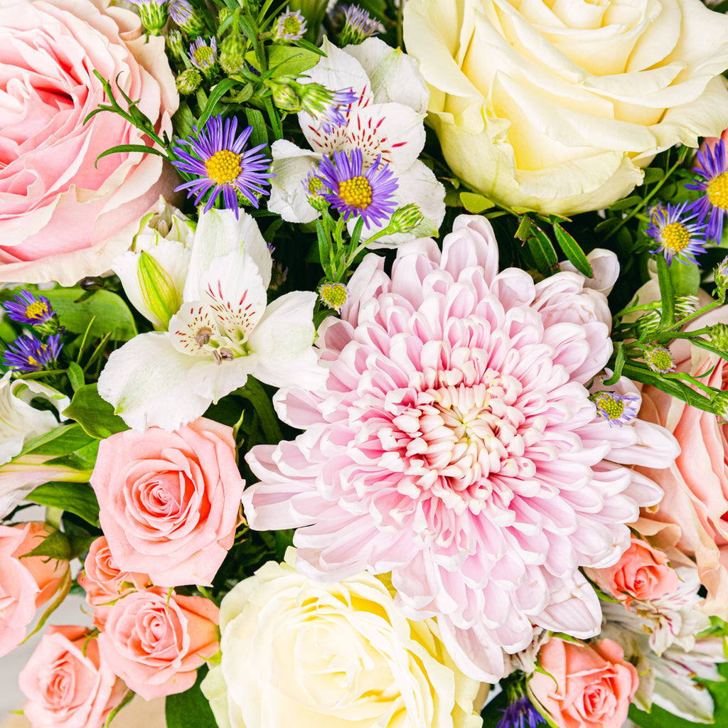 Bu zarif buket, sevgi, minnet ve saygıyı ifade etmenin mükemmel yoludur. Pembe anastasyaların, lila asterlerin ve beyaz güllerin uyumu, duygusal bir bağ kurmanıza yardımcı olur.